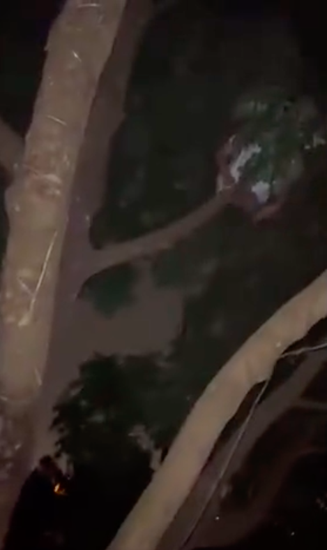 Sau cùng, người này cầm điện thoại soi lên tán cây phía đối diện ven đường thì thấy người mặc đồ trắng đang ngồi trên cành cây cao. Vì quá hoảng sợ, người chủ nhà không kịp định hình, bèn vứt bỏ cây gậy và chạy thục mạng vào nhà. Toàn bộ sự việc đã được camera an ninh ghi lại.