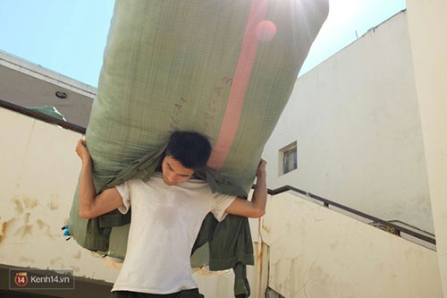 Lao động bốc vác ở chợ Đồng xuân ướt đẫm mồ hôi vì phải làm việc giữa trưa nắng. |