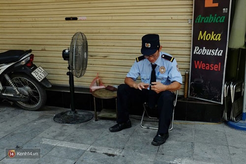 Bác bảo vệ ngồi giữa chiếc quạt lớn để giảm bớt cái nóng thiêu đốt. |