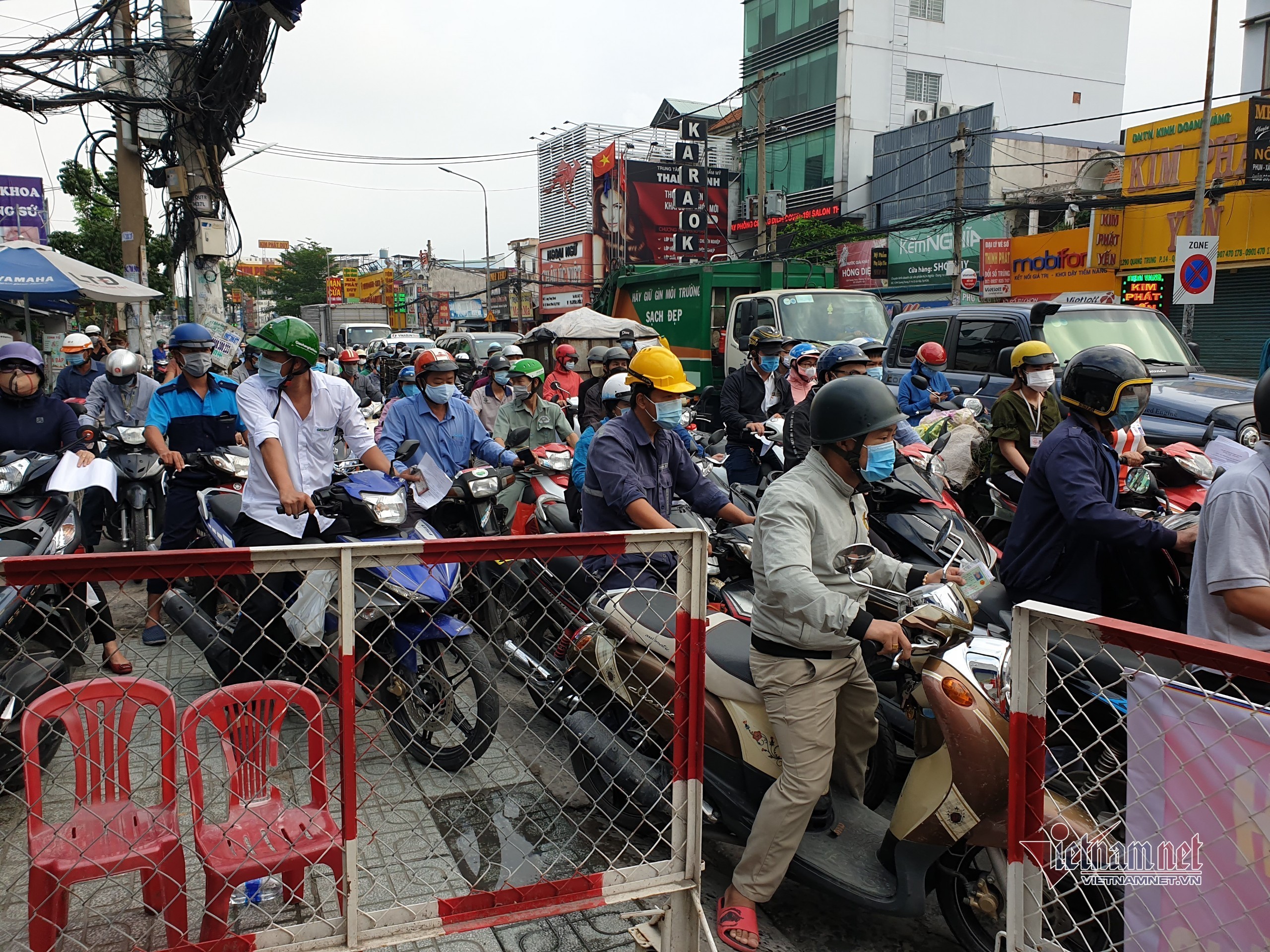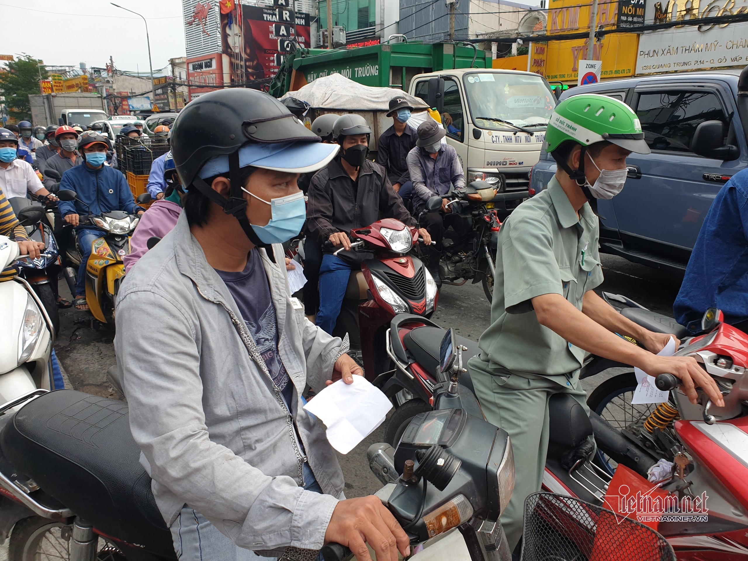Vào giờ cao điểm sáng, lượng người di chuyển ra vào quận Gò Vấp vẫn tăng cao dù chính quyền đã cảnh báo ‘địa phương đang là vùng dịch nguy hiểm, người dân nên hạn chế”.