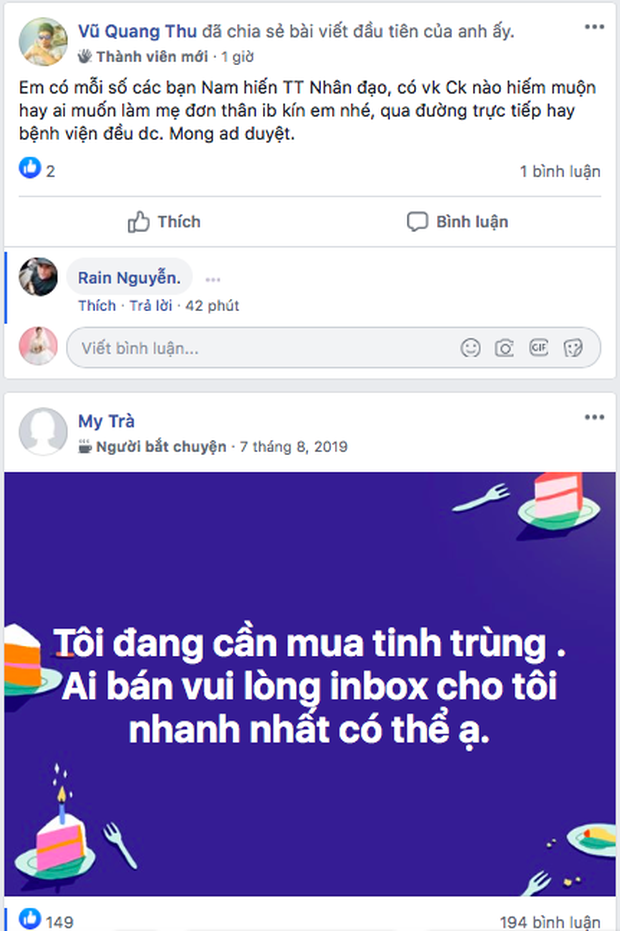 Facebook có tên Vũ Quang Thu rao: "Em có một số các bạn nam hiến tinh trùng nhân đạo, có vợ chồng nào hiếm muộn hay ai muốn làm mẹ đơn thân nhắn tin kín em nhé, qua đường trực tiếp hay bệnh viện đều được".
