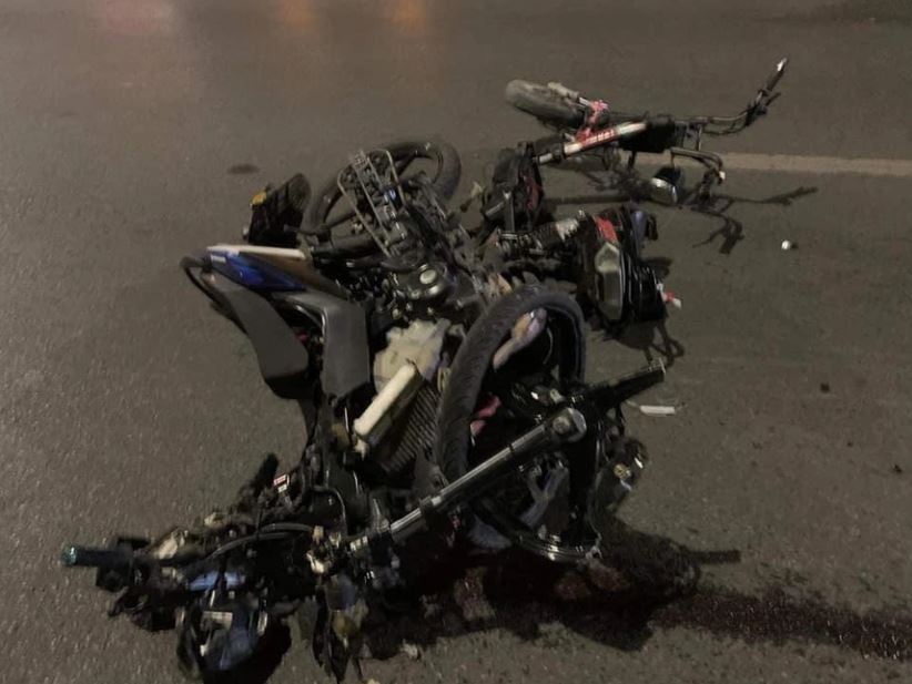 Ghi nhận của PV tại hiện trường, cả 2 phương tiện đều hư hỏng nặng, xe máy bị biến dạng phần đầu, gãy vành. Mảnh vỡ của hai chiếc xe văng khắp đường.