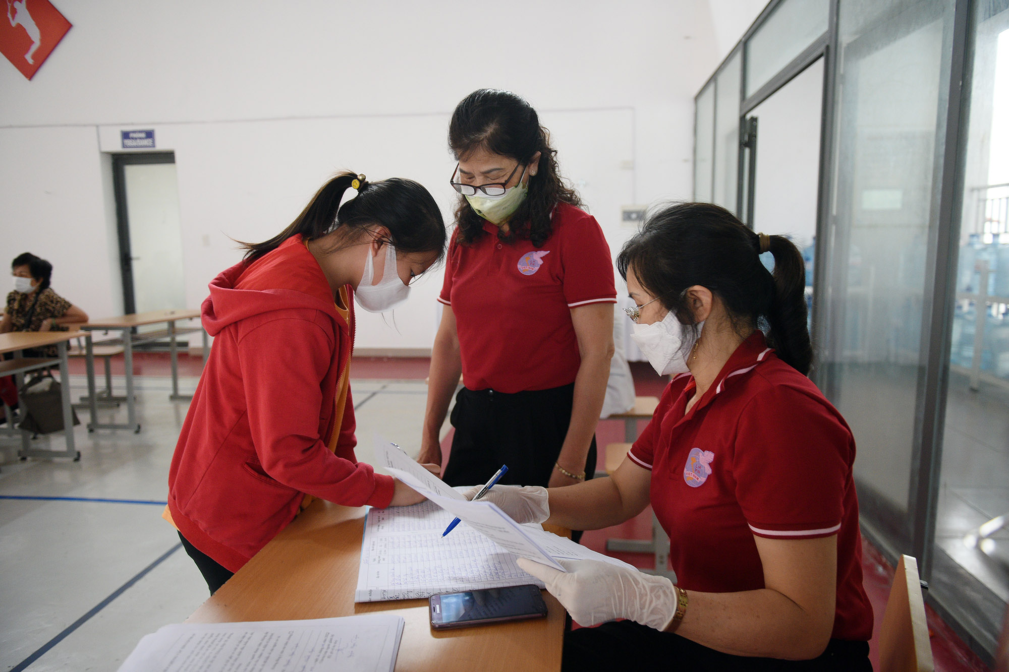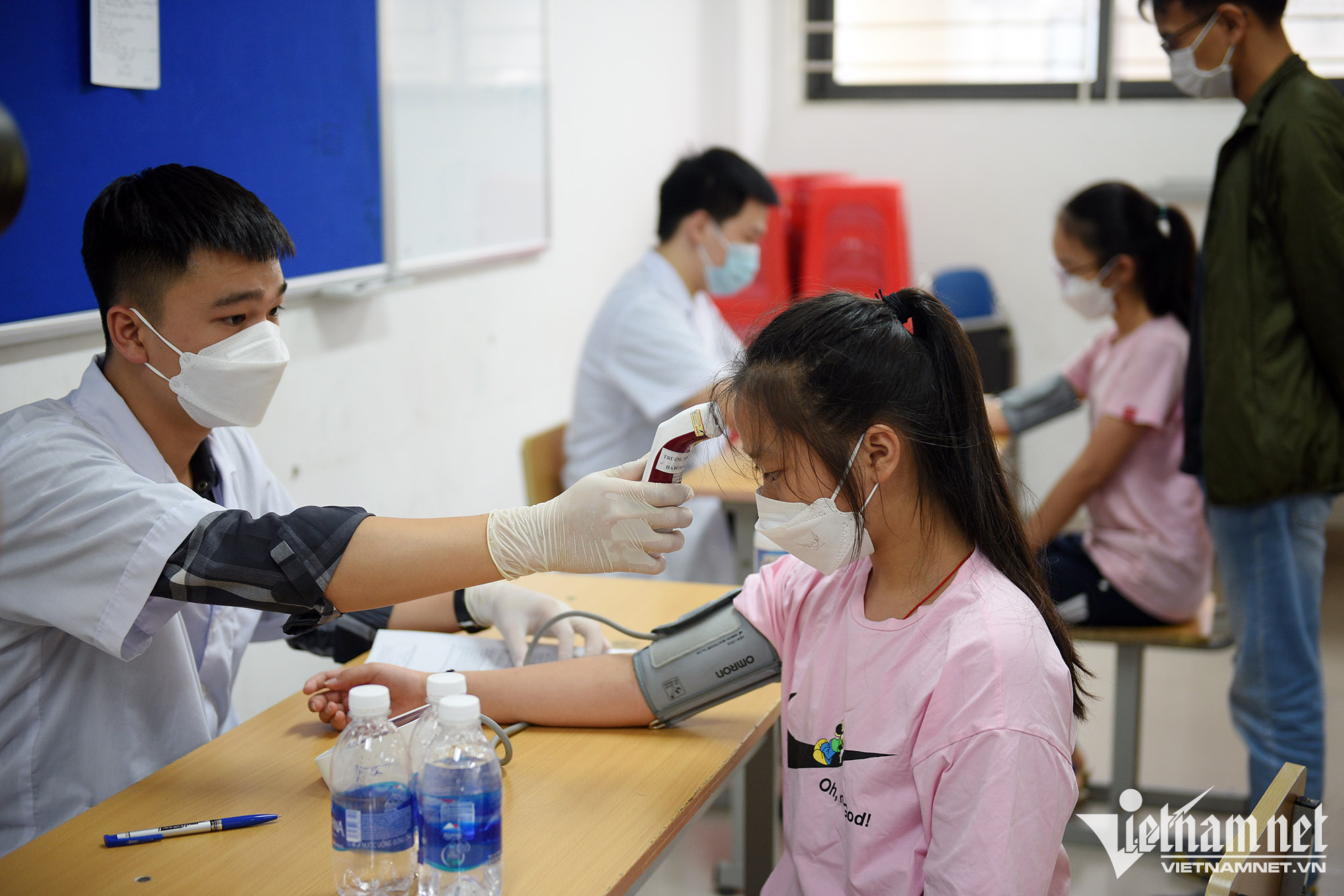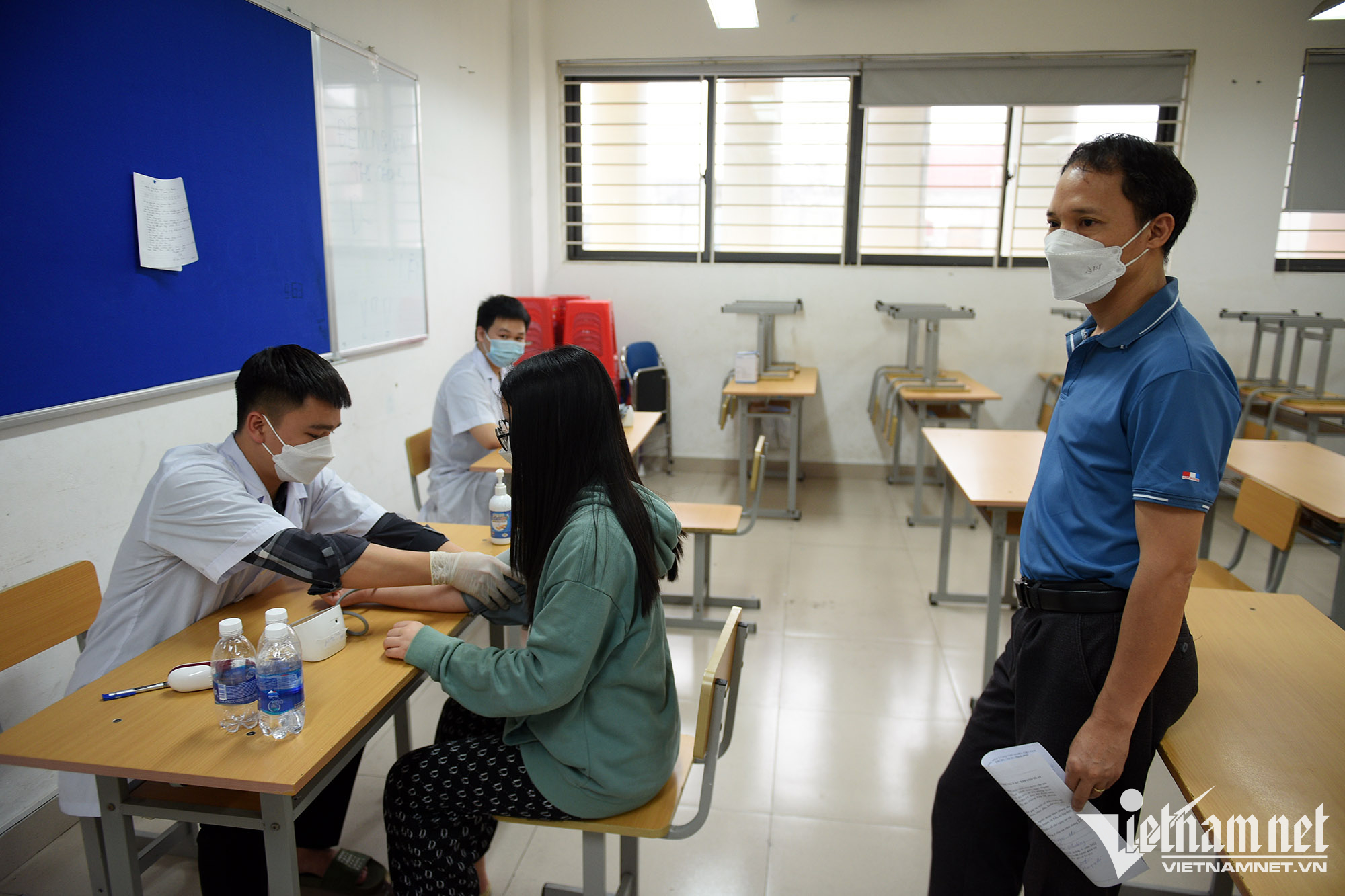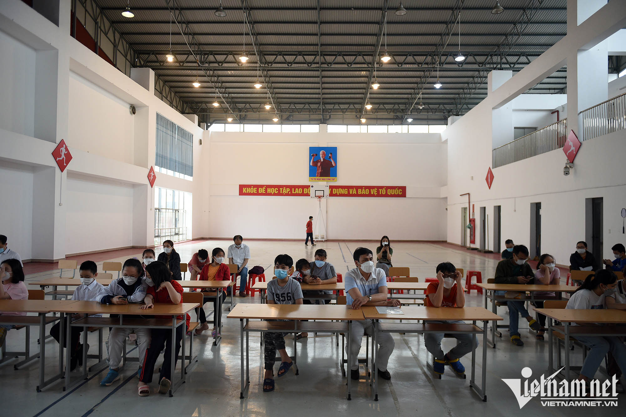 Ghi nhận tại trường THCS Lê Lợi, Hà Đông, Hà Nội, từ 14h chiều ngày 16/4, phụ huynh cùng học sinh đã đến trường làm thủ tục, khám lâm sàng cho con em mình vào tiêm vắc xin Covid-19.