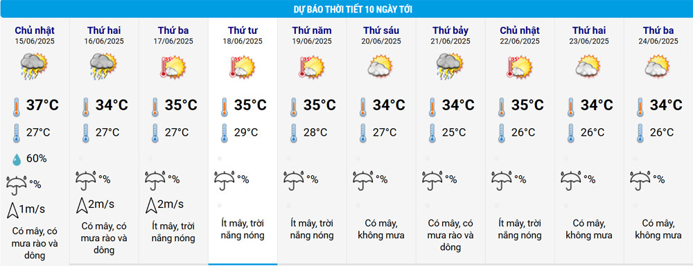 Theo bảng trên, thời tiết Hà Nội sẽ có nắng đến 37 độ trong ngày mai (15/6), nhưng kèm mưa giông; sau đó nhiệt hạ và nhiều ngày sau nắng nóng ở mức 35 độ.