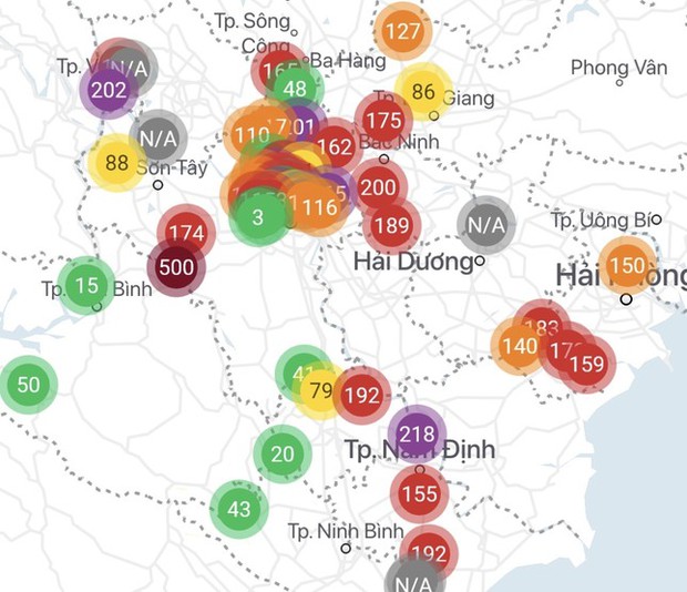 Một số điểm đo ghi nhận chất lượng không khí ở ngưỡng tím như tại Trung tâm Sao Mai (Thanh Xuân), Viện Hàn lâm Khoa học và Công nghệ Việt Nam (Cầu Giấy), thị trấn Đông Anh (Đông Anh), Trâu Quỳ (Gia Lâm).