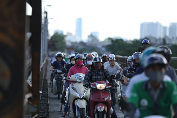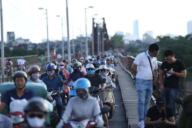 Từ 17h00, trên cầu Long Biên đã chật kín người dân đến xem trực vớt bom. Giao thông trreen cầu trở nên khó khăn để di chuyển.