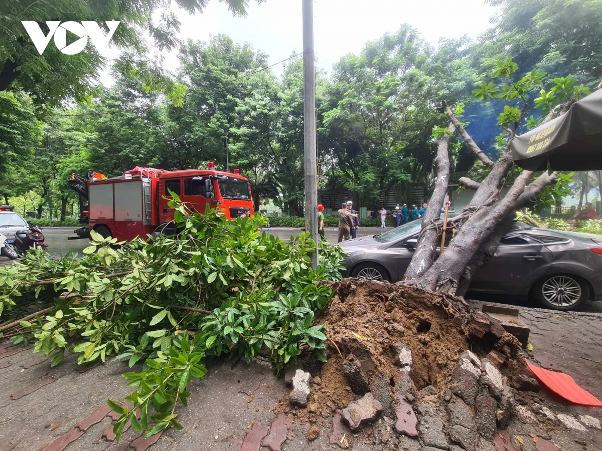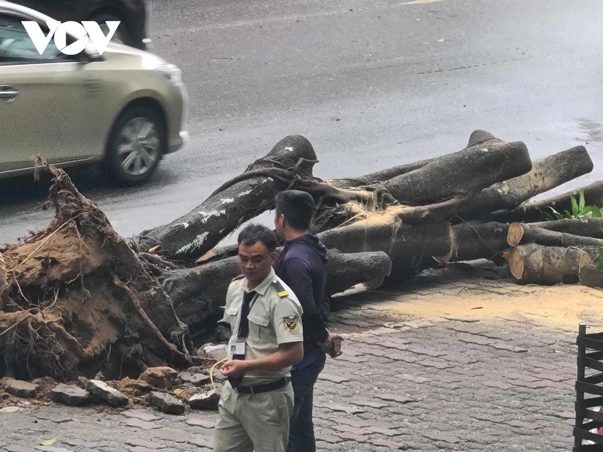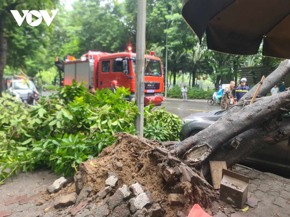 Bật gốc cây đa cổ thụ ở đường Hoàng Minh Giám (Hà Nội) đổ ngang đường làm một ô tô 5 chỗ bị bẹp dúm ở phần nóc, giao thông ùn tắc.