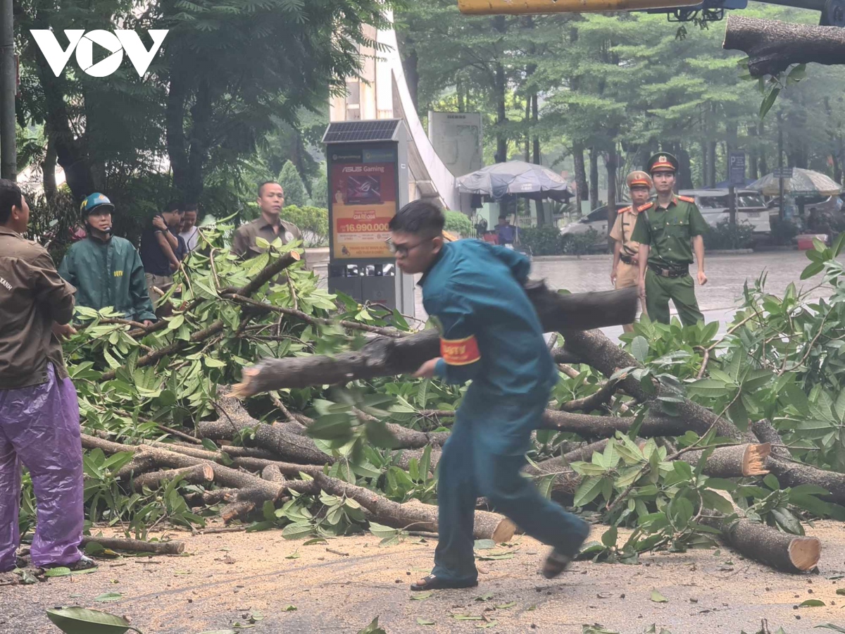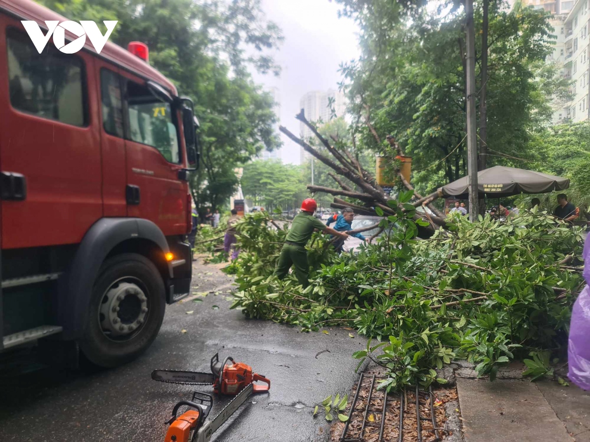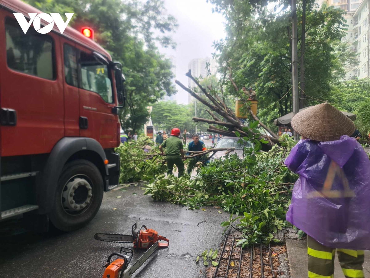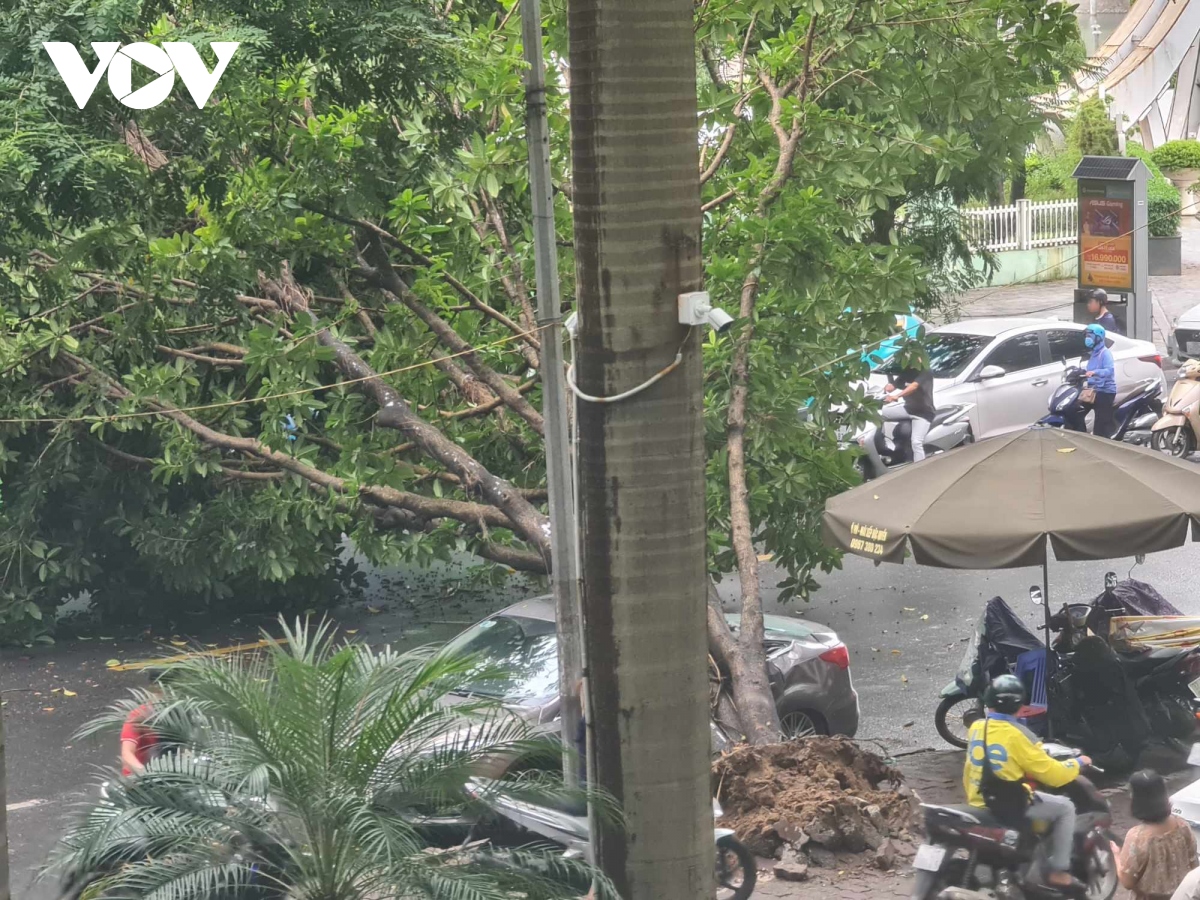 Bật gốc cây đa cổ thụ ở đường Hoàng Minh Giám (Hà Nội) đổ ngang đường làm một ô tô 5 chỗ bị bẹp dúm ở phần nóc, giao thông ùn tắc.
