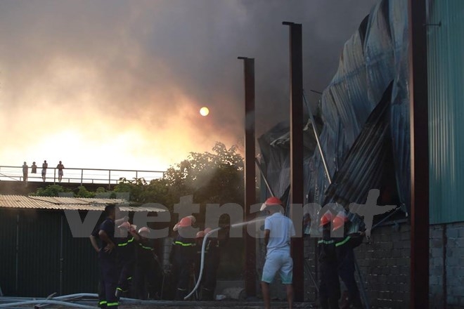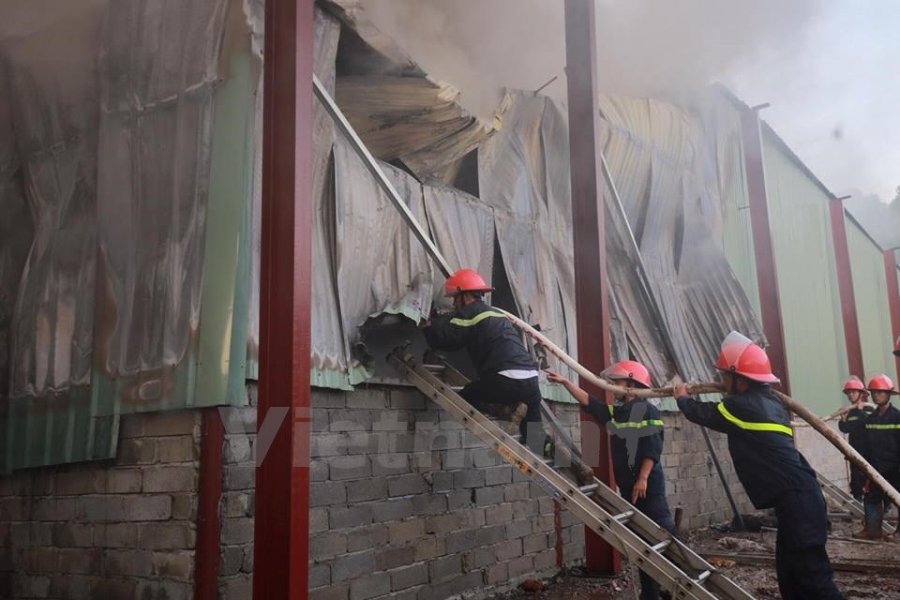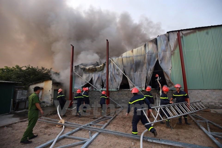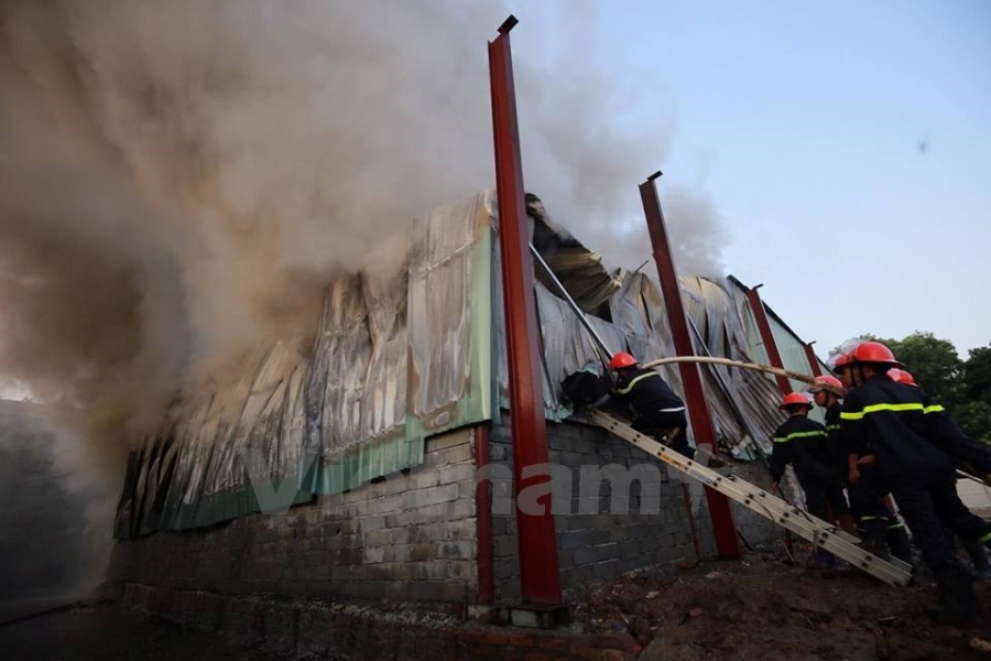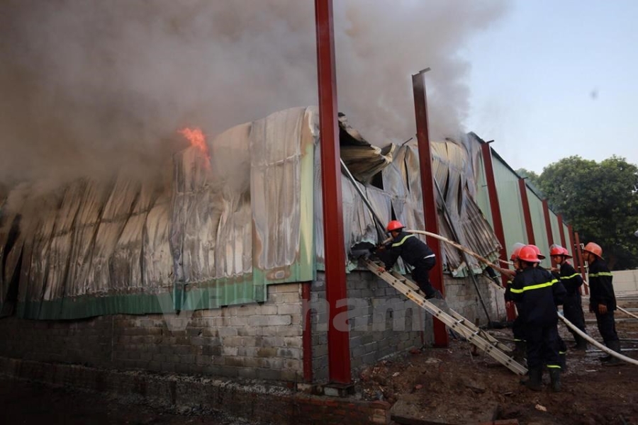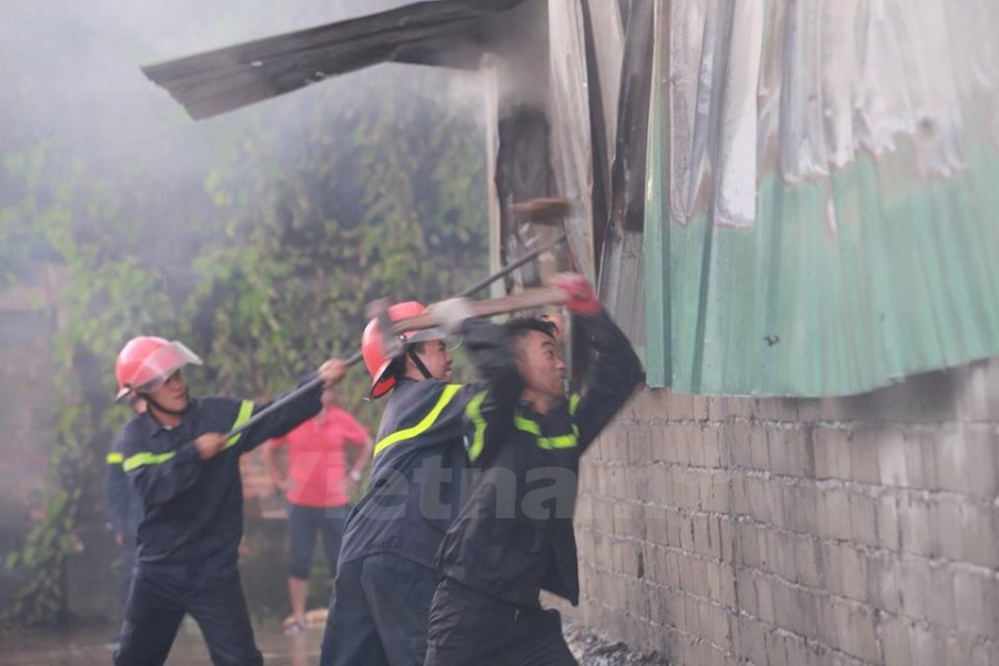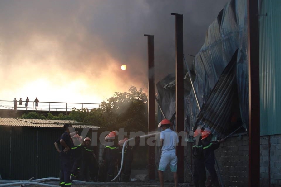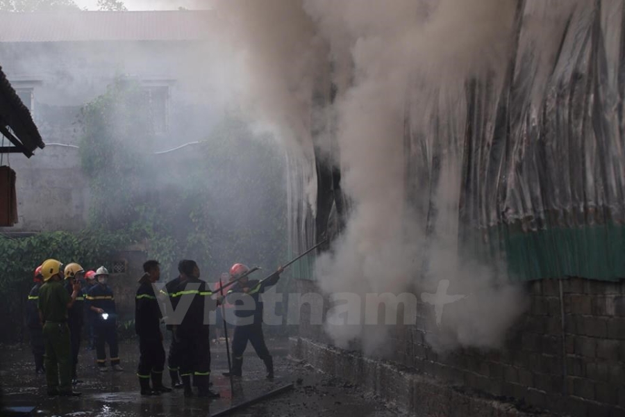 Theo PV có mặt tại hiện trường, địa điểm cháy là một khu xưởng chứa vải và giấy. (Ảnh: Minh Sơn/Vietnam+) |