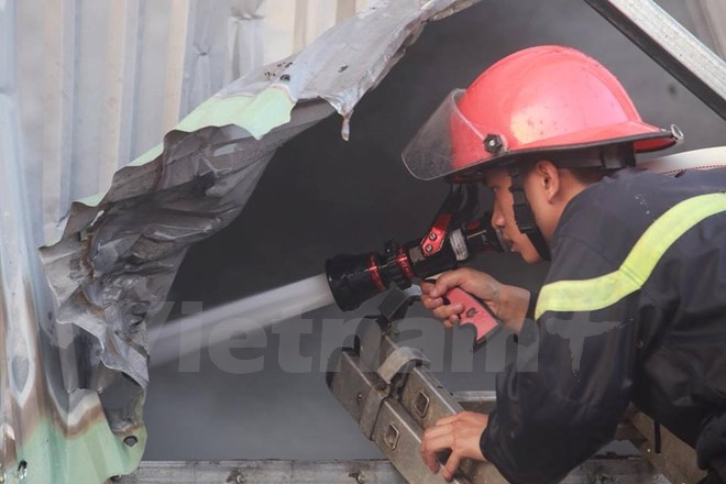 Lực lượng cảnh sát phòng cháy chữa cháy nỗ lực chiến đấu với ngọn lửa. (Ảnh: Minh Sơn/Vietnam+) |