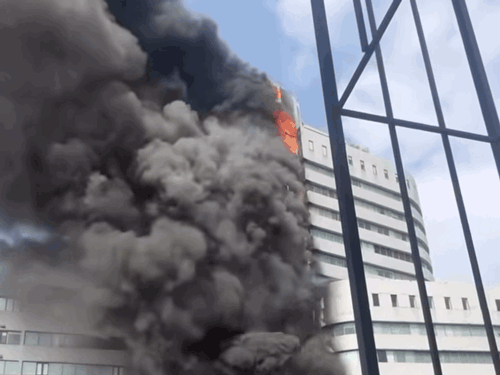 Ngọn lửa bắt đầu bùng lên từ cục nóng điều hòa gần chân tòa nhà. Lửa theo các tấm ốp và cục nóng điều hòa lan lên các tầng. Khói lửa bốc lên ngùn ngụt, bao trùm cả khu vực.