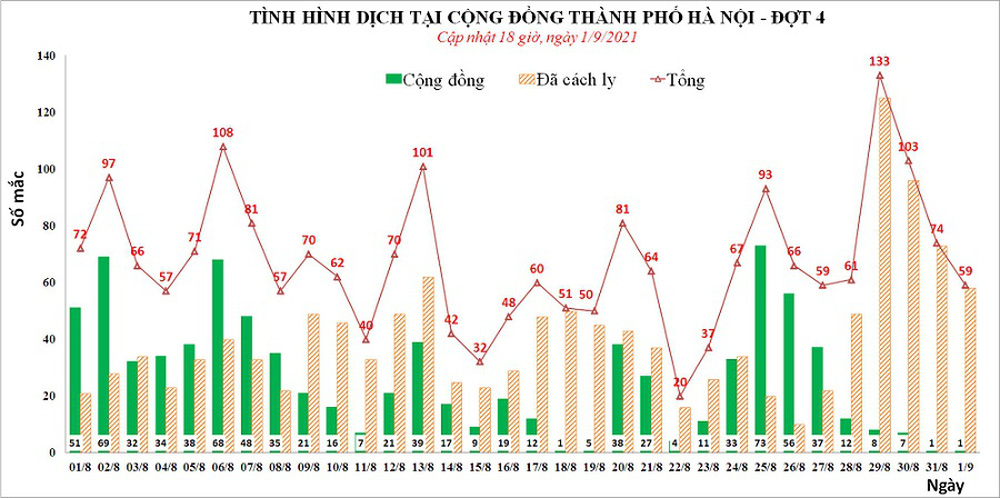 Trung tâm kiểm soát bệnh tật (CDC) Hà Nội cho biết, trong ngày 1/9, Hà Nội ghi nhận tổng cộng 59 ca, trong đó, có 31 ca khu cách ly, 27 ca tại khu vực phong tỏa và 1 ca tại cộng đồng.
