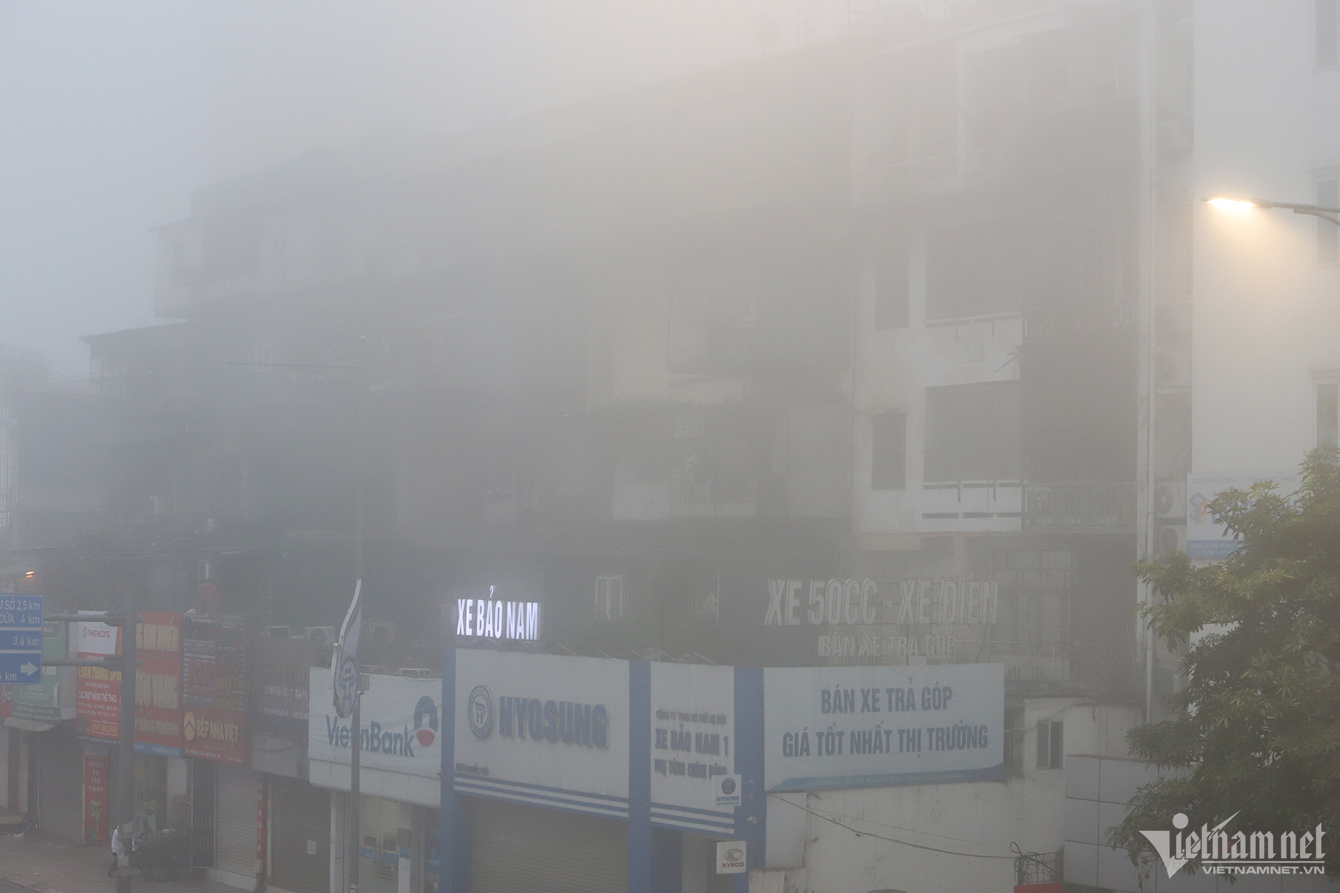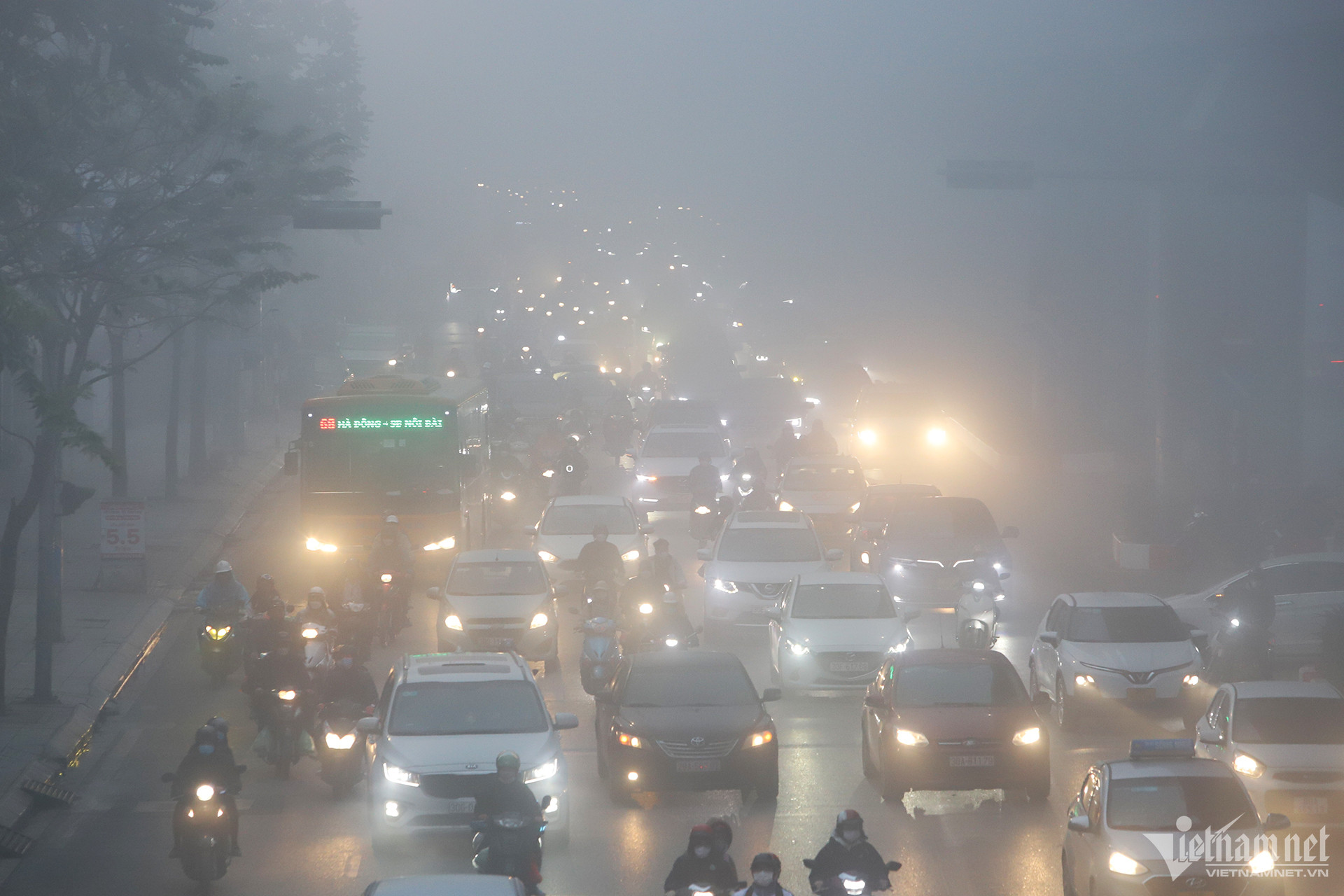 6h30 ngày 2/2, lớp sương mù dày đặc bao phủ khu vực nội thành Hà Nội khiến tầm nhìn giảm xuống đáng kể. Nhiều người tham gia giao thông đã phải bật đèn pha để dễ quan sát.