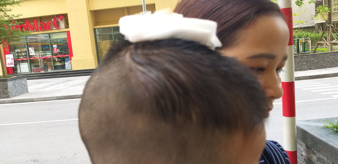 "Khi rơi xuống, cán chổi đập vào đỉnh đầu cháu tôi gây chảy máu nhiều. Thấy vậy tôi hốt hoảng hô mọi người đến ứng cứu và đưa vào quầy thuốc nhờ sơ cứu”, bà D kể lại.