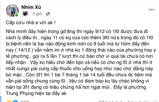 Điều khiến người phụ nữ này lo lắng, lên mạng cầu cứu là vì trong 3 F0 hiện đang ở cùng nhà có một bé 9 tuổi là con chị bị bại não, động kinh.