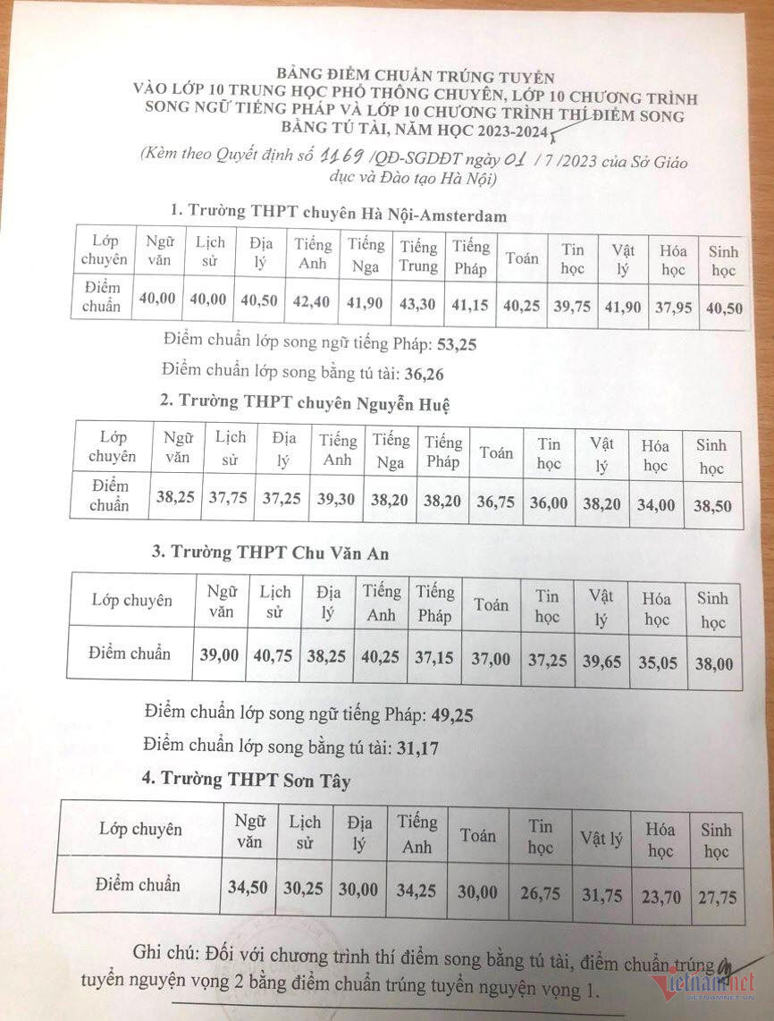 Dưới đây là điểm chuẩn vào các lớp 10 chuyên của Hà Nội năm 2023: