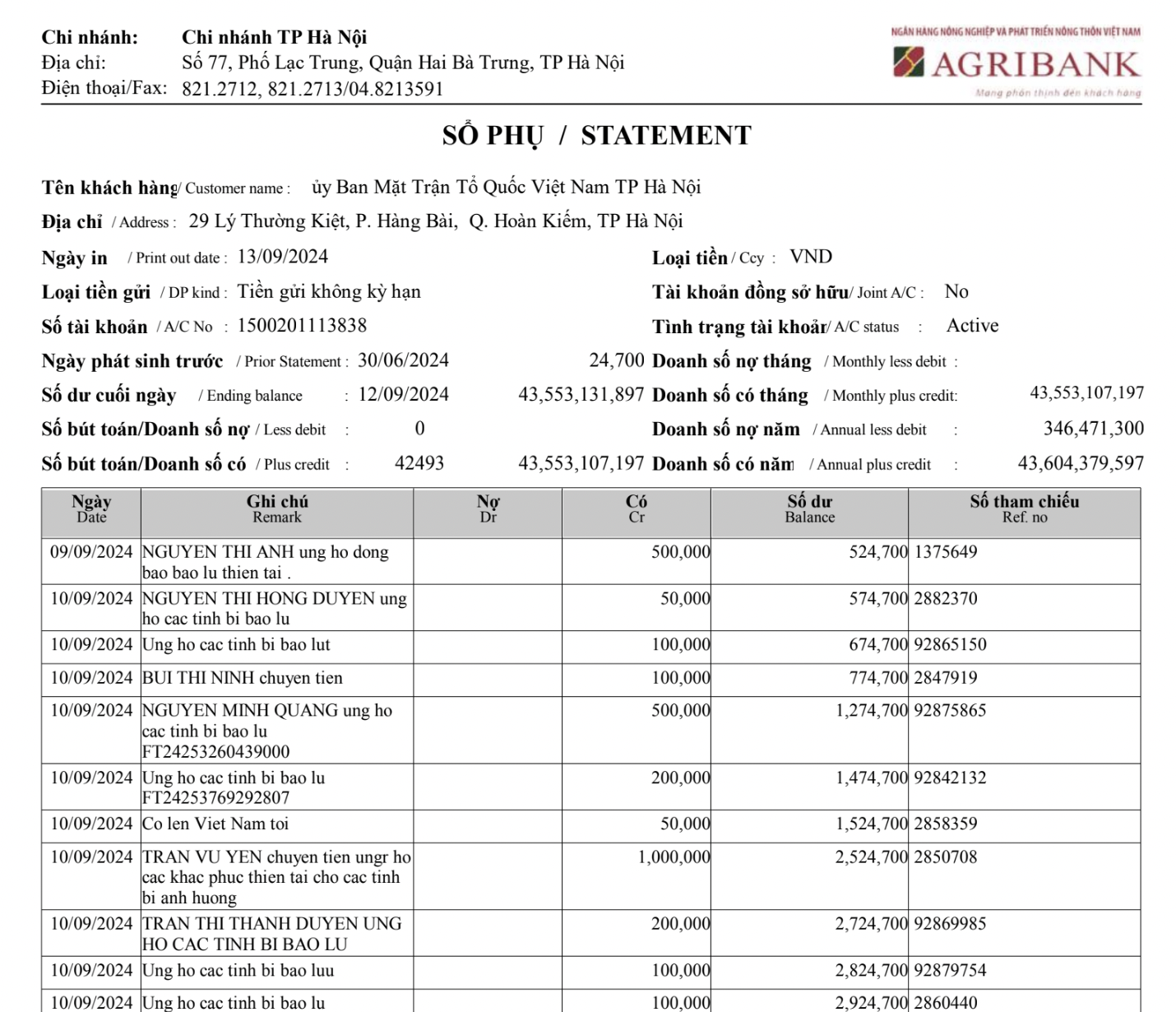 Trang fanpage và Trang Wesite của Uỷ ban MTTQ Việt Nam TP Hà Nội Hà Nội đã công khai hơn 1.700 trang thông tin sao kê danh sách các đơn vị, tổ chức, cá nhân ủng hộ nhân dân các tỉnh, thành phố bị ảnh hưởng bởi bão số 3, từ những giao dịch vài nghìn đồng đến hàng trăm triệu, hàng tỷ đồng. Danh sách được thống kê chi tiết về ngày chuyển tiền, số tiền chuyển cũng như nội dung giao dịch của người dân, tổ chức, doanh nghiệp. Danh sách ủng hộ sẽ tiếp tục được MTTQ Việt Nam thành phố Hà Nội cập nhật, công khai sao kê hàng ngày.