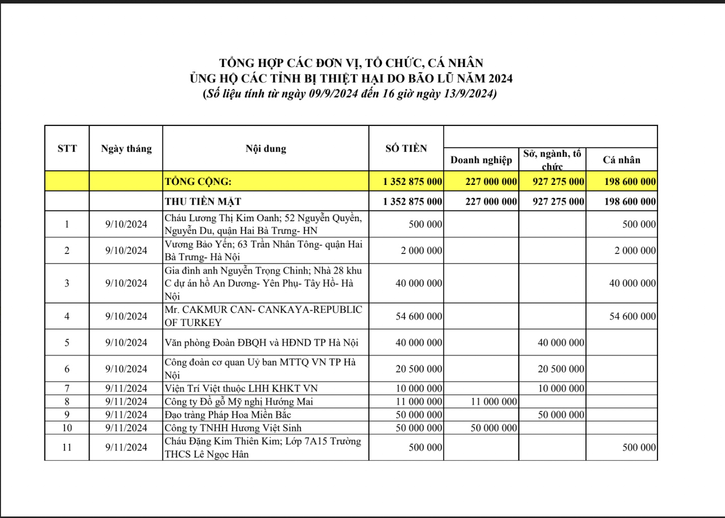 Theo thông tin từ Ủy ban Mặt trận Tổ quốc (MTTQ) Việt Nam thành phố Hà Nội, hưởng ứng lời kêu gọi của Ủy ban MTTQ Việt Nam thành phố Hà Nội, đến nay đã có rất nhiều cơ quan, doanh nghiệp, tổ chức, cá nhân ở trong và ngoài nước đăng ký và ủng hộ người dân các tỉnh, thành phố bị ảnh hưởng bởi cơn bão số 3. Trong ngày 13/9, Ủy ban MTTQ Việt Nam thành phố đã tiếp nhận ủng hộ tổng số tiền hơn 1,7 tỷ đồng. (Cụ thể danh sách)