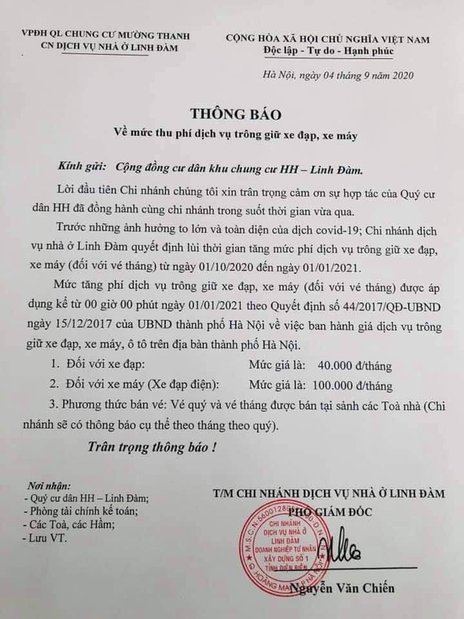 Ngày 4-9 vừa qua, cư dân tại khu tổ hợp chung cư HH Linh Đàm (quận Hoàng Mai, Hà Nội) nhận được thông báo từ chủ đầu tư về việc thay đôi mức thu phí dịch vụ trông giữ xe đạp, xe máy. Theo đó, mức phí theo tháng mới (40.000 đồng với xe đạp, 100.000 đồng với xe máy) sẽ được áp dụng từ ngày 1-1-2021 (trước đó dự kiến áp dụng từ 1-10-2020).