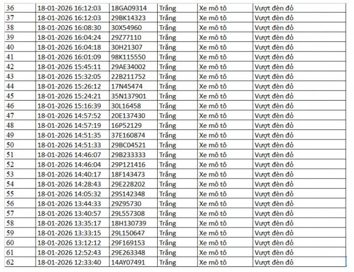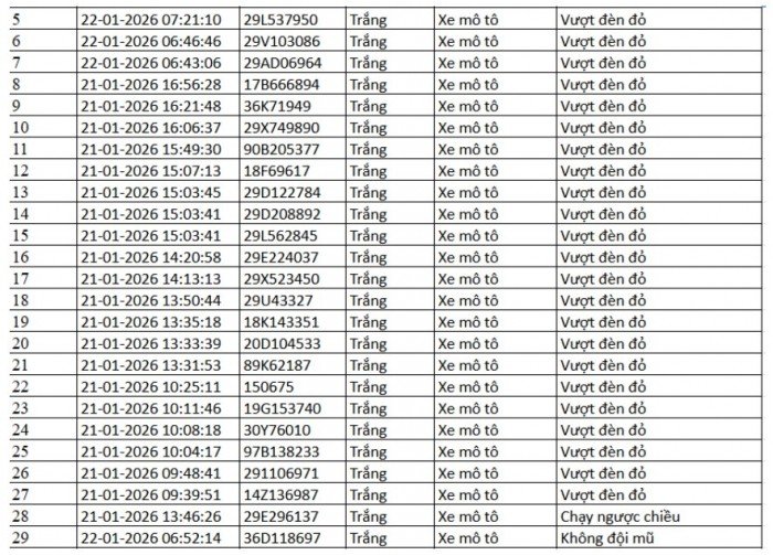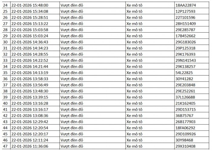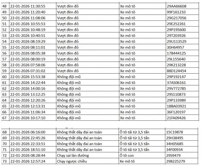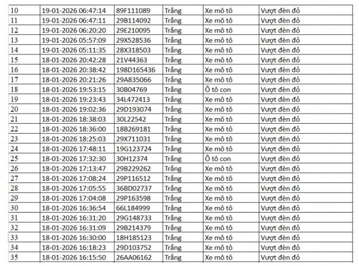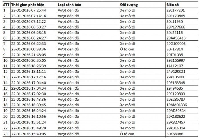 Danh sách vi phạm được trích xuất từ hệ thống camera ở Hà Nội trong các ngày từ 18/01 đến 23/01/2026 cho thấy số lượng vi phạm tập trung vào việc vượt đèn đỏ, chạy quá tốc độ quy định… Trong đó nhiều trường hợp bị ghi nhận lập biên bản mà chủ phương tiện chưa nộp phạt hành chính.