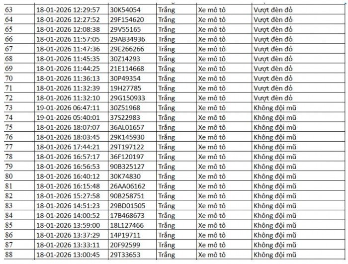 Từ 12h00’ ngày 18/1/2026 đến 12h00’ ngày 19/1/2026, đã phát hiện 88 trường hợp xe máy vi phạm.