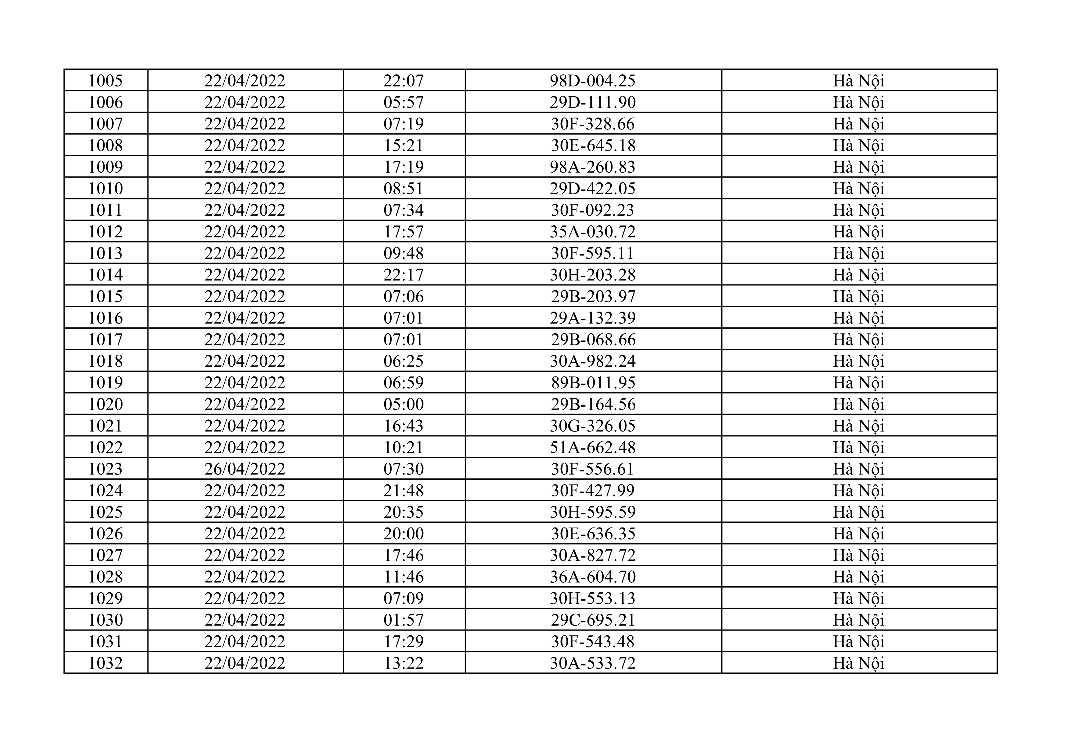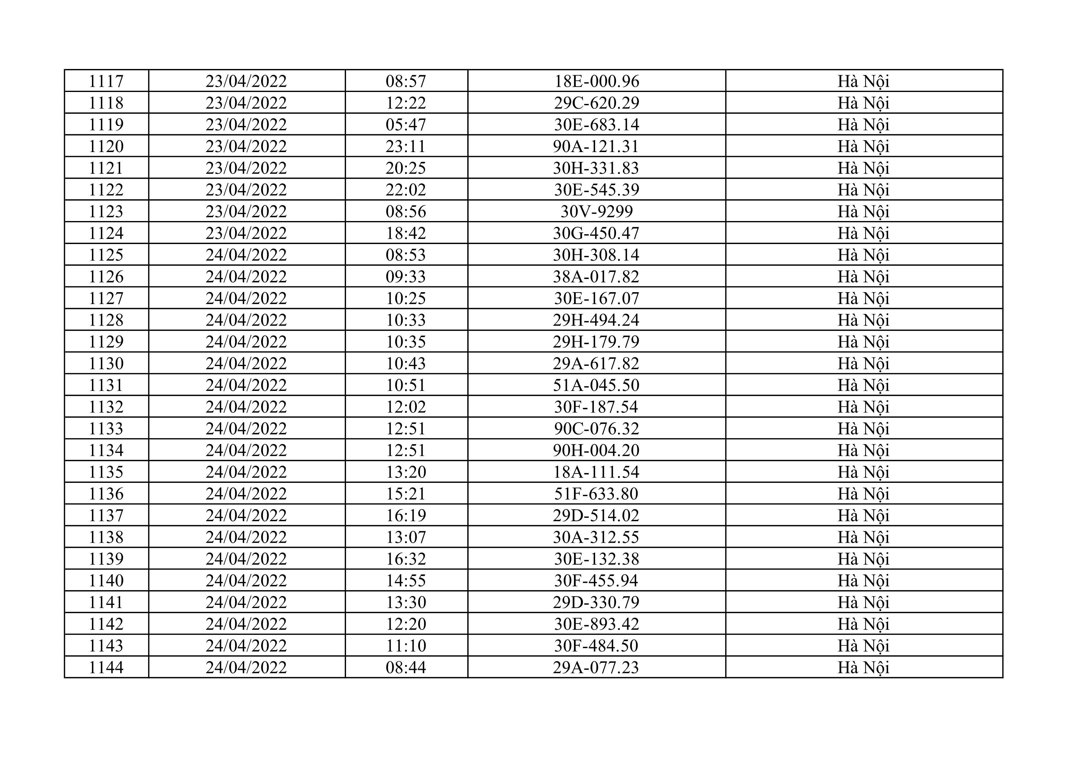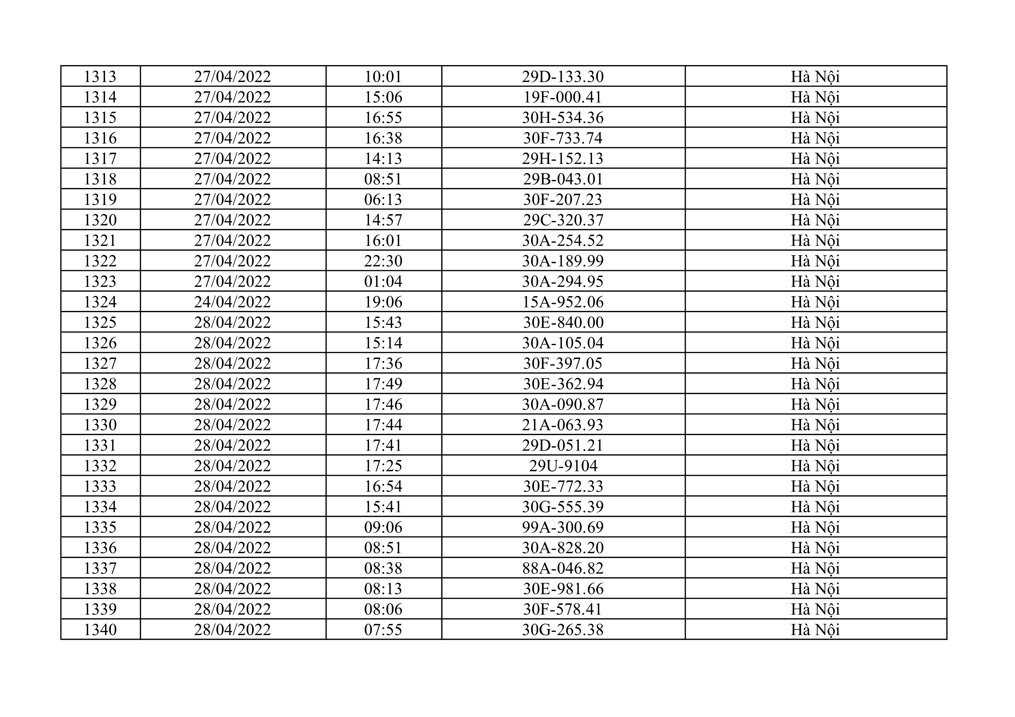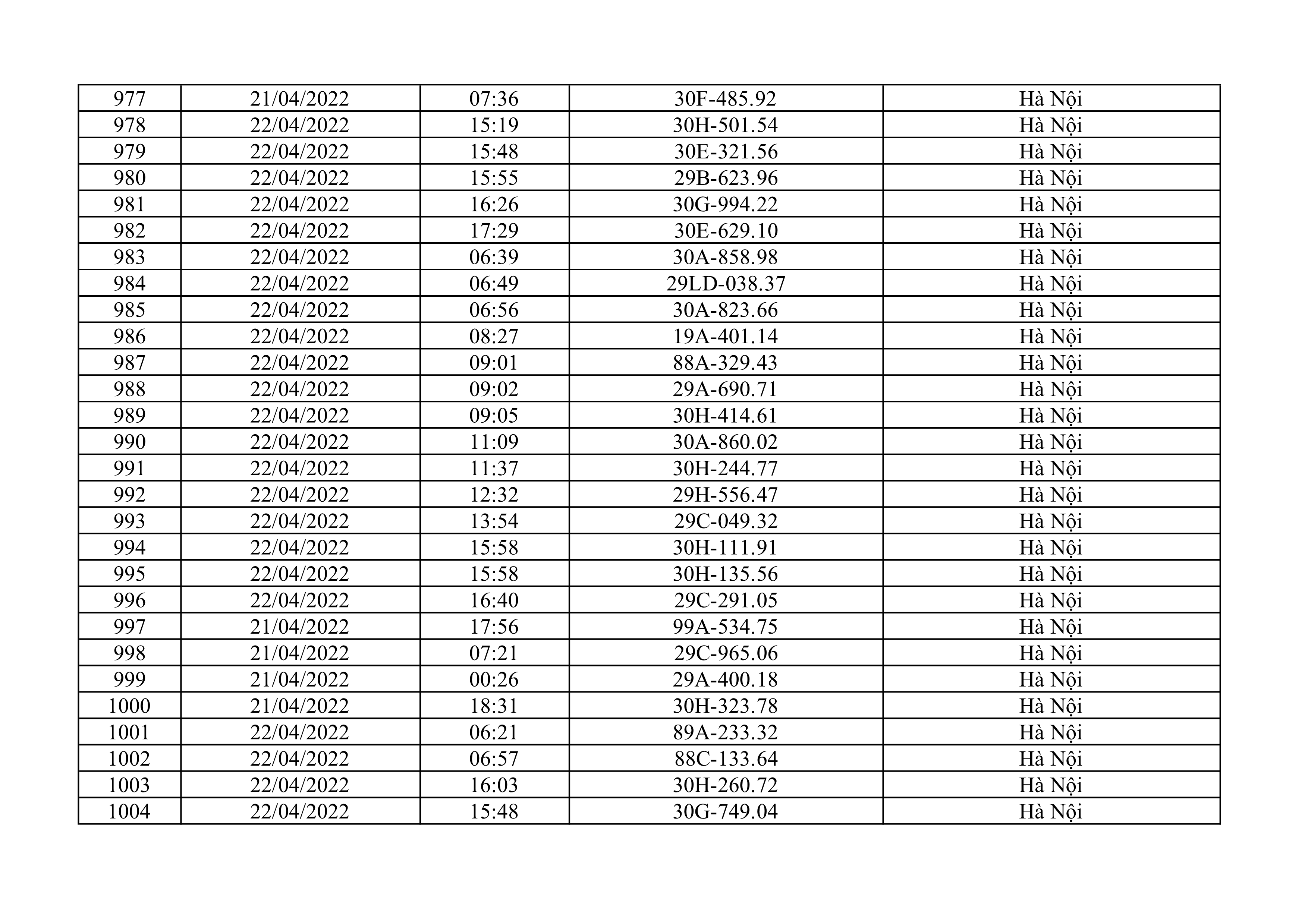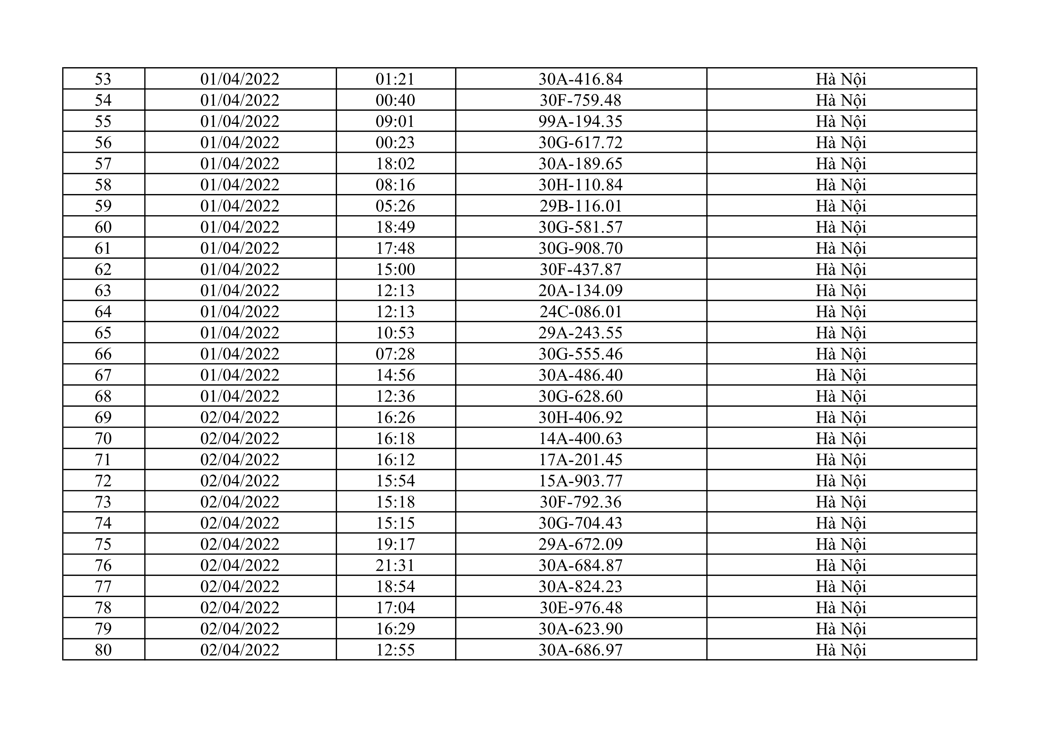 Dưới đây là danh sách ô tô bị phạt nguội từ ngày 1/4/2022 đến ngày 30/4/2022 tại TP Hà Nội.