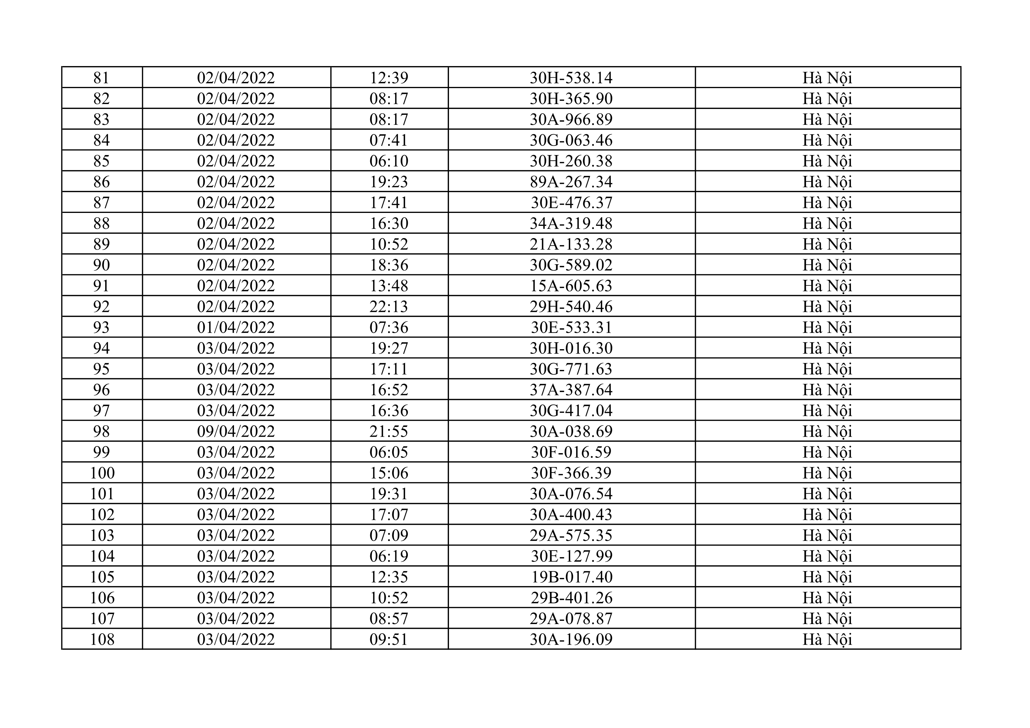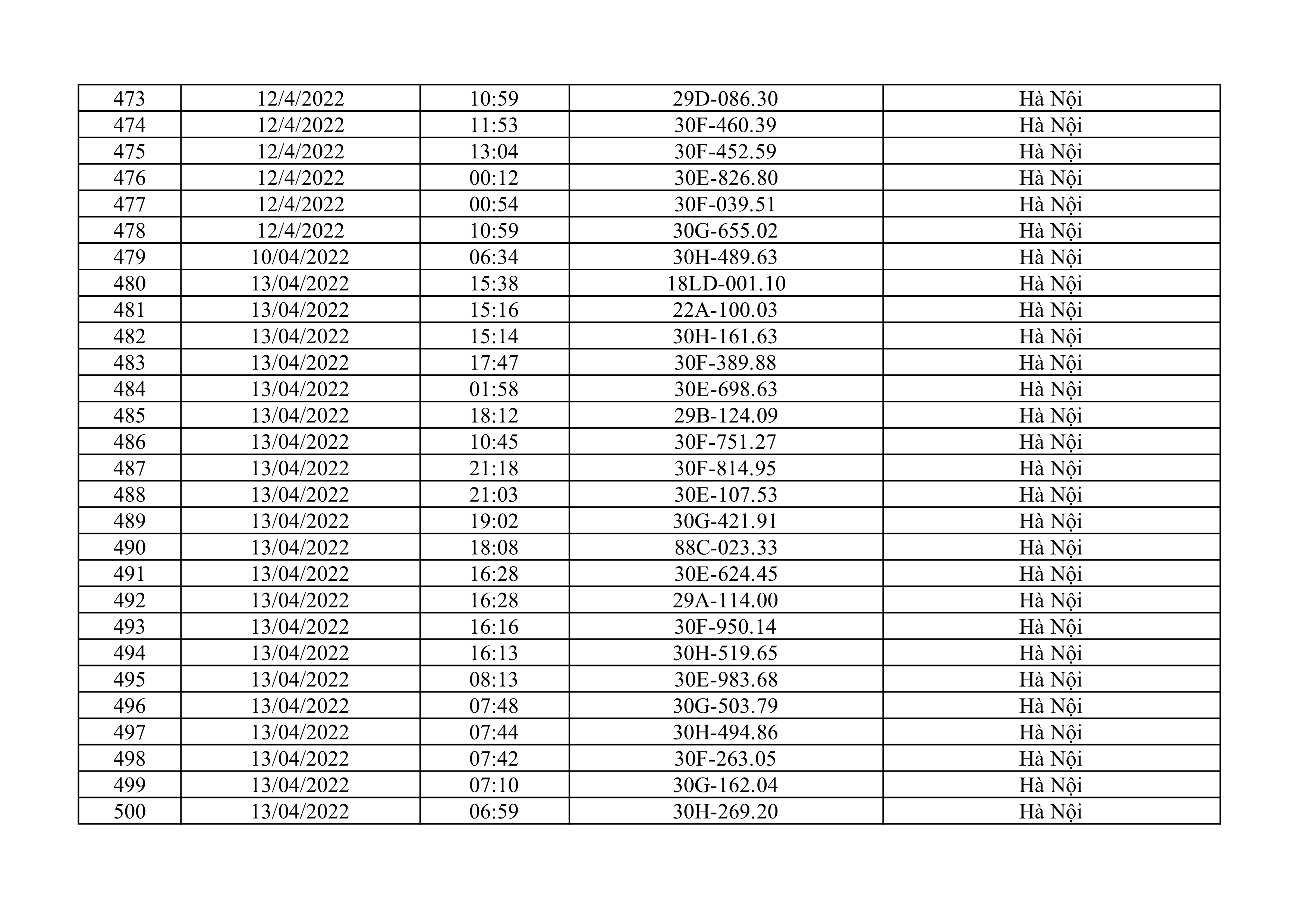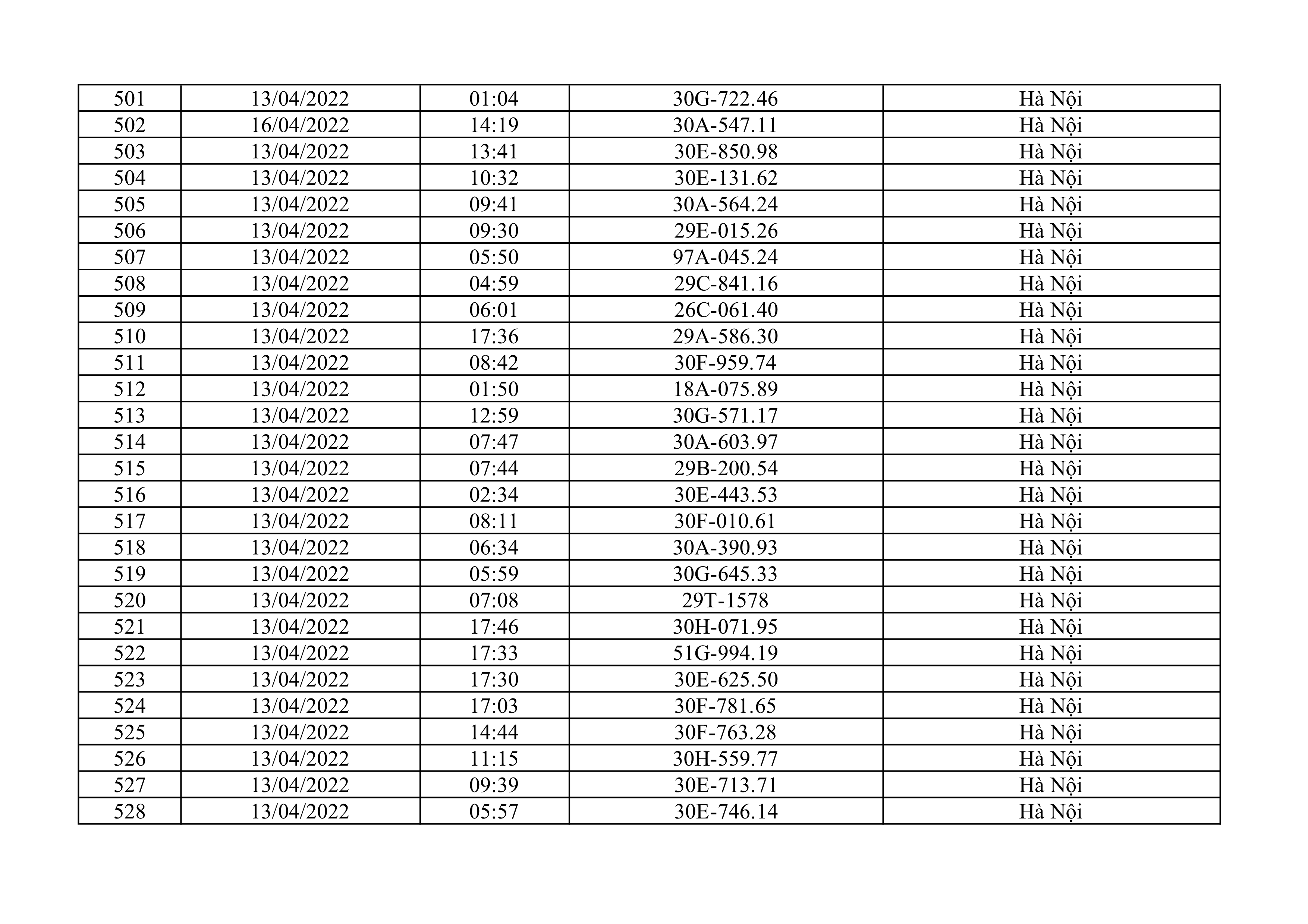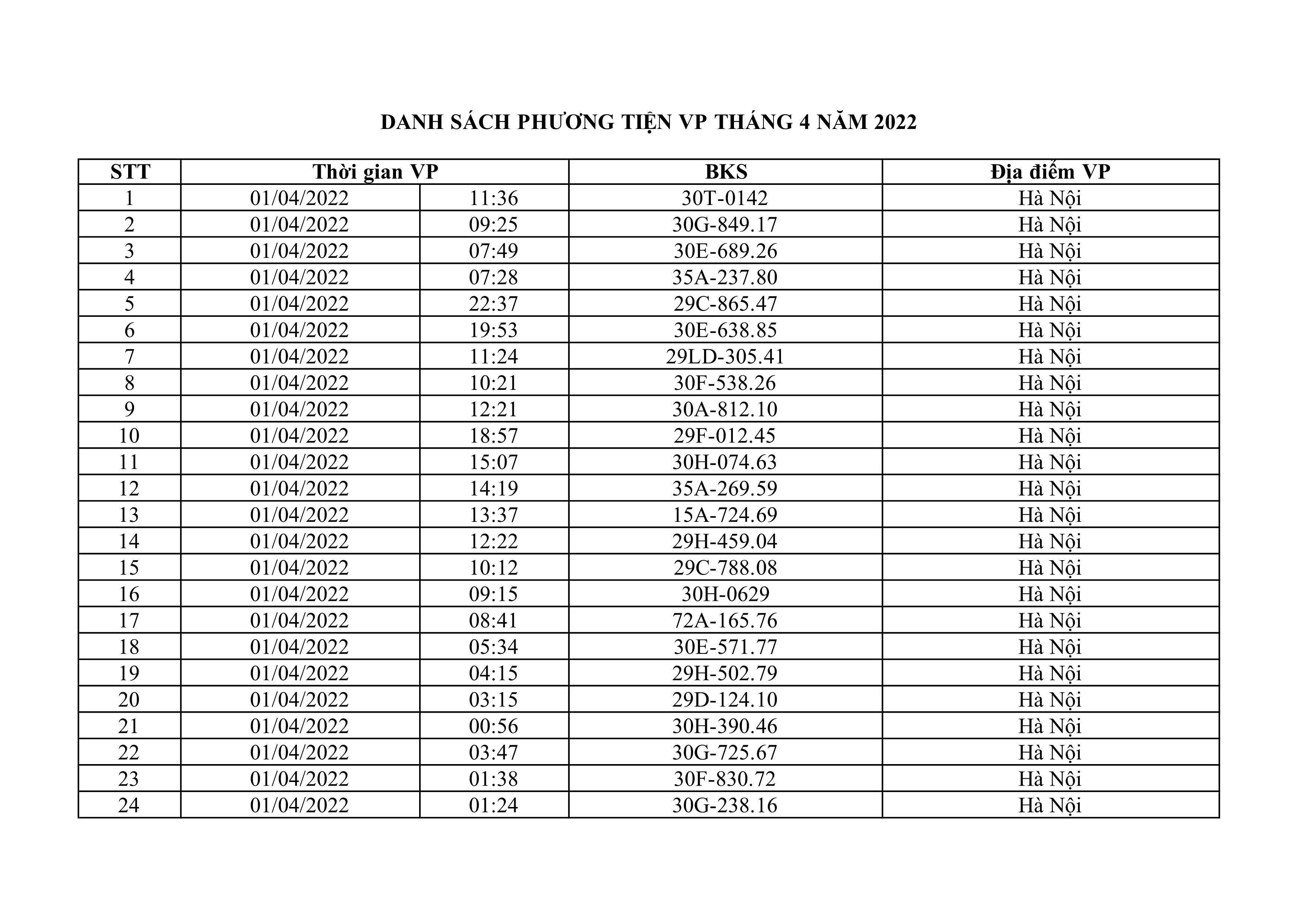 Dưới đây là danh sách ô tô bị phạt nguội từ ngày 1/4/2022 đến ngày 30/4/2022 tại TP Hà Nội.