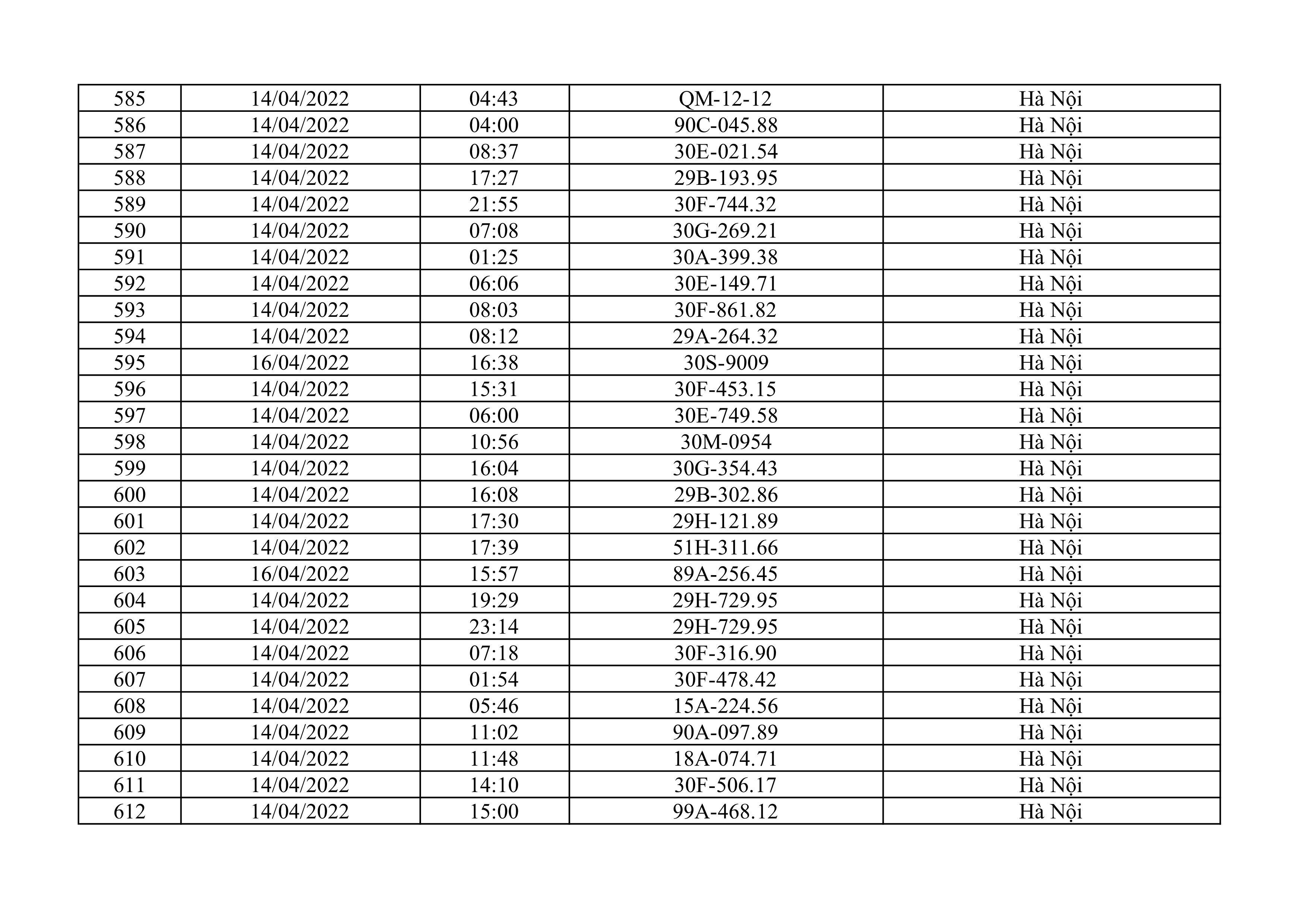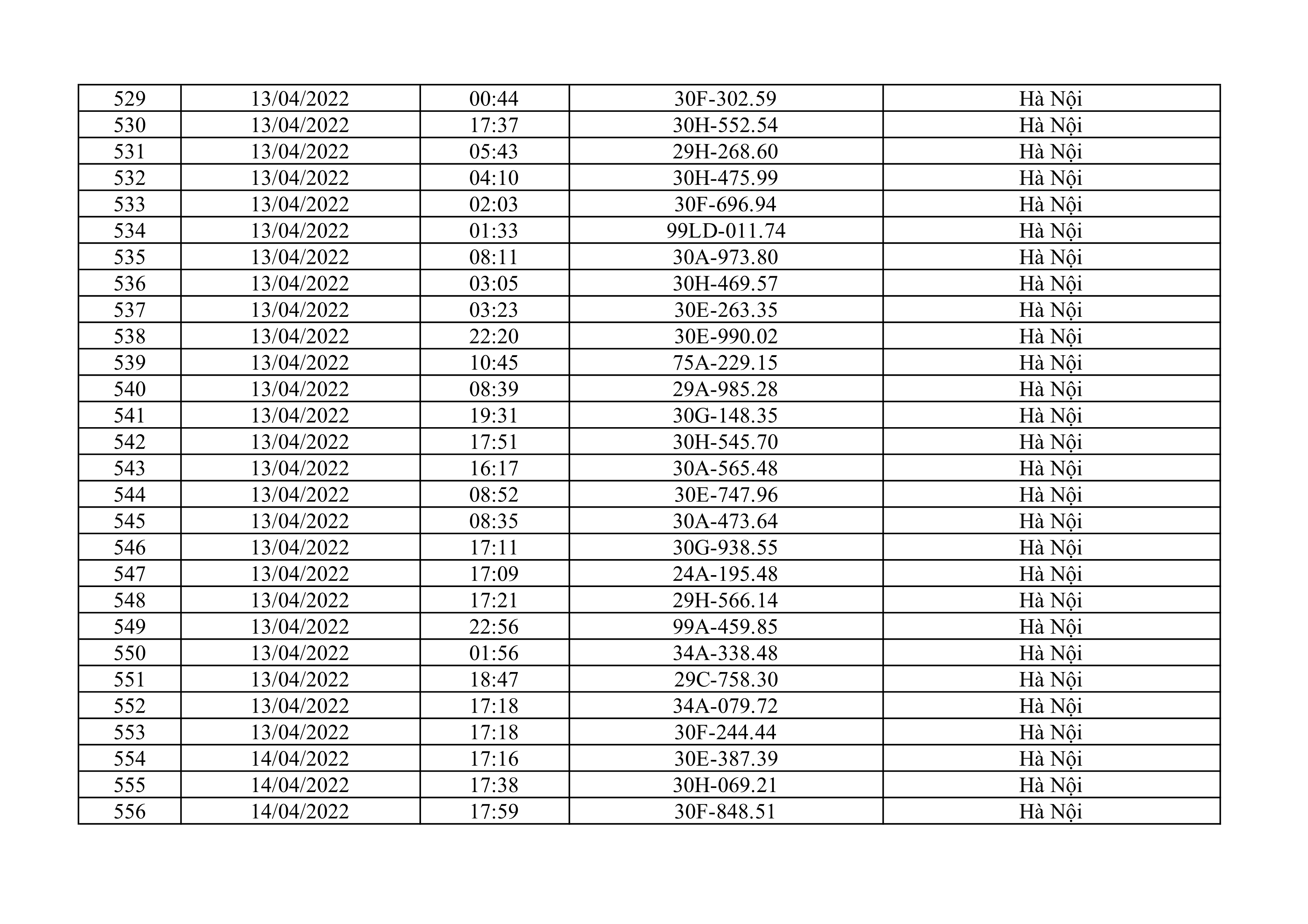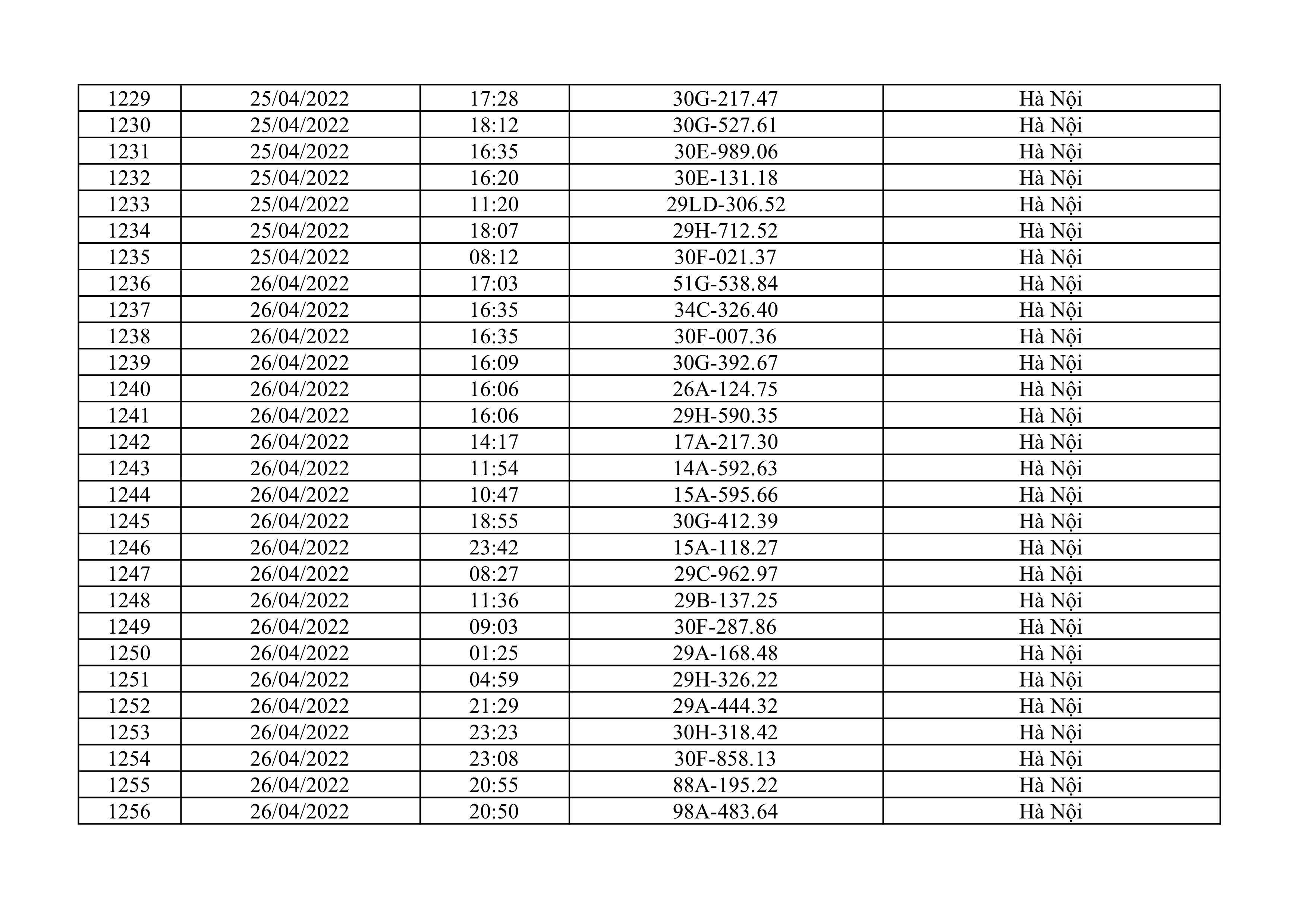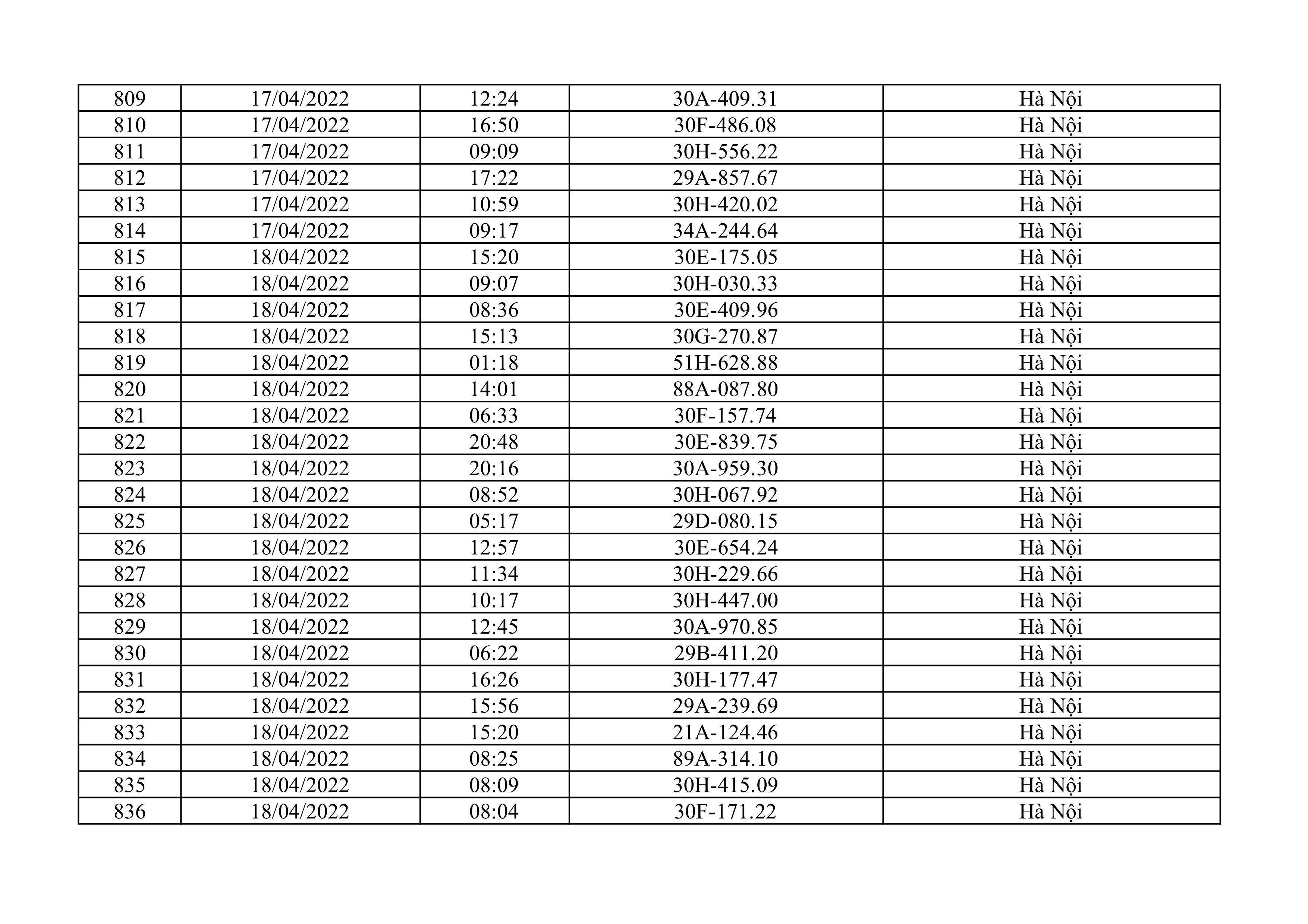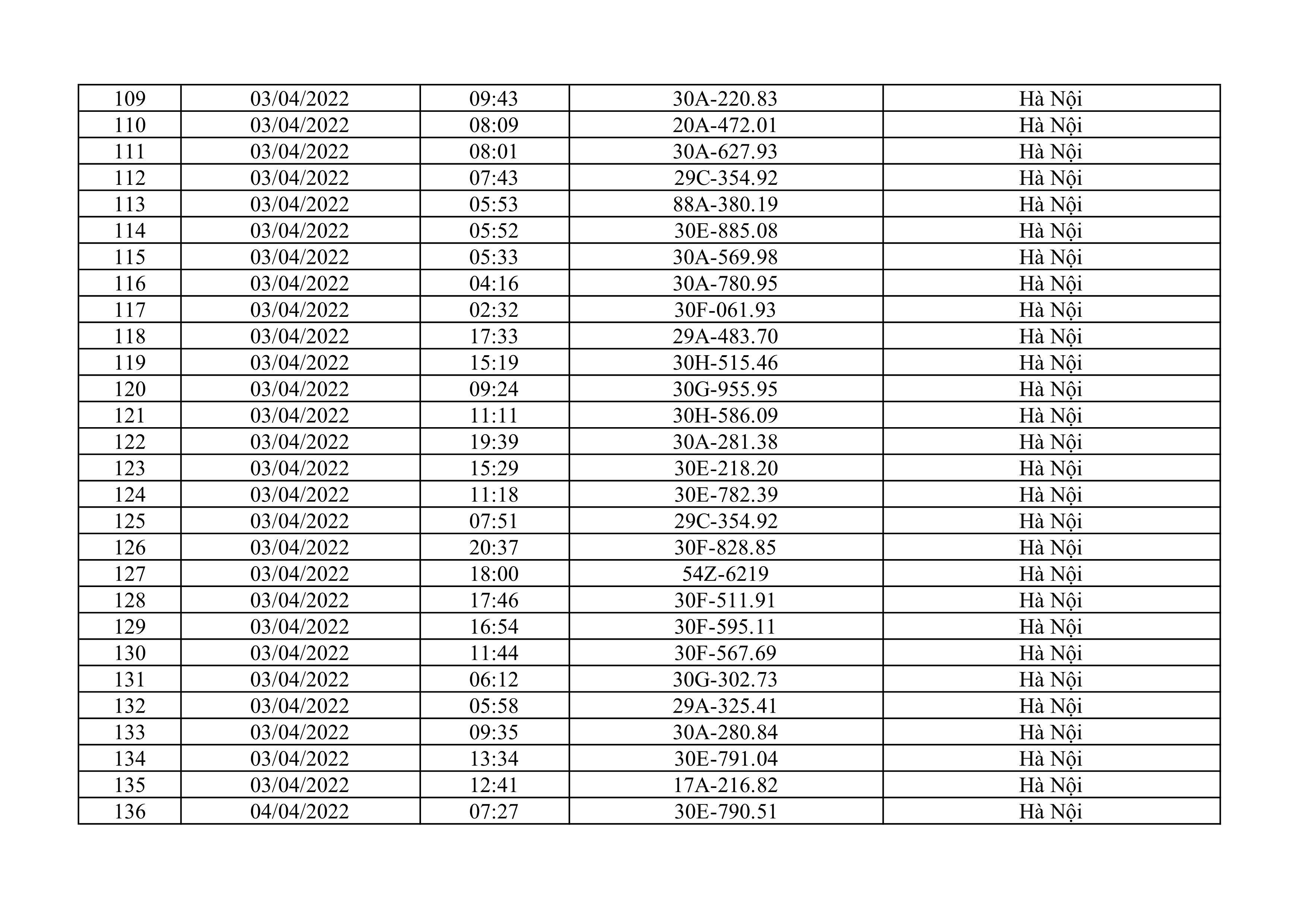 Dưới đây là danh sách ô tô bị phạt nguội từ ngày 1/4/2022 đến ngày 30/4/2022 tại TP Hà Nội.