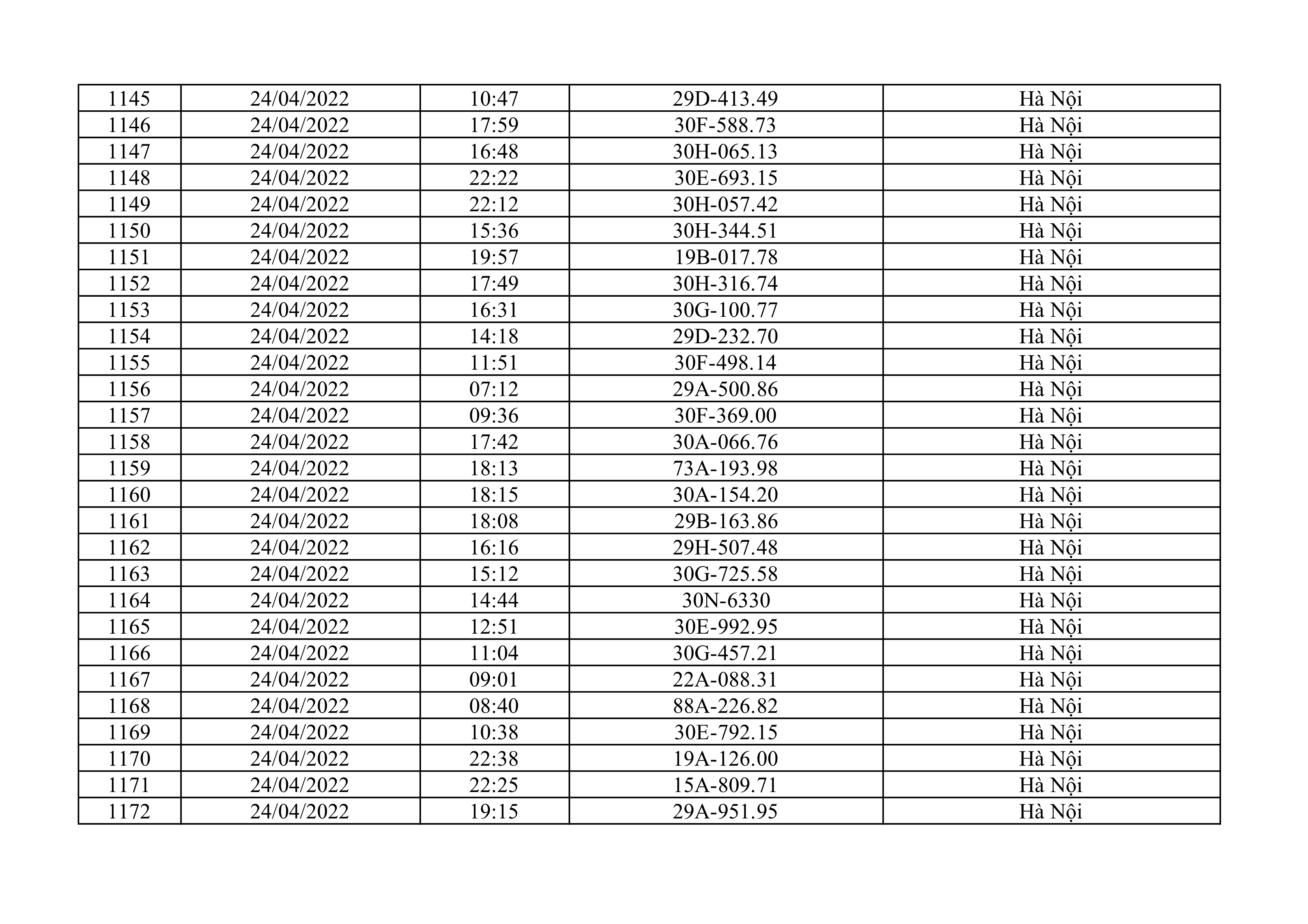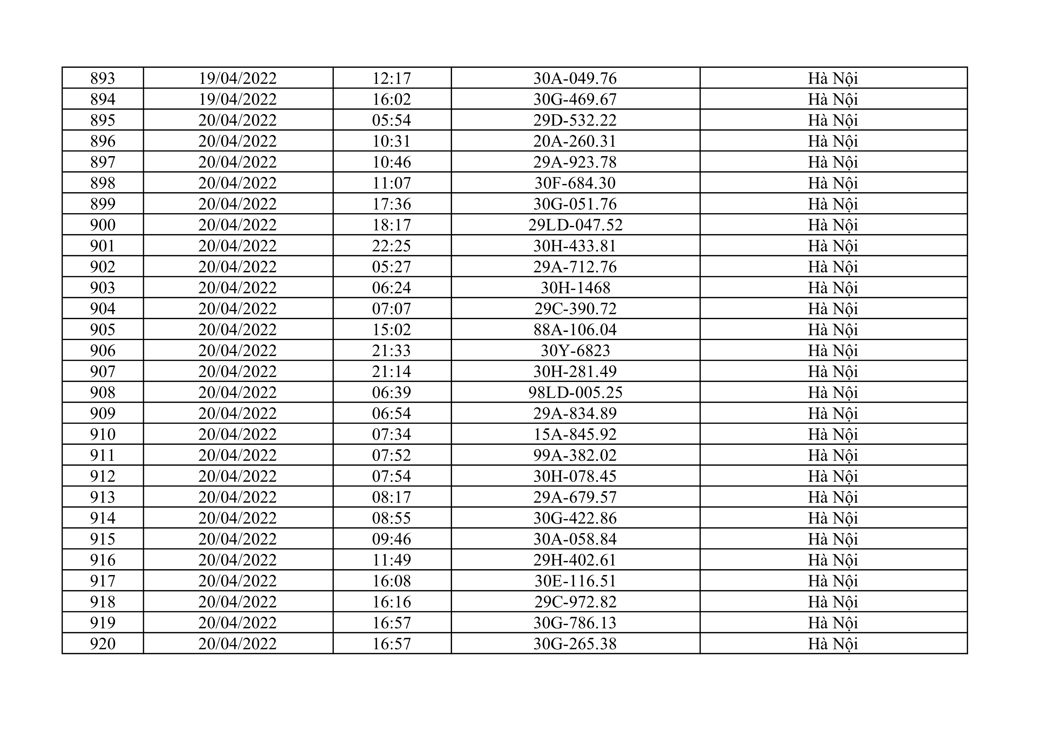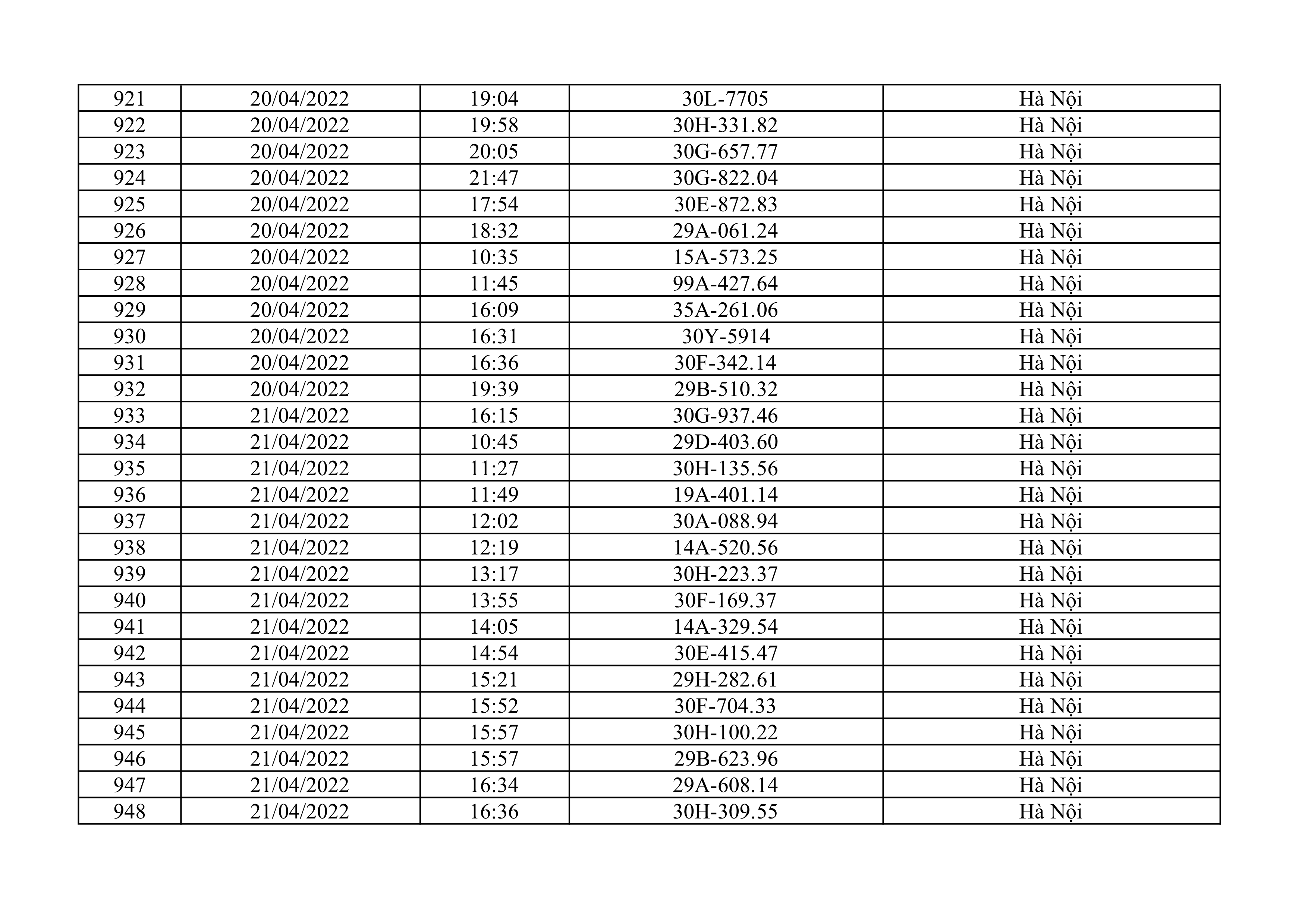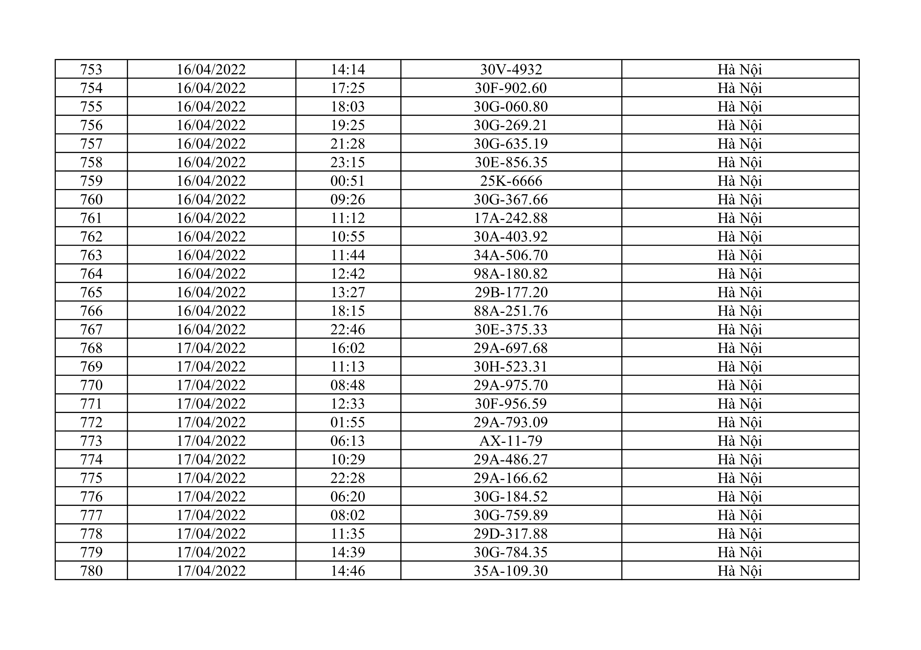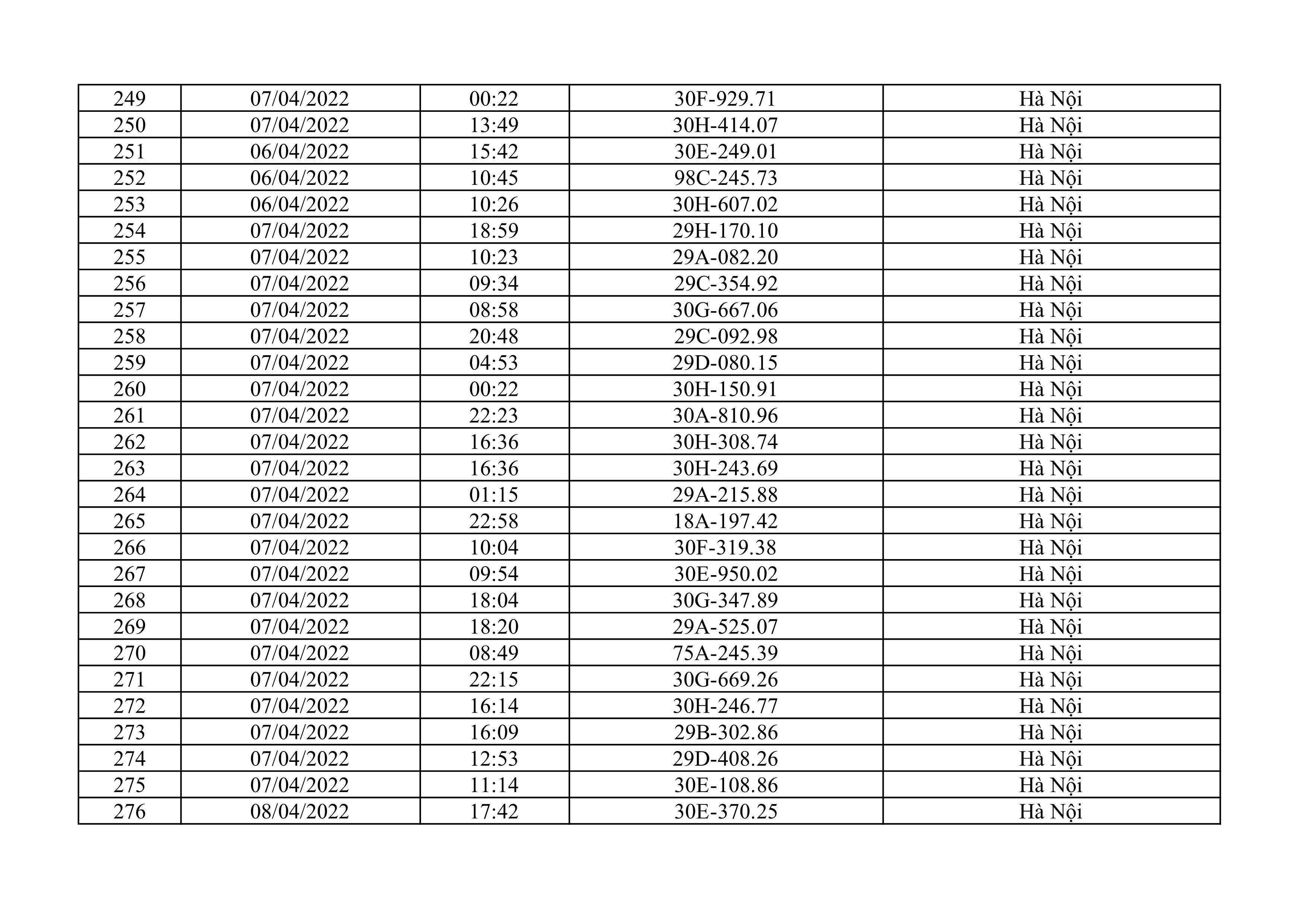 Dưới đây là danh sách ô tô bị phạt nguội từ ngày 1/4/2022 đến ngày 30/4/2022 tại TP Hà Nội.