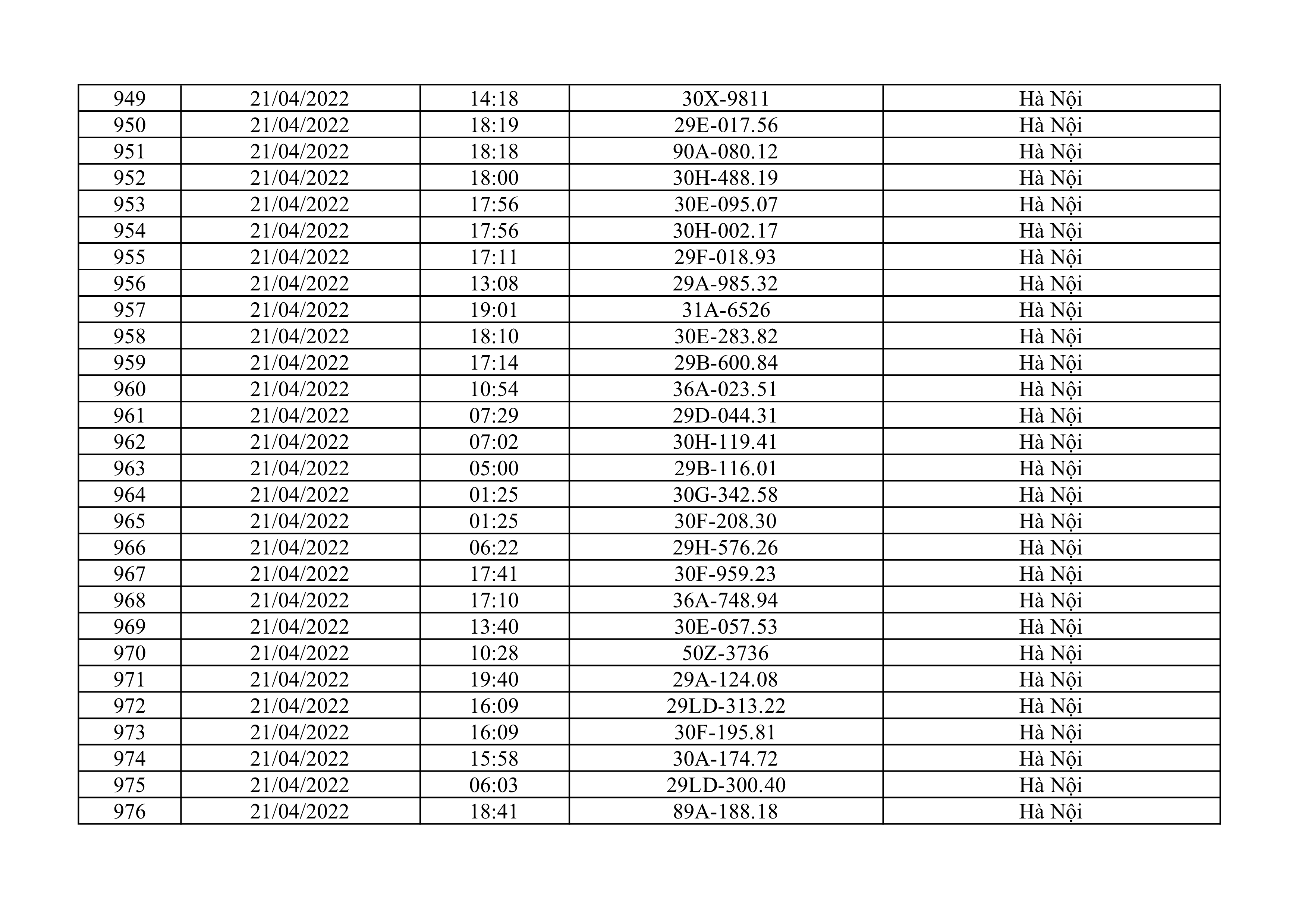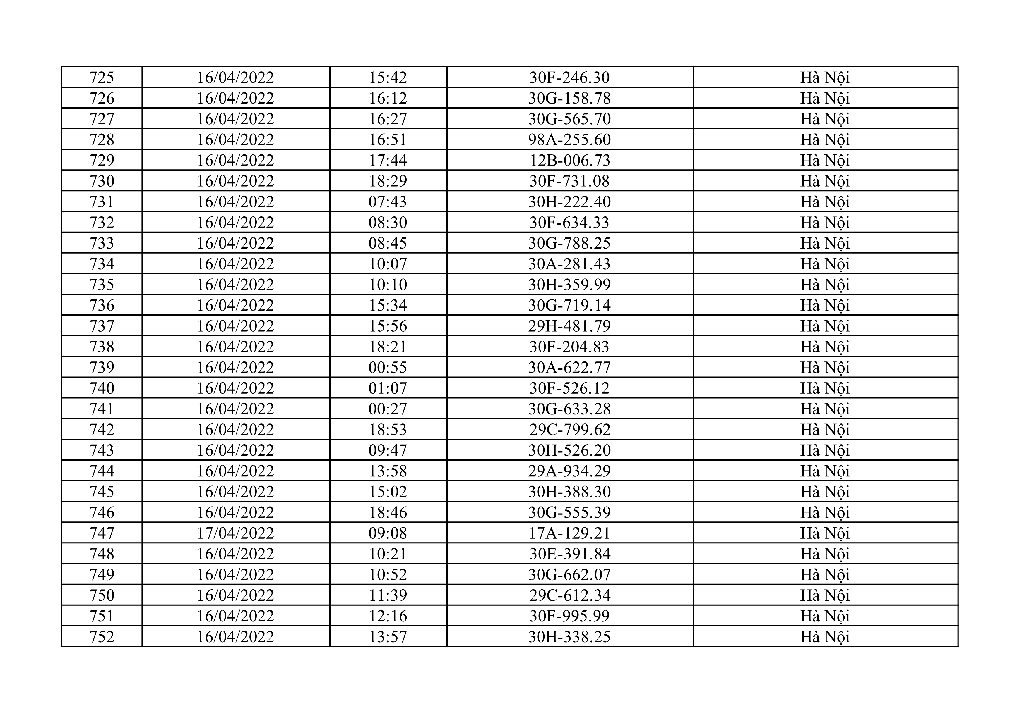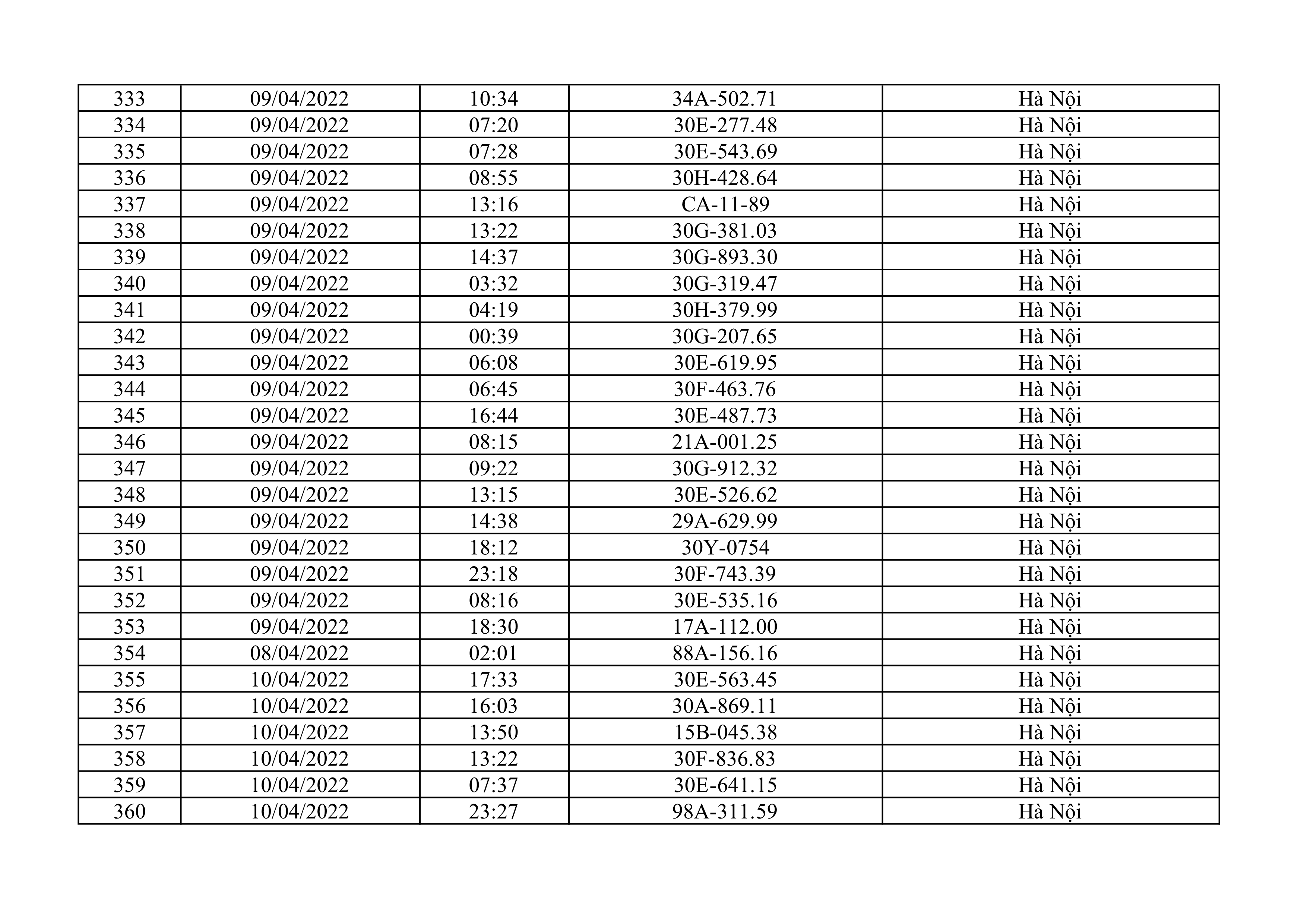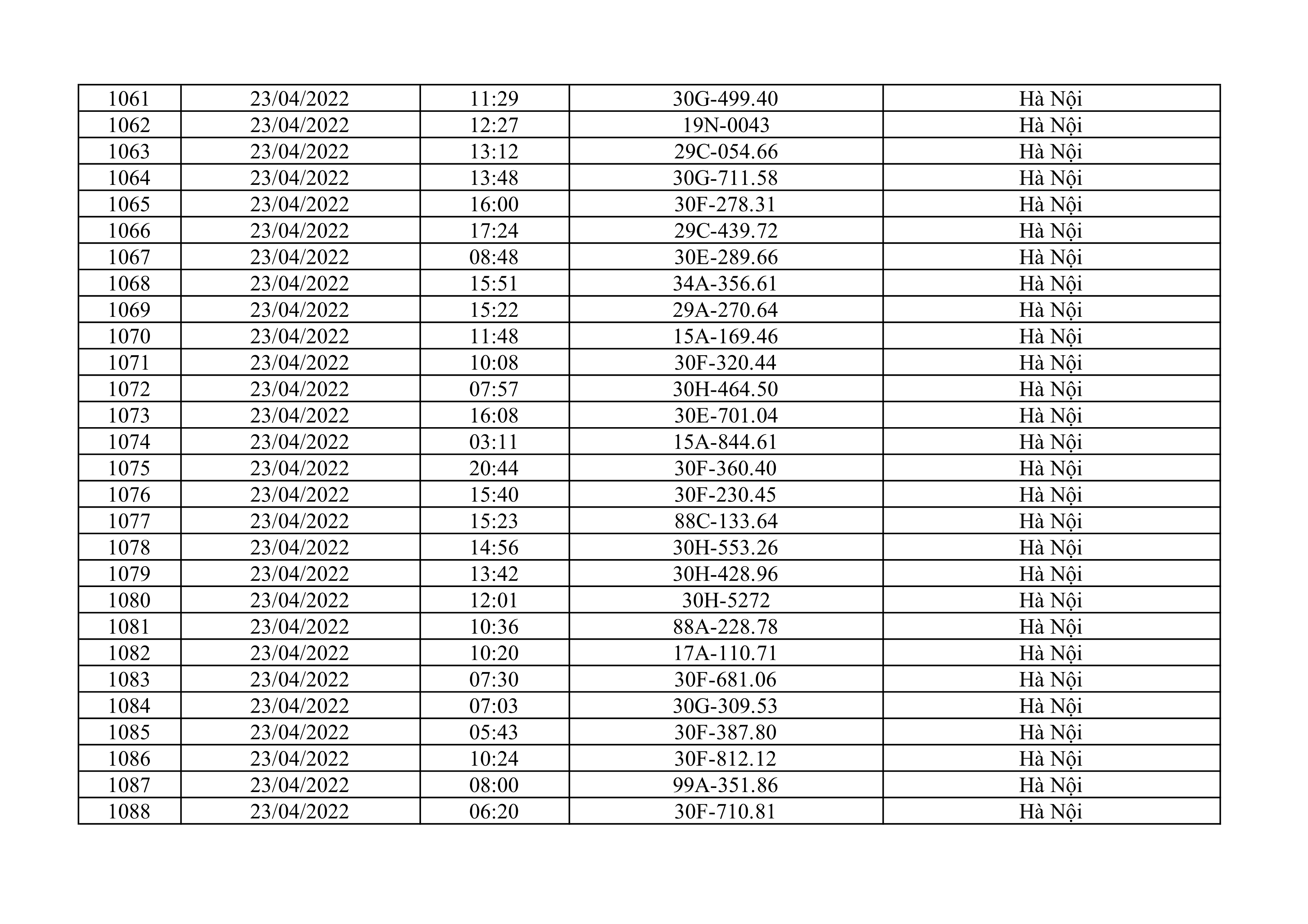 Dưới đây là danh sách ô tô bị phạt nguội từ ngày 1/4/2022 đến ngày 30/4/2022 tại TP Hà Nội.