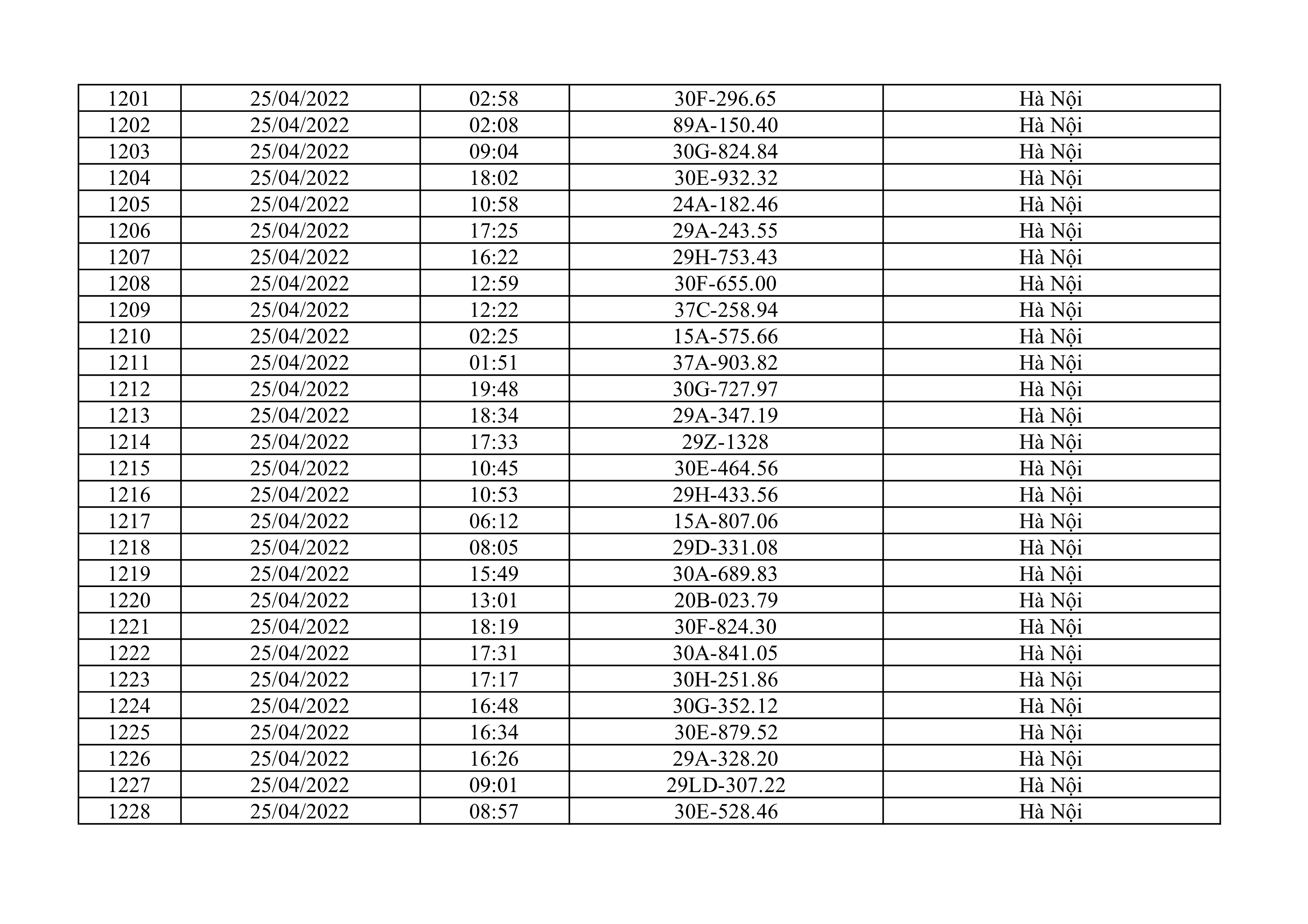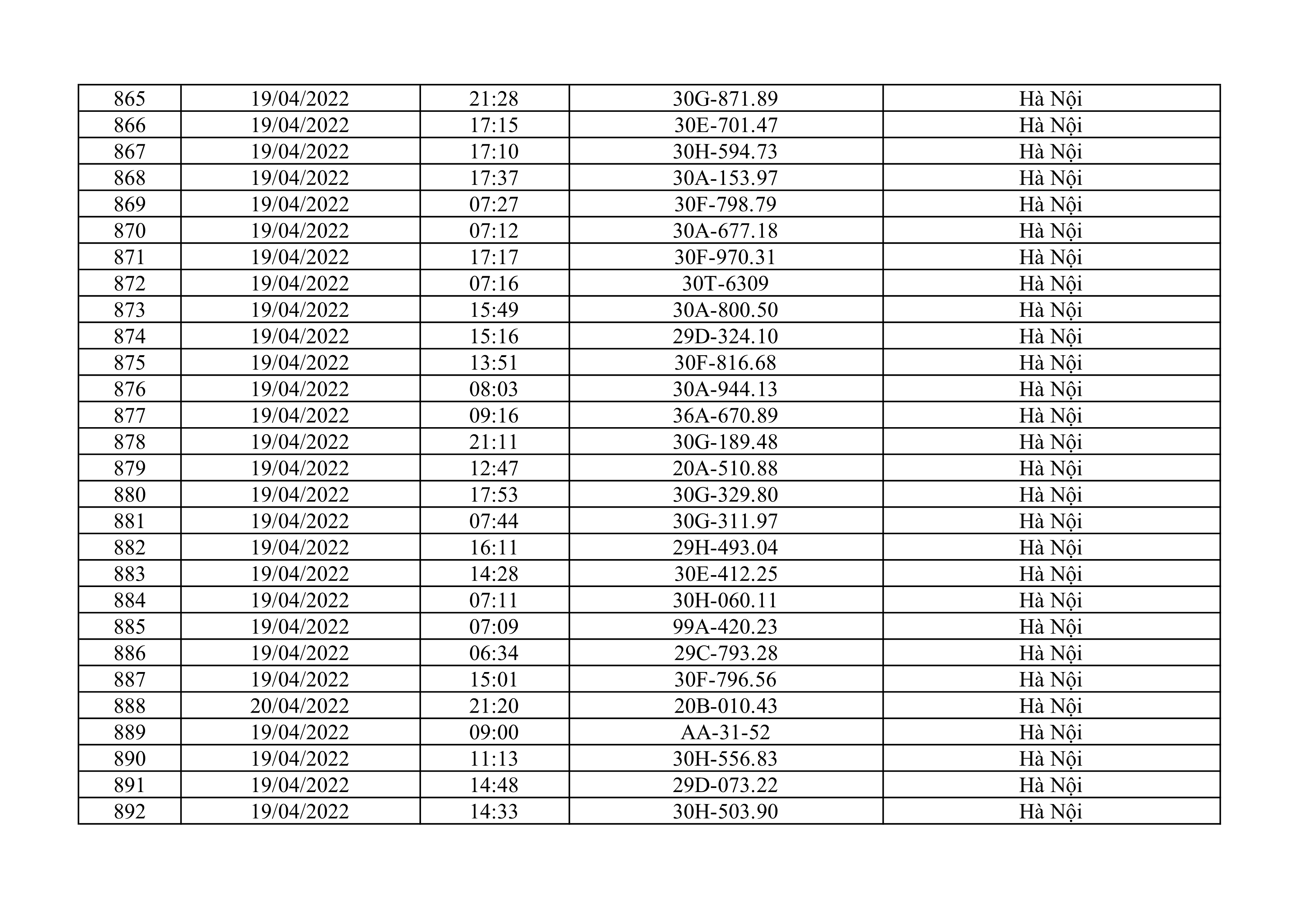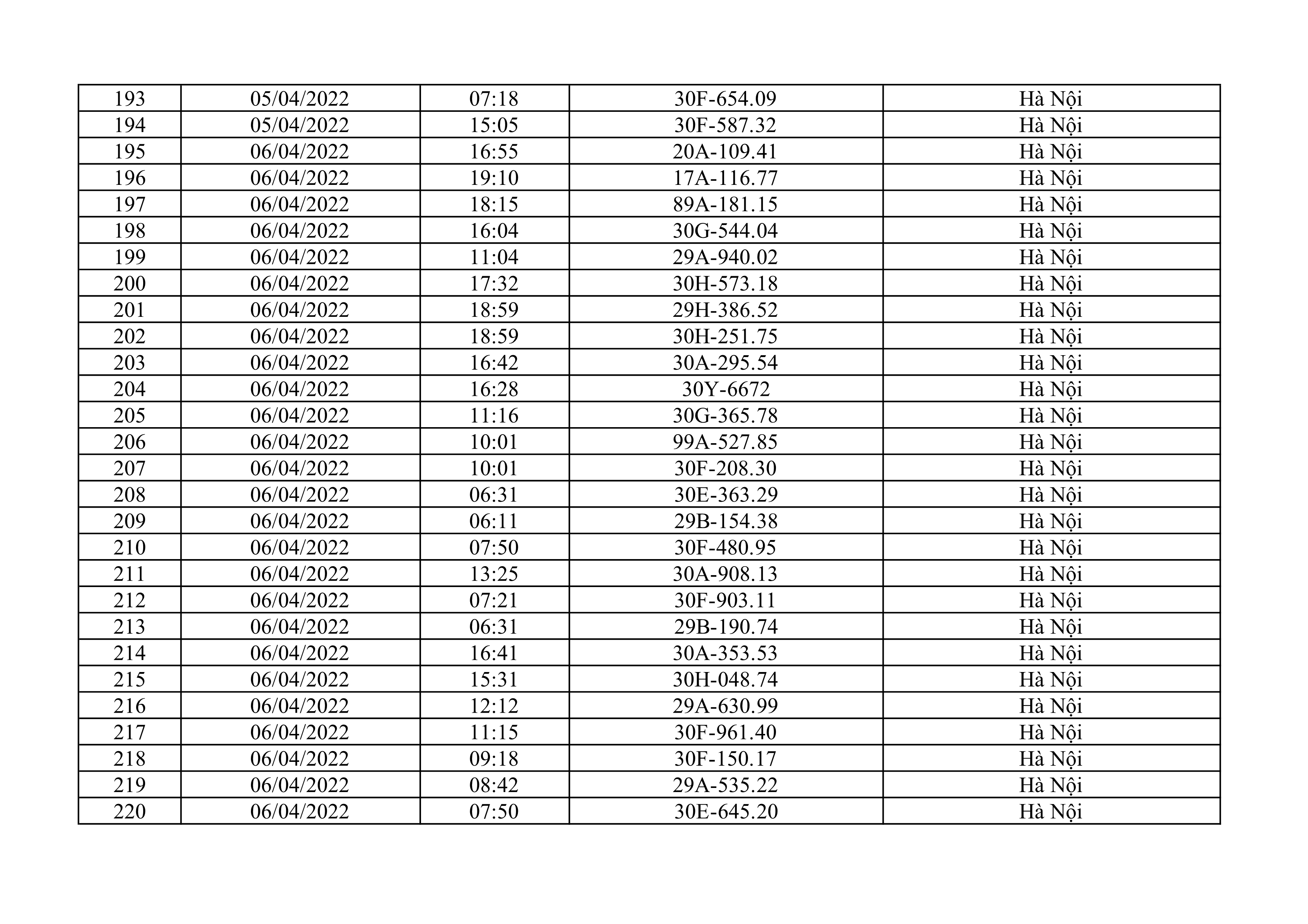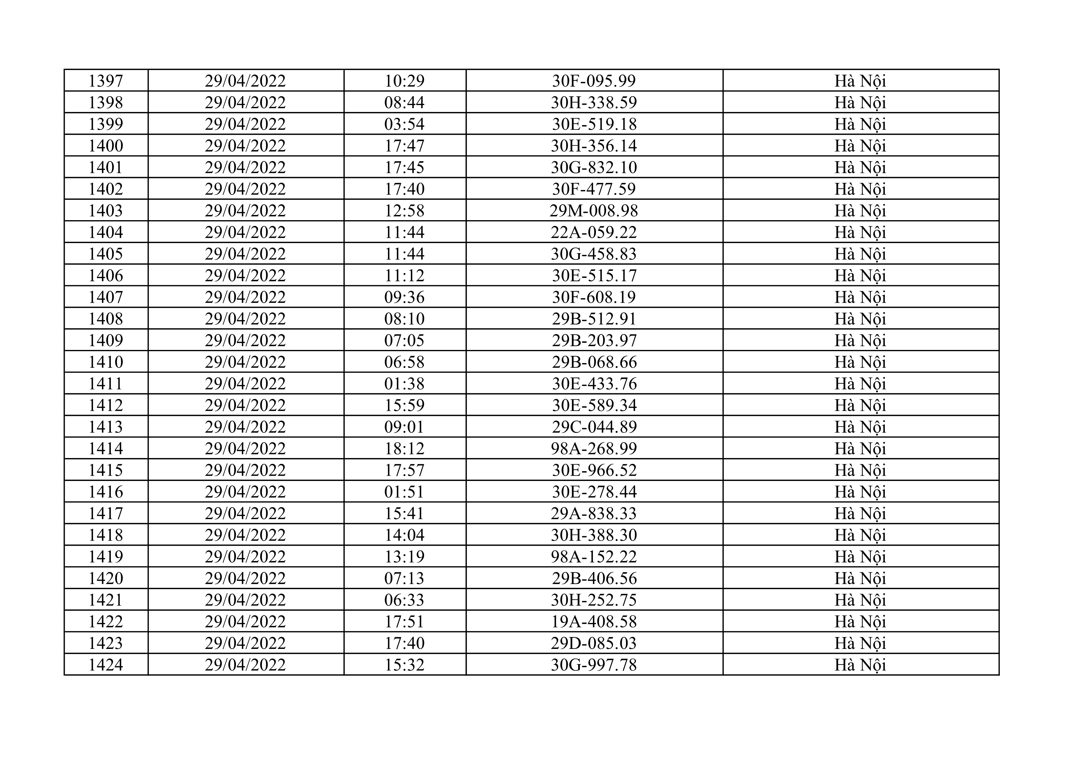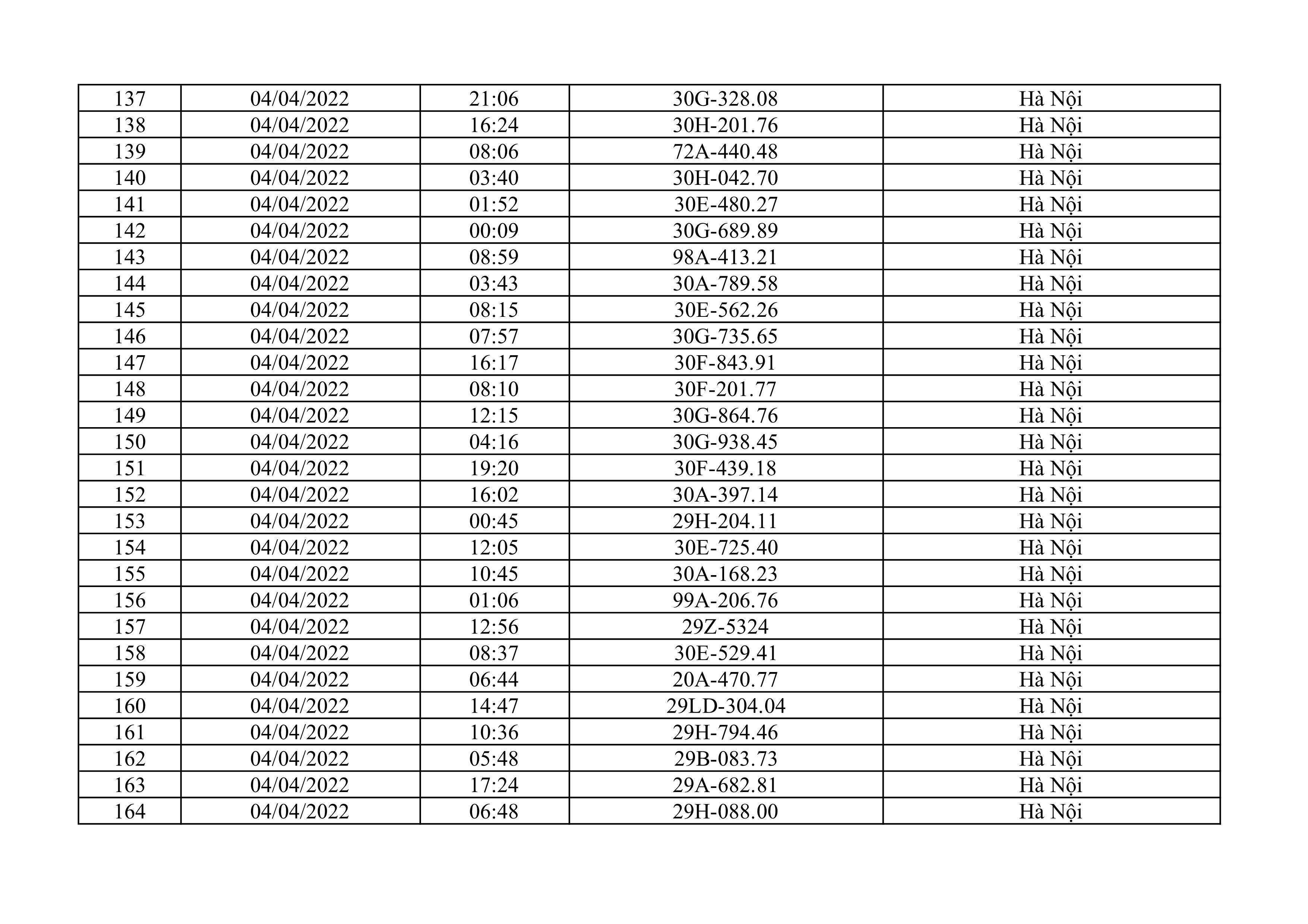 Dưới đây là danh sách ô tô bị phạt nguội từ ngày 1/4/2022 đến ngày 30/4/2022 tại TP Hà Nội.