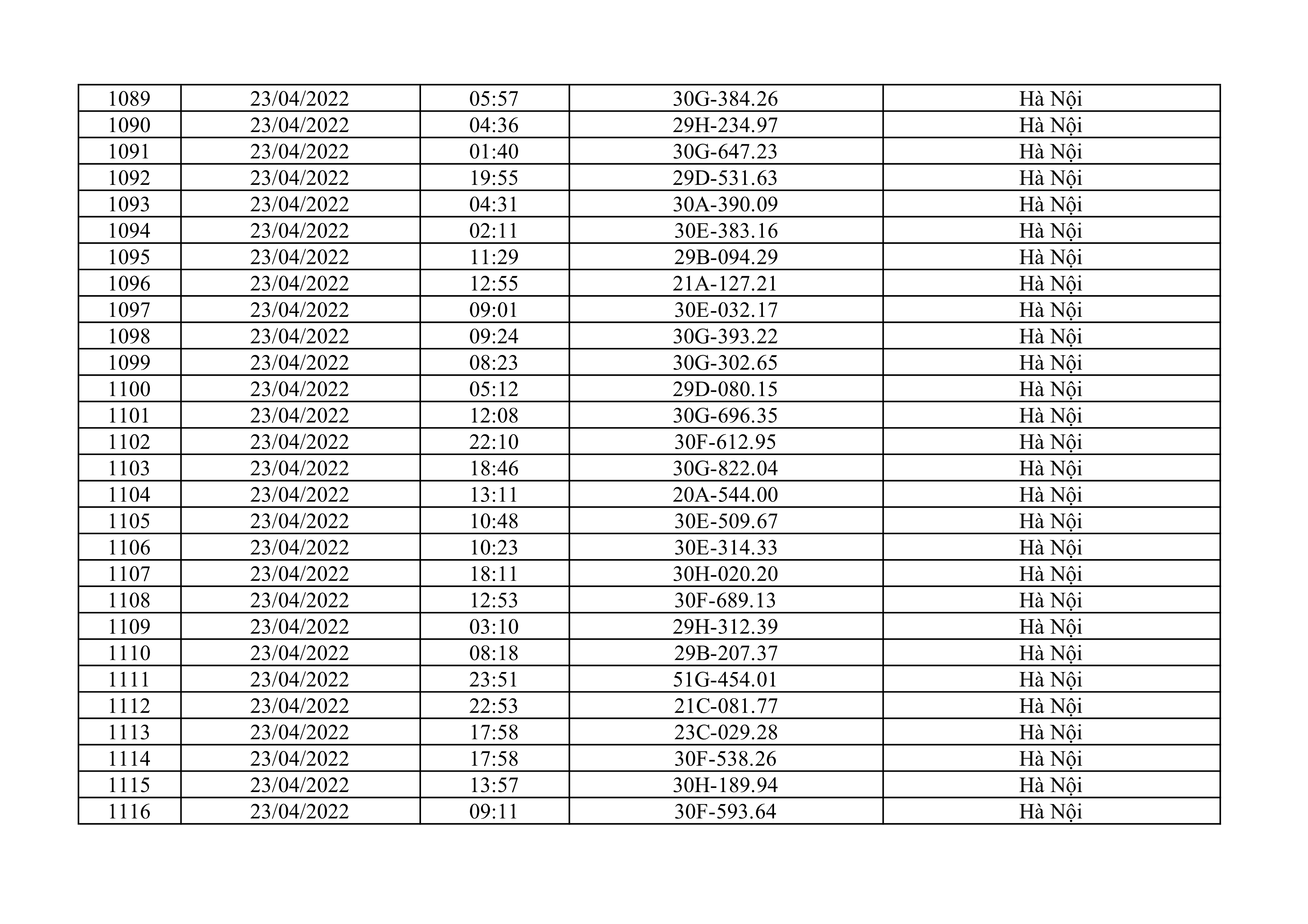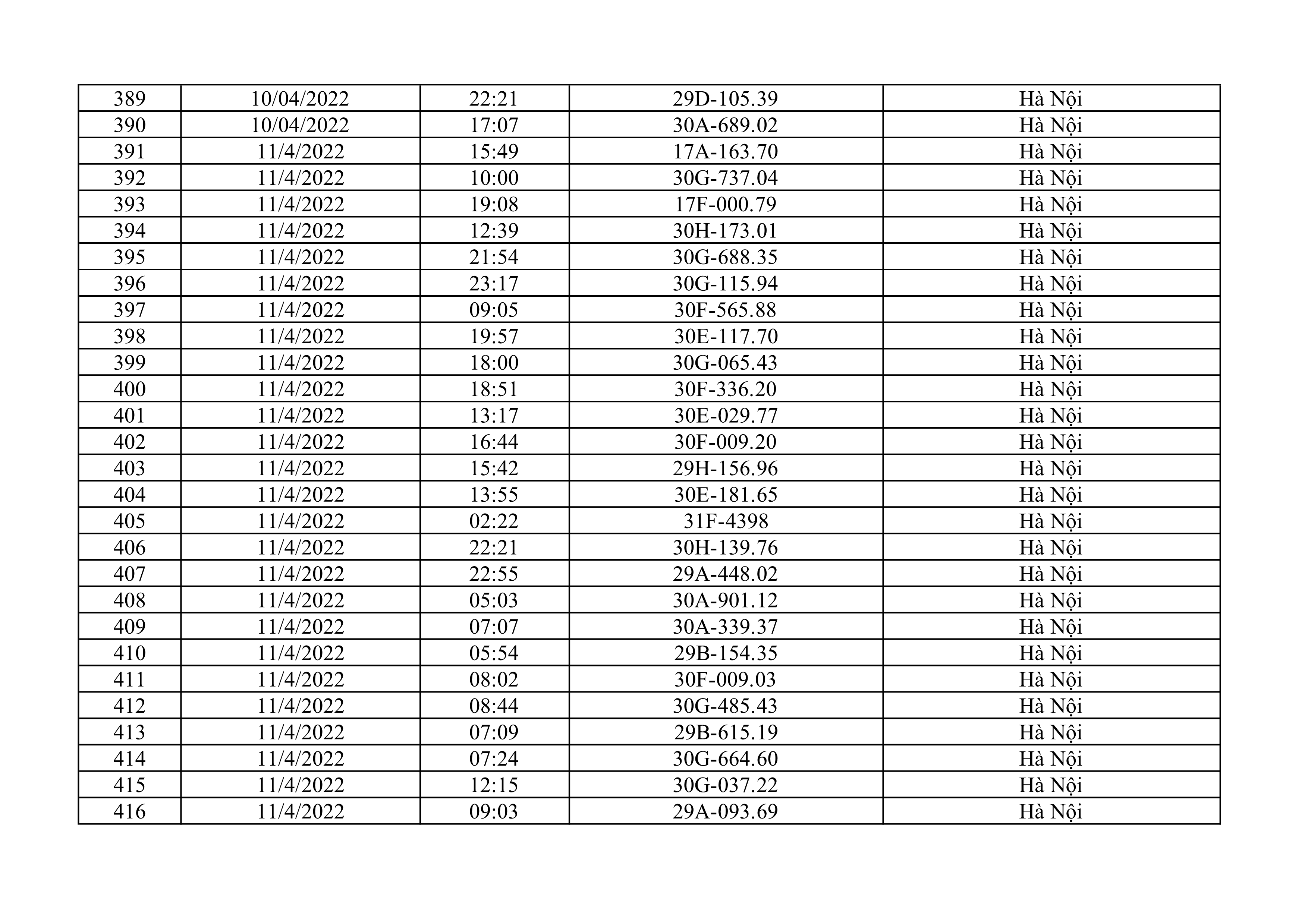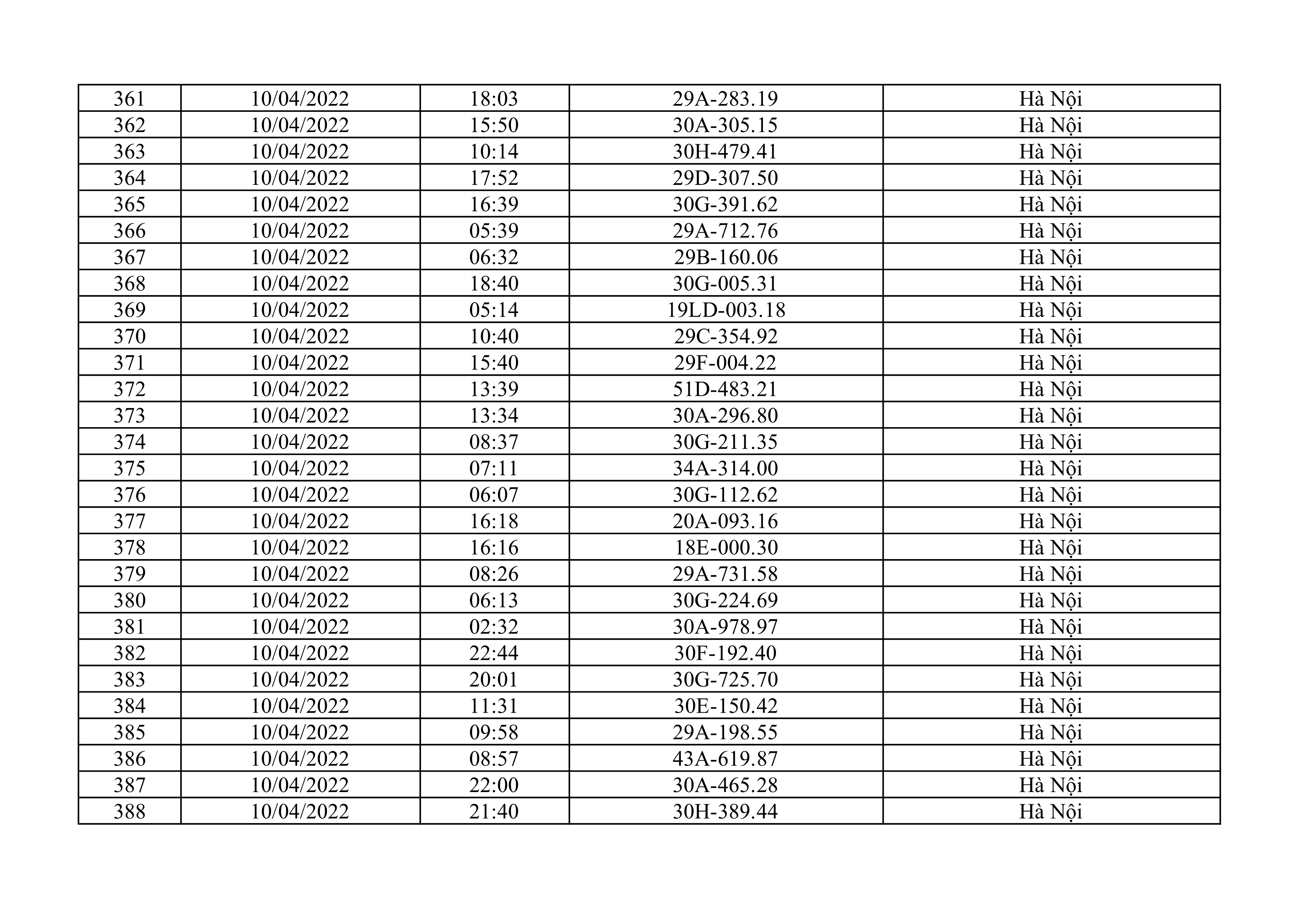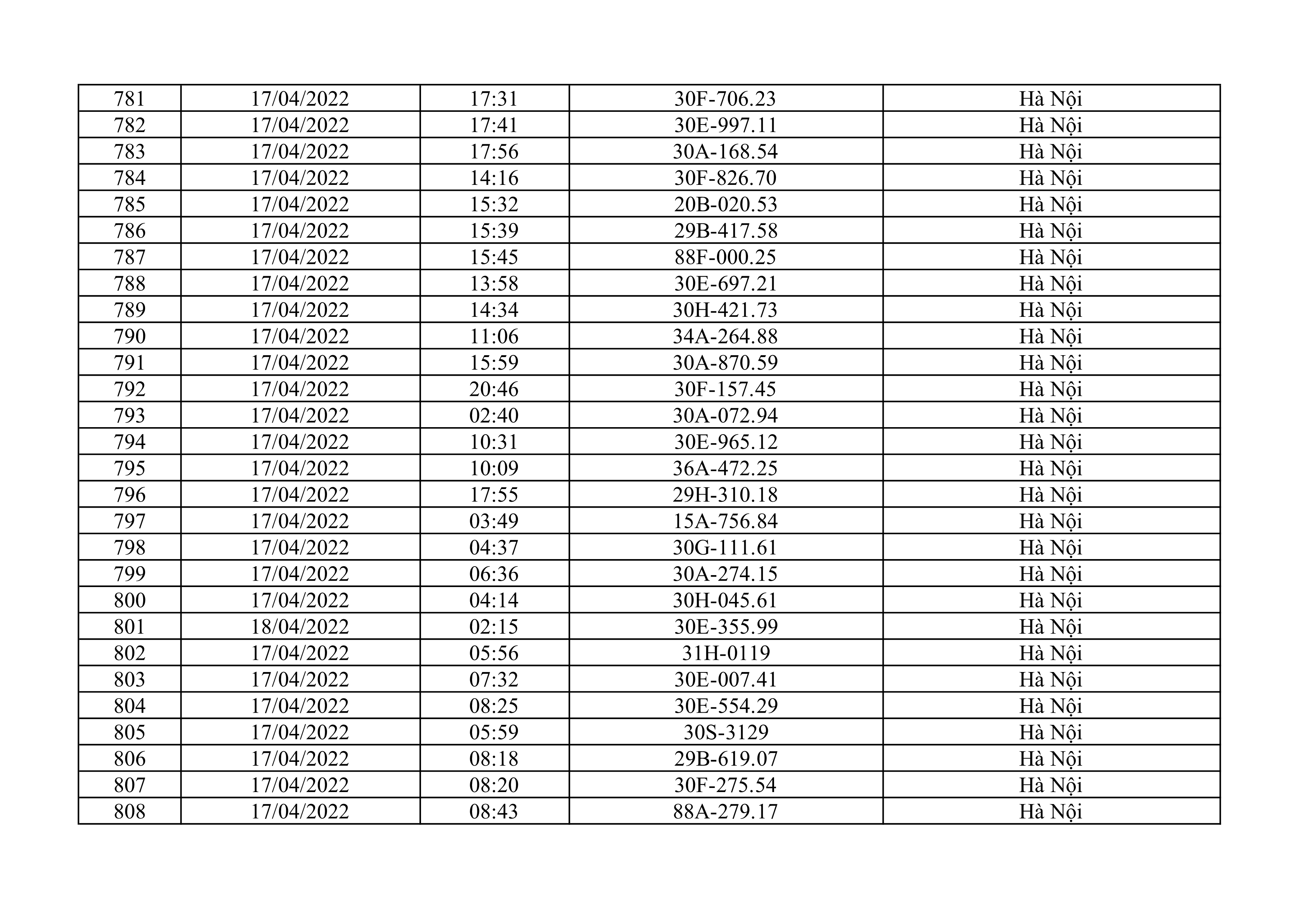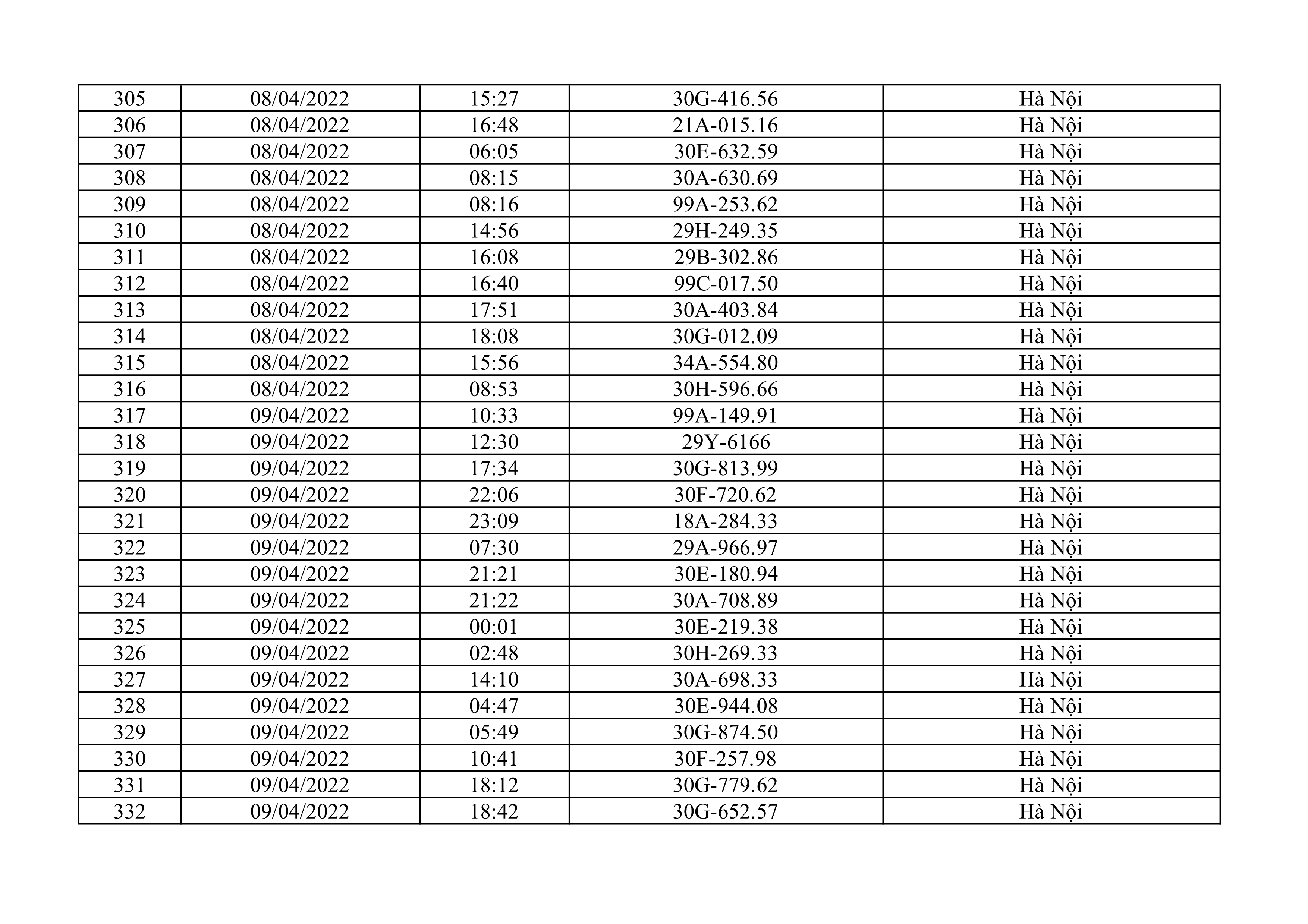 Dưới đây là danh sách ô tô bị phạt nguội từ ngày 1/4/2022 đến ngày 30/4/2022 tại TP Hà Nội.