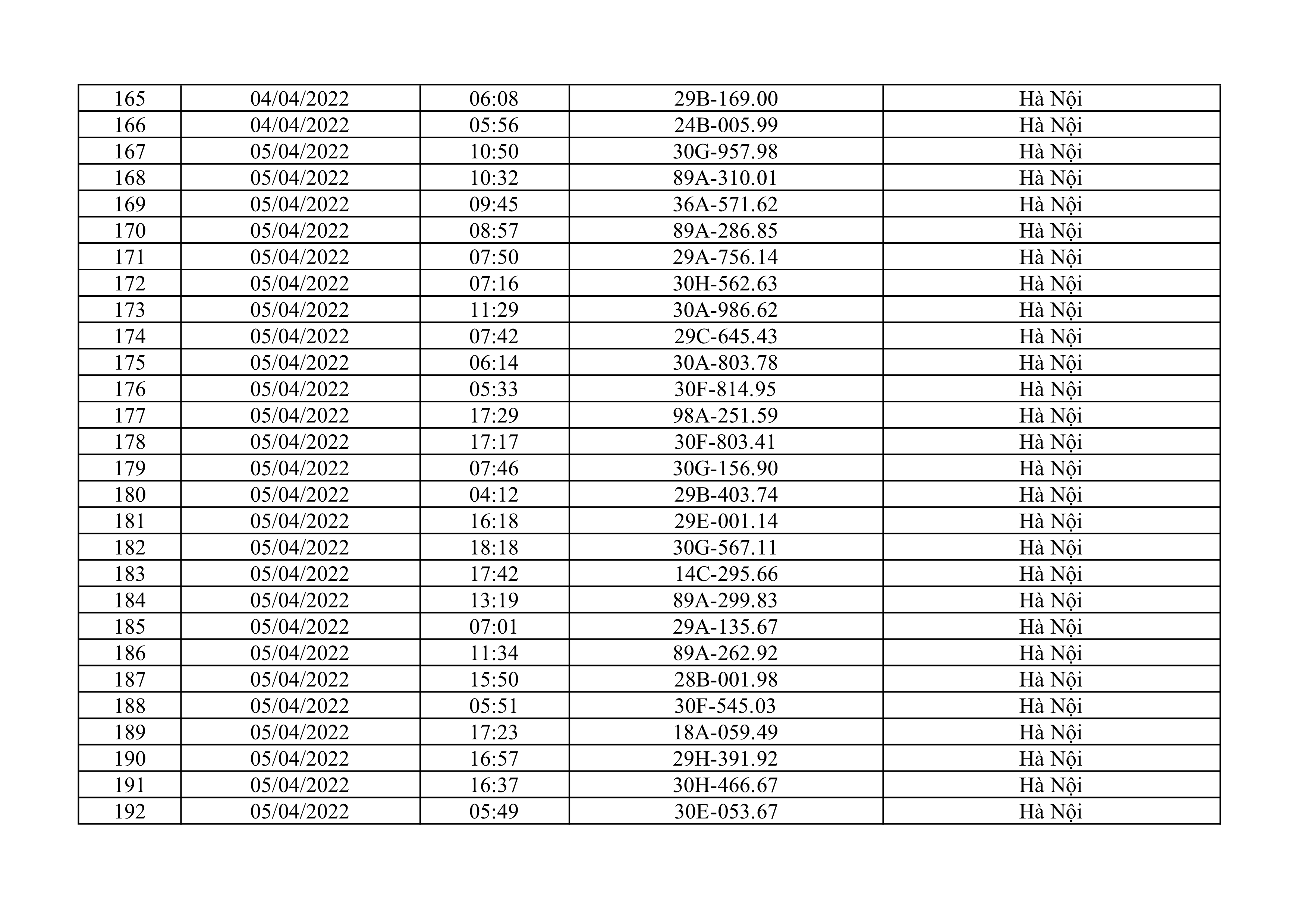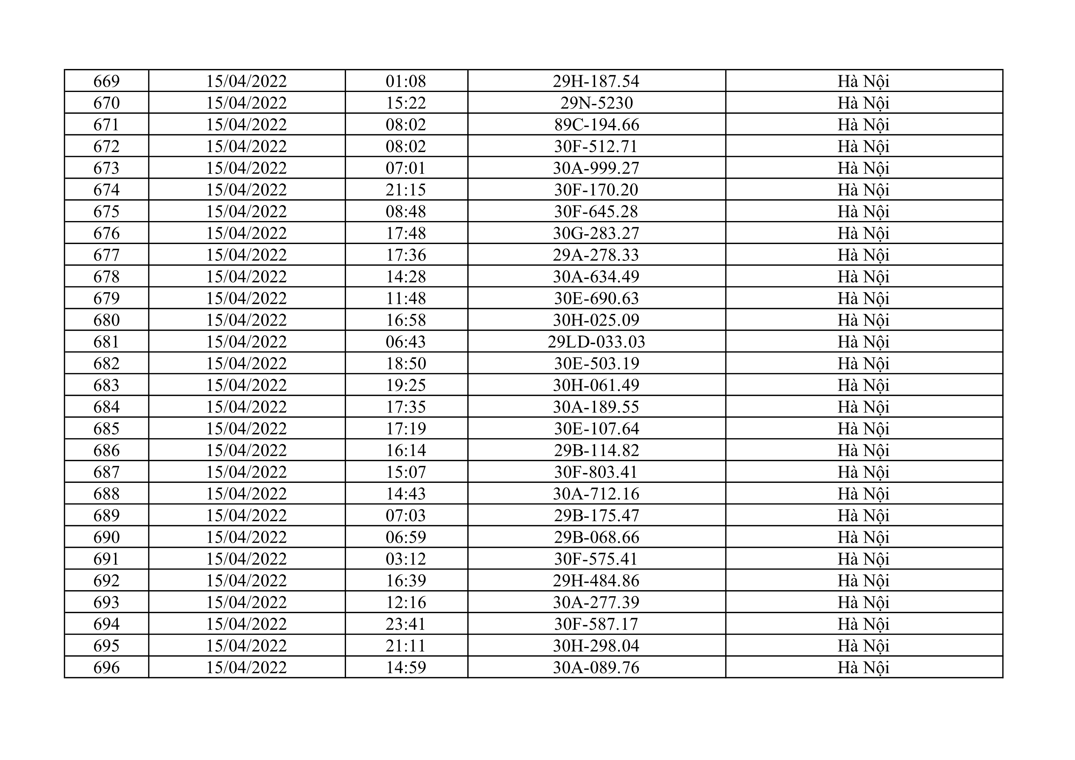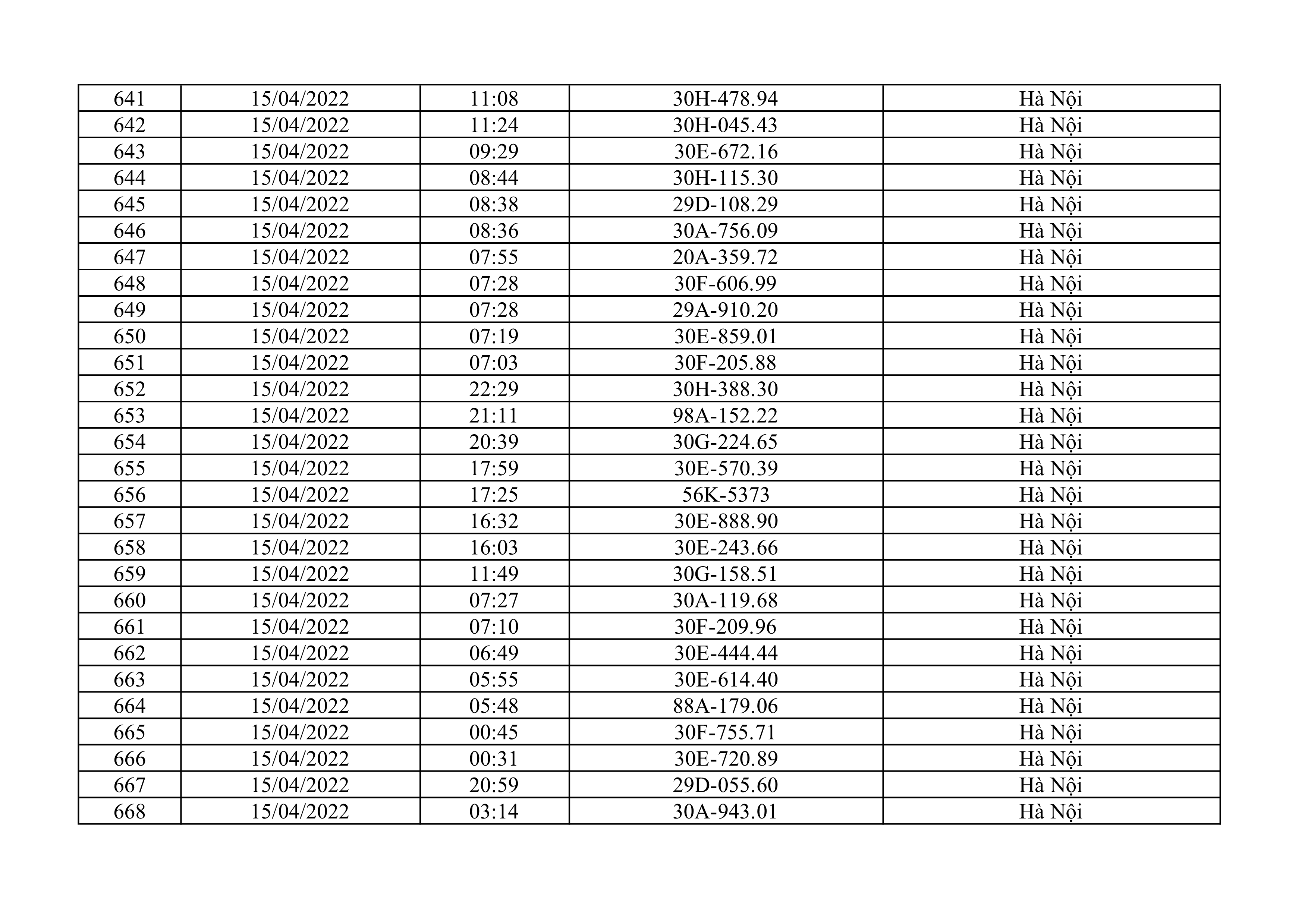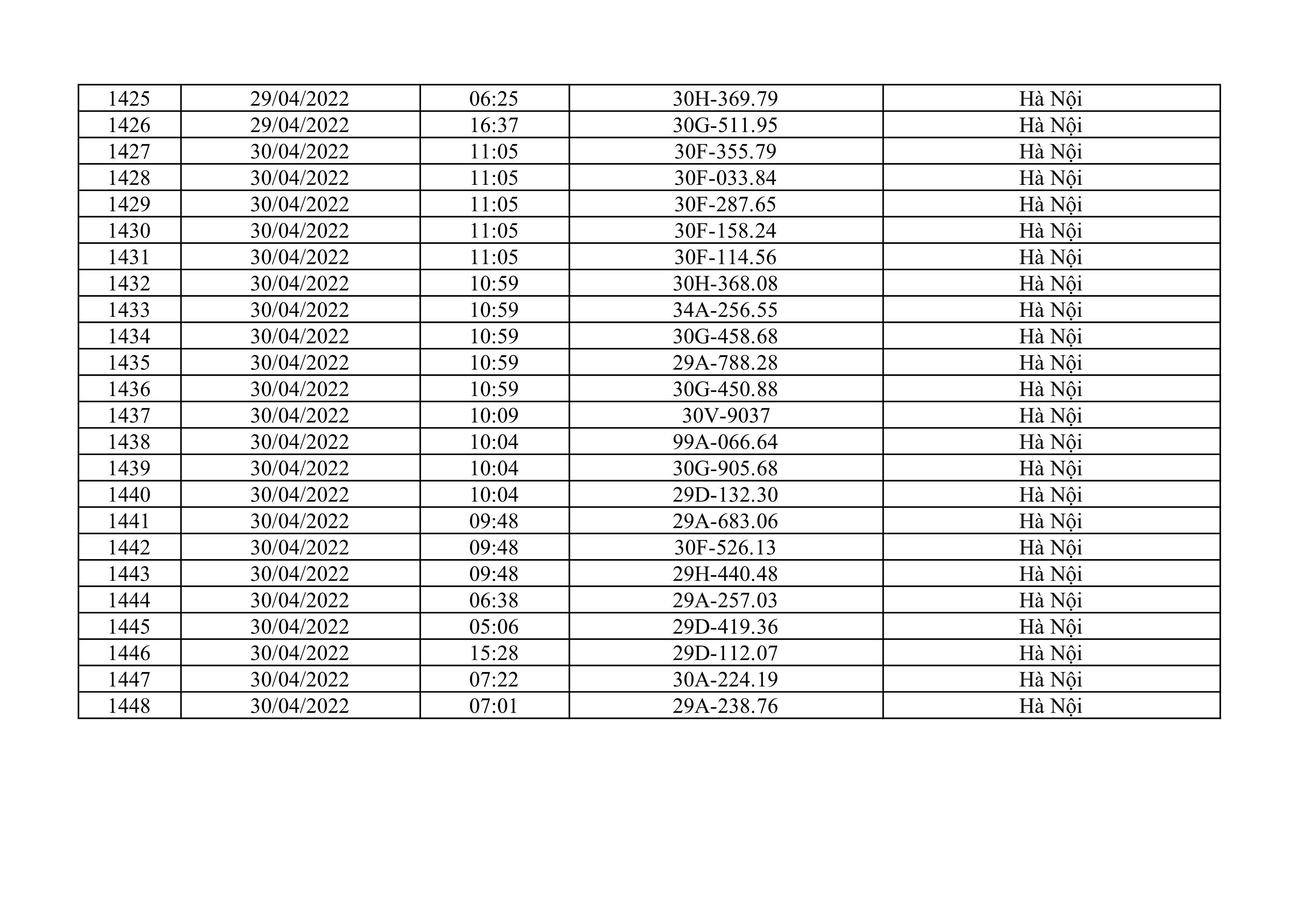Dưới đây là danh sách ô tô bị phạt nguội từ ngày 1/4/2022 đến ngày 30/4/2022 tại TP Hà Nội.