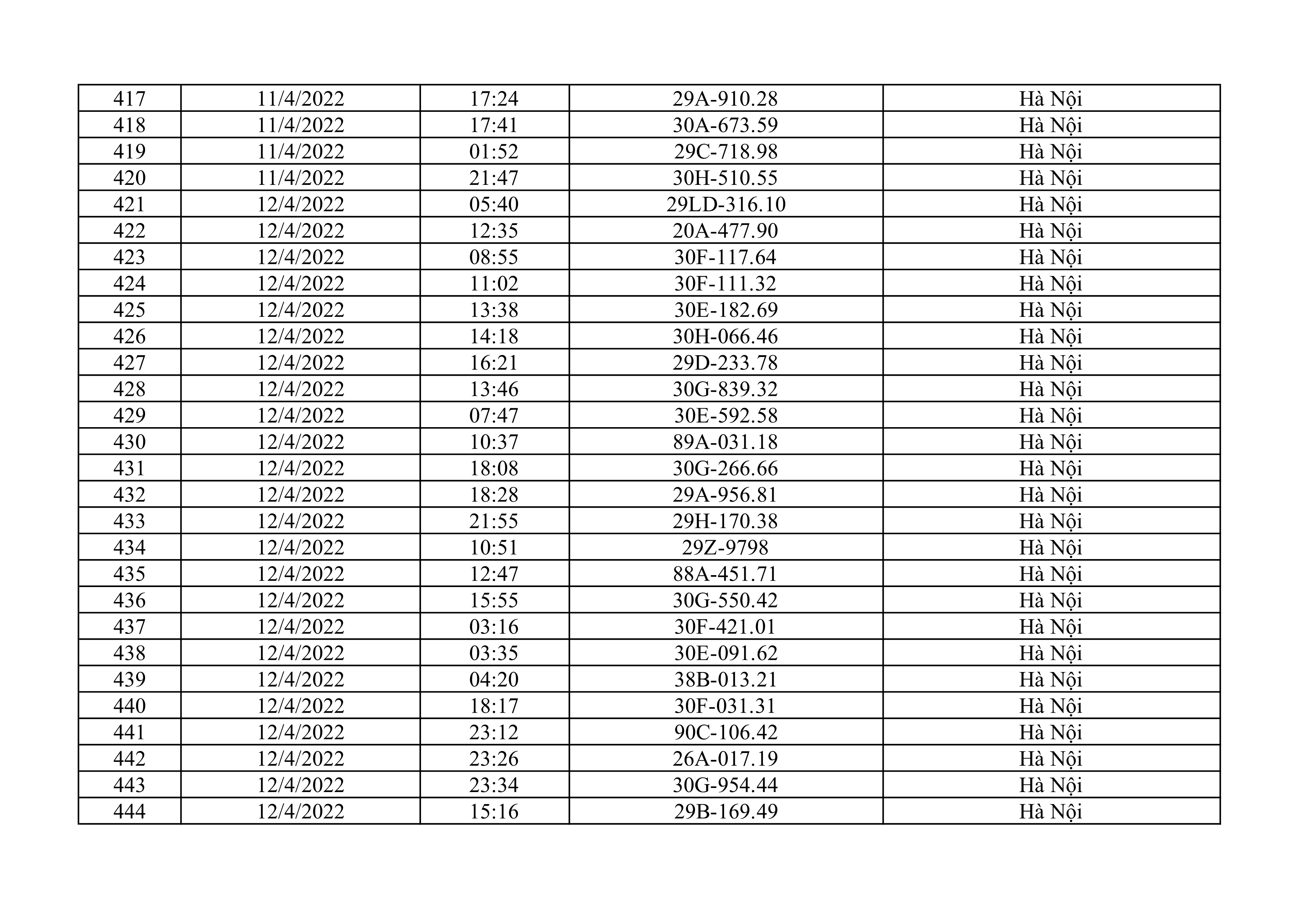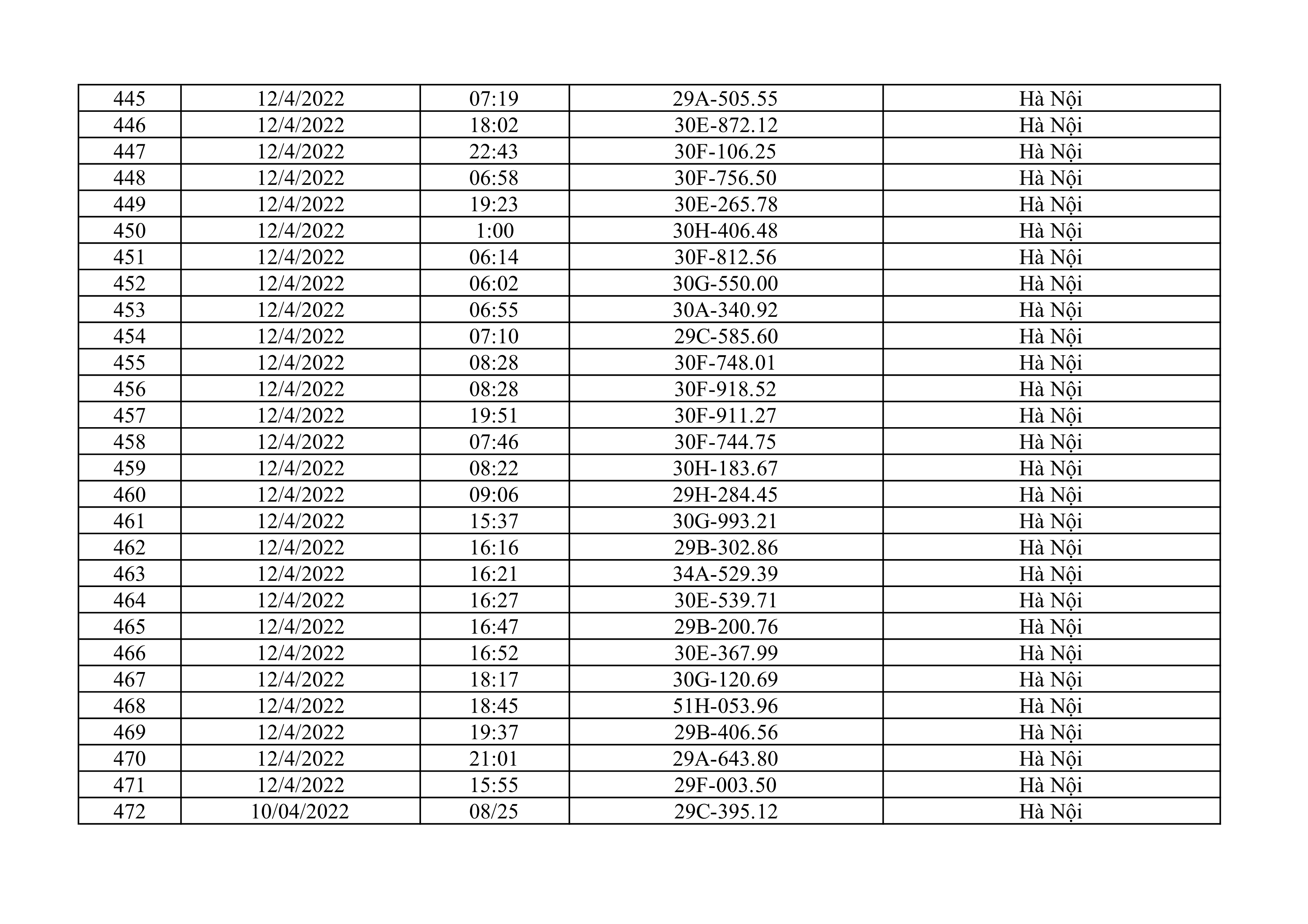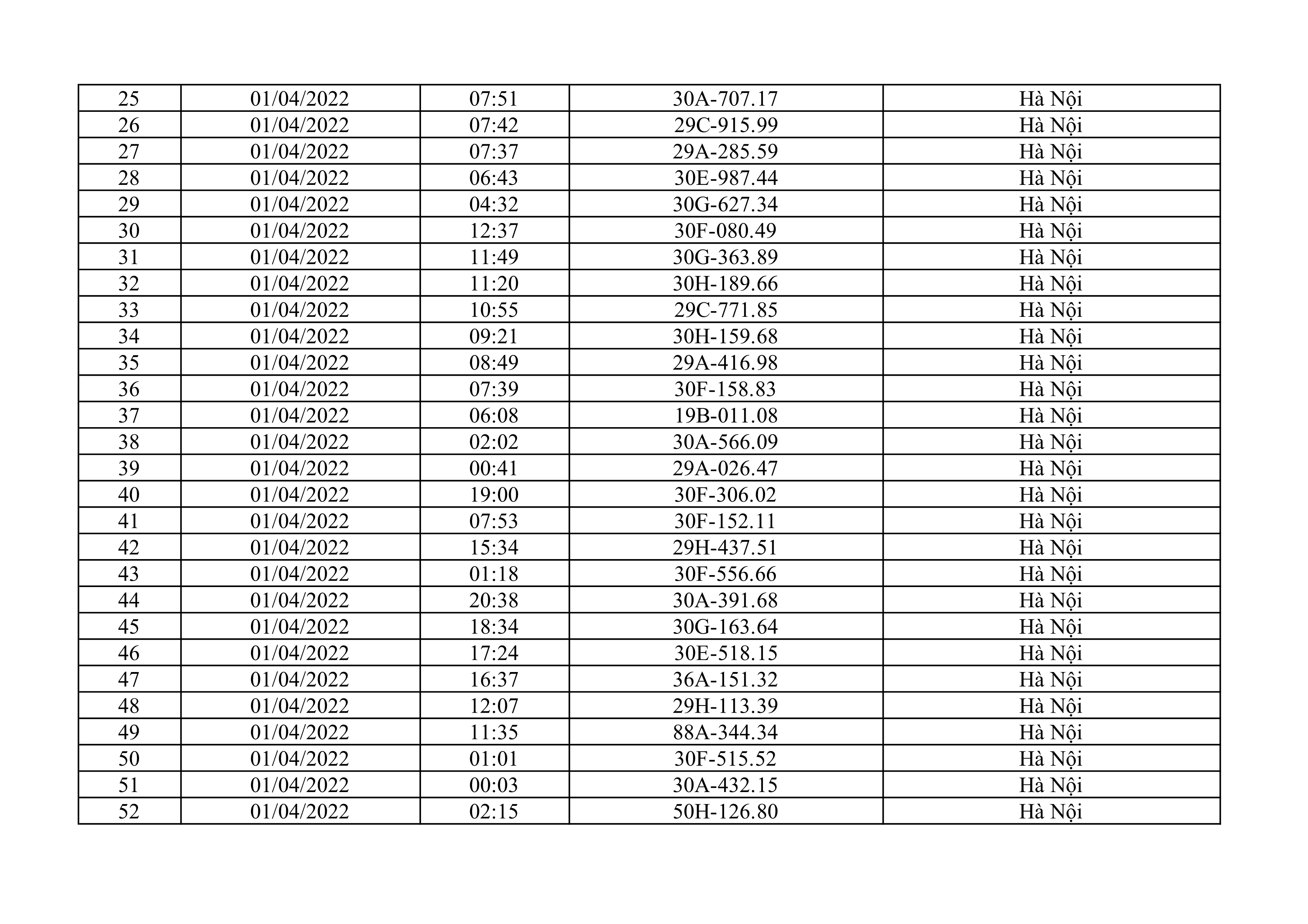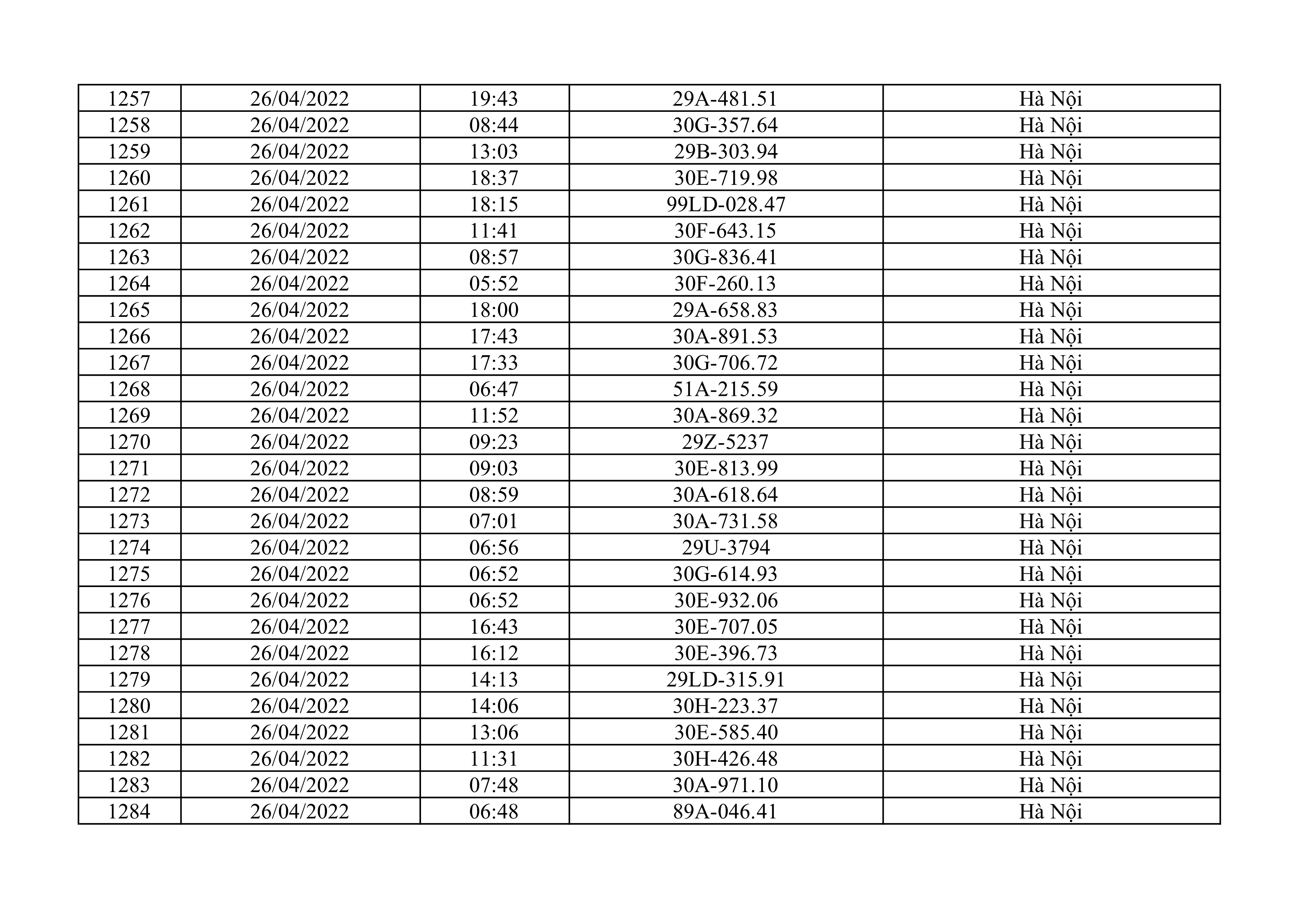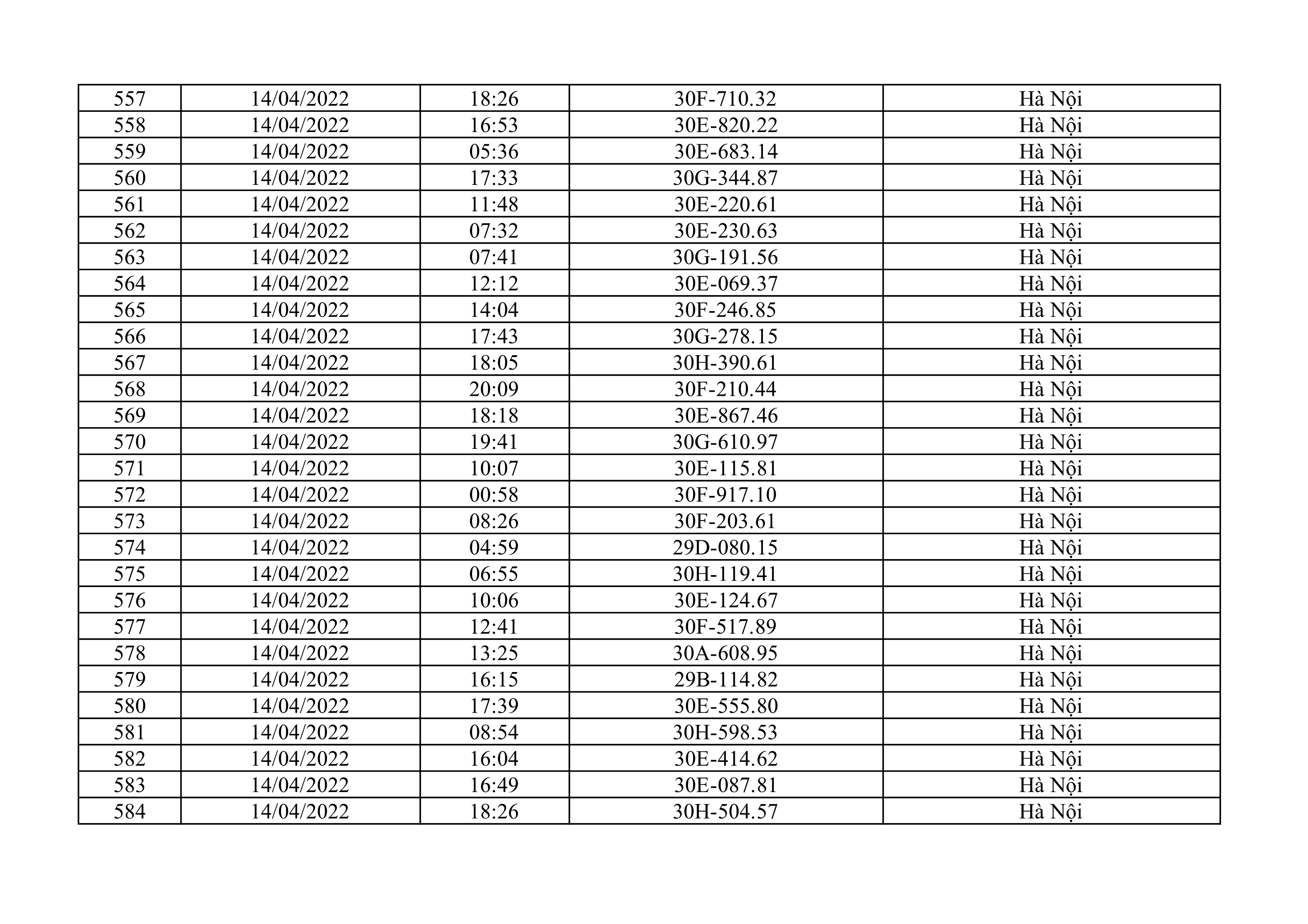 Dưới đây là danh sách ô tô bị phạt nguội từ ngày 1/4/2022 đến ngày 30/4/2022 tại TP Hà Nội.