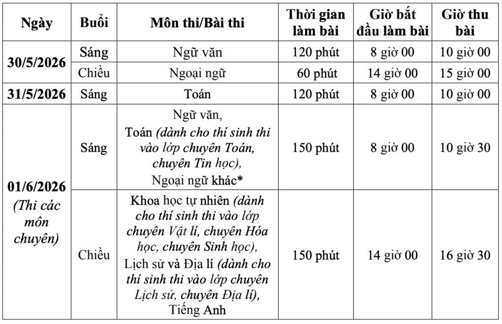 Lịch thi lớp 10 năm 2026 của học sinh Hà Nội như sau: