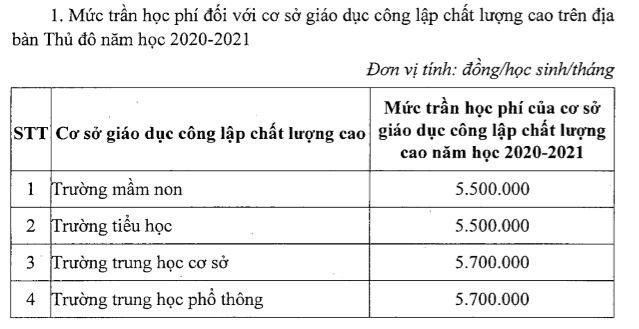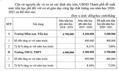 Cụ thể, theo đề xuất của UBND TP.Hà Nội, năm học 2020-2021, mức trần học phí trường mầm non, tiểu học công lập chất lượng cao là 5,5 triệu đồng, THCS và THPT là 5,7 triệu đồng, đều tăng 400.000 đồng so với năm 2019-2020.
