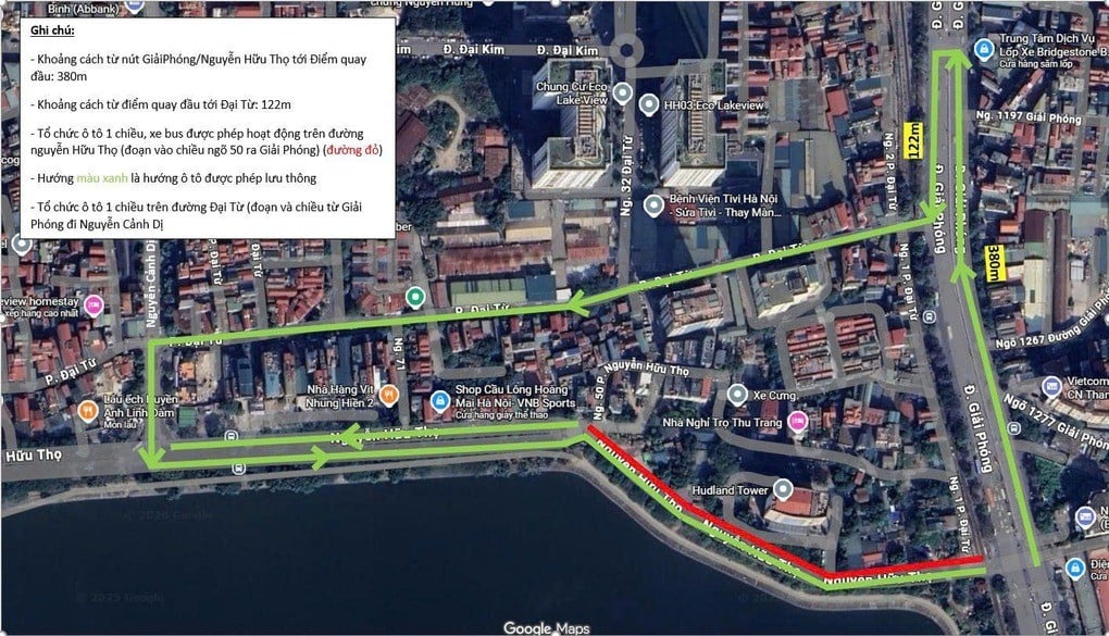 Để tạo điều kiện lưu thông, ô tô từ đường Giải Phóng muốn đi Nguyễn Hữu Thọ sẽ di chuyển theo lộ trình: Giải Phóng → quay đầu tại khu vực số 1187 Giải Phóng → rẽ phải vào phố Đại Từ → tiếp tục đi Nguyễn Hữu Thọ.