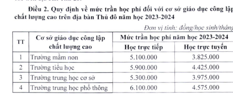 Dựa vào mức trần và điều kiện của trường, của địa phương, các trường tự xây dựng mức học phí cụ thể. Hiện, Hà Nội có khoảng 20 trường chất lượng cao từ mầm non tới phổ thông. Những trường này có quy định riêng về cơ sở vật chất, đội ngũ giáo viên, sĩ số lớp 30-35 học sinh và phải tự đảm bảo chi thường xuyên (tiền lương, phụ cấp, sửa chữa cơ sở vật chất...).
