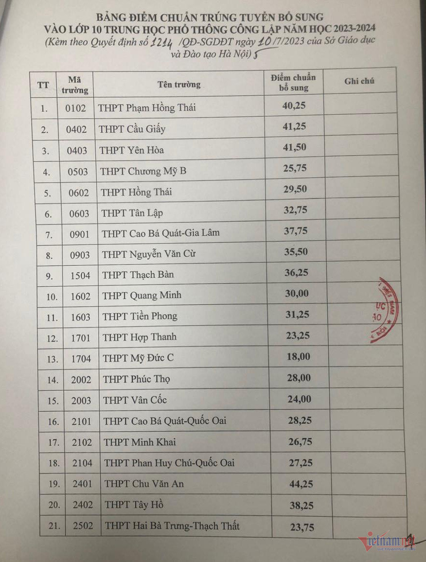 Trước đó, ngày 1/7, Sở GD-ĐT Hà Nội công bố điểm chuẩn trúng tuyển đợt 1 vào lớp 10 các trường THPT công lập không chuyên và trường THPT chuyên năm học 2023-2024.