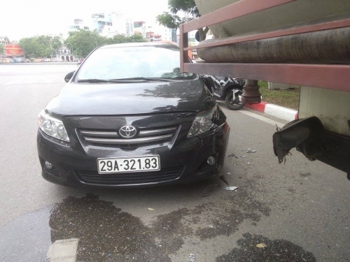 Cách đó chừng 20m, một vụ tai nạn nghiêm trọng cũng xảy ra cùng thời đểm. Một chiếc xe ô tô biển Hà Nội bất ngờ tông vào một chiếc xe bồn. Được biết, khi cua sang đường thì bất ngờ chiếc xe bị mất lái. Sau vụ tai nạn, chiếc ô tô 4 chỗ đã bị nát phần đầu.