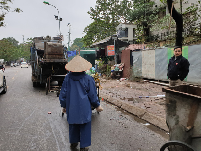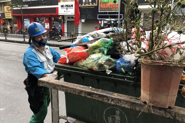 Sáng 4/2, trên đường Tôn Đức Thắng, quận Đống Đa, chúng tôi gặp chị Phạm Hằng (công nhân chi nhánh Urenco 4, Công ty TNHH MTV Môi trường Đô thị Hà Nội) đang oằn mình đẩy chiếc xe mà rác cao quá đầu người.