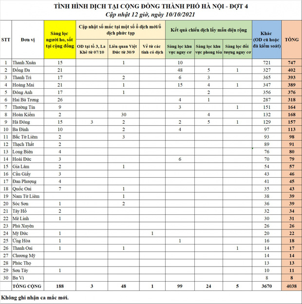 Từ 6h - 12h ngày 10/10, trên địa bàn thành phố Hà Nội không phát hiện trường hợp F0 mới. Cộng dồn trong đợt dịch thứ tư (từ ngày 27/4/2021), Hà Nội ghi nhận 4.038 ca mắc COVID-19, trong đó, ghi nhận ngoài cộng đồng 1.606 ca và đối tượng đã được cách ly là 2.432 ca.