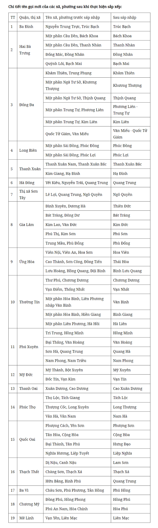 Sau sắp xếp các phường, 6 quận (Cầu Giấy, Ba Đình, Hai Bà Trưng, Đống Đa, Long Biên, Thanh Xuân) và thị xã Sơn Tây có đơn vị hành chính mới.