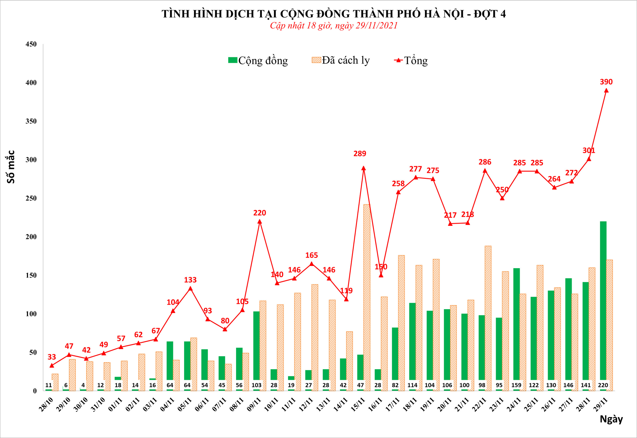 Đáng chú ý, chiều 29.11, Trung tâm Kiểm soát bệnh tật (CDC) Hà Nội cho biết, từ 18 giờ ngày 28.11 đến 18 giờ ngày 29.11 Hà Nội ghi nhận 390 ca bệnh, trong đó cộng đồng (220), khu cách ly (109), khu phong tỏa (61).