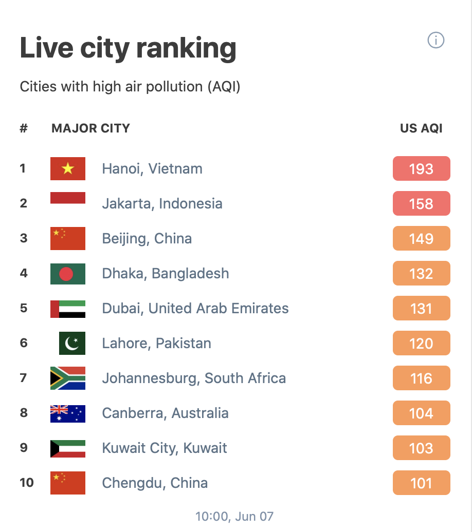 Theo ứng dụng đo chỉ số chất lượng không khí Airvisual, lúc 23h30 ngày 7/6, Hà Nội xếp mức ô nhiễm nhất thế giới với chỉ số AQI là 193. Xếp sau Hà Nội là thành phố Jakarta của Indonesia với AQI 158.