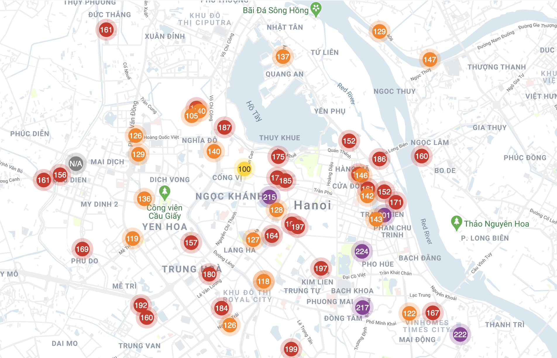 Tương tự, trên ứng dụng Pamair nhiều điểm chỉ số chất lượng không khí màu đỏ (xấu) và tím (rất xấu). Một số điểm ngưỡng tím (rất xấu) như khu vực Bà Triệu (Hai Bà Trưng, Hà Nội) AQI màu tím với chỉ số 224; Vĩnh Hưng (Hoàng Mai, Hà Nội) AQI 222; Đại La (Hai Bà Trưng, Hà Nội) AQI 217.