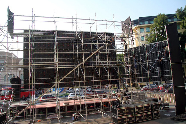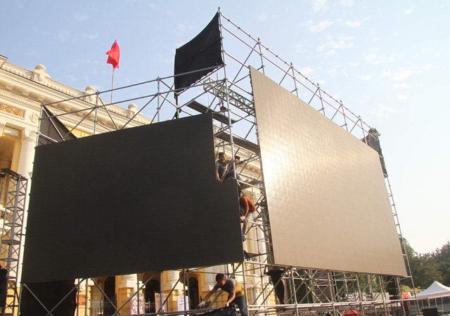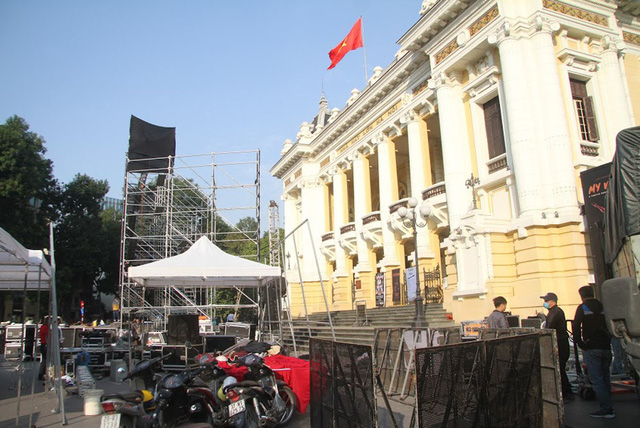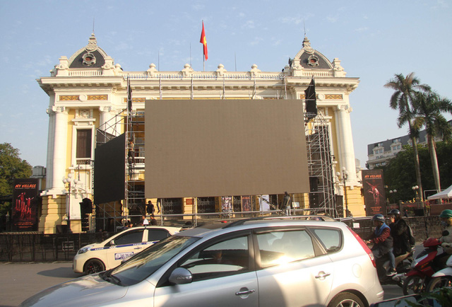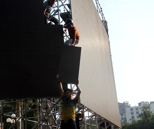 Theo ghi nhận, từ chiều ngày 9/12 tại khu vực quảng trường Nhà hát Lớn, rất đông đảo công nhân đang tiến hành lắp đặt hệ thống màn hình LED cỡ lớn, loa công suất lớn cũng như hệ thống đèn chiếu sáng để tiếp sóng trận đấu giữa đội tuyển U22 Việt Nam gặp U22 Indonesia vào hồi 19h tối nay.
