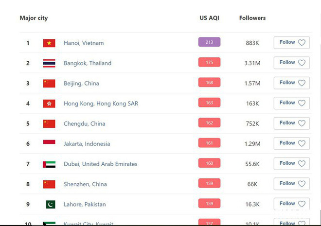 Sáng nay 30/9, chỉ số chất lượng không khí đã lên đến mức 288 chuyển sang màu tím tức nhóm nhạy cảm người già trẻ con và người bị bệnh hô hấp tránh ra ngoài. Những đối tượng khác hạn chế ra ngoài. Các ứng dụng đo thời tiết như Air Visual hay Pam Air, tất cả điểm quan trắc tại Hà Nội có chất lượng không khí AQI ở trên mức 170.