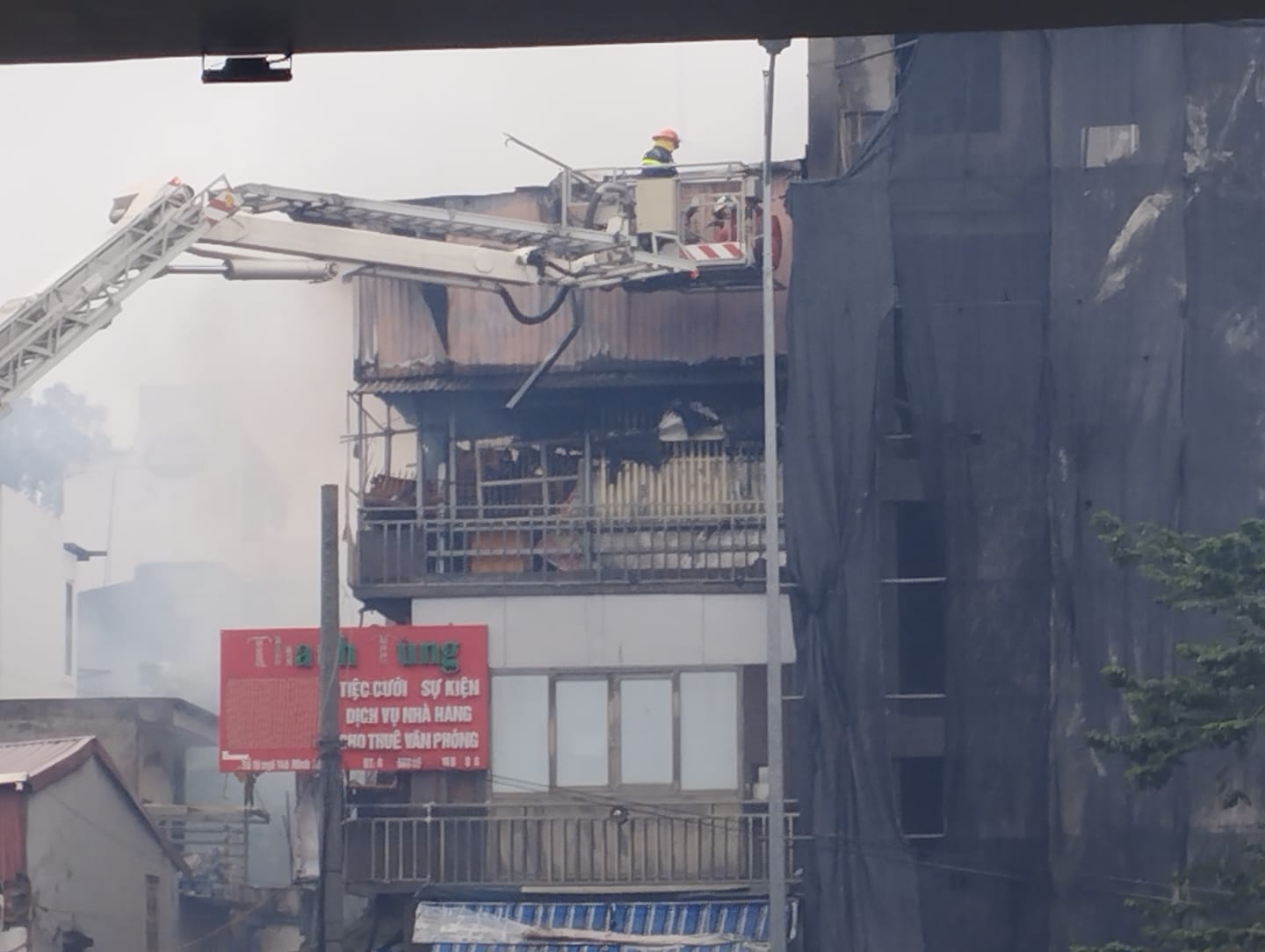 Tại hiện trường, đám cháy lan nhanh lên khu vực tầng thượng, chủ yếu là mái tôn và phá vỡ các kết cấu tạm một số nhà liền kề.