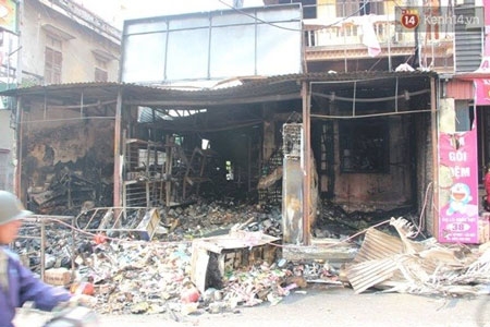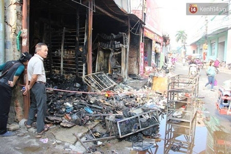 Ngọn lửa bùng phát từ cửa hàng kinh doanh sữa sau đó lan nhanh sang 2 cửa hàng giầy dép và quần áo bên cạnh khiến nhiều hàng hóa bị cháy rụi.